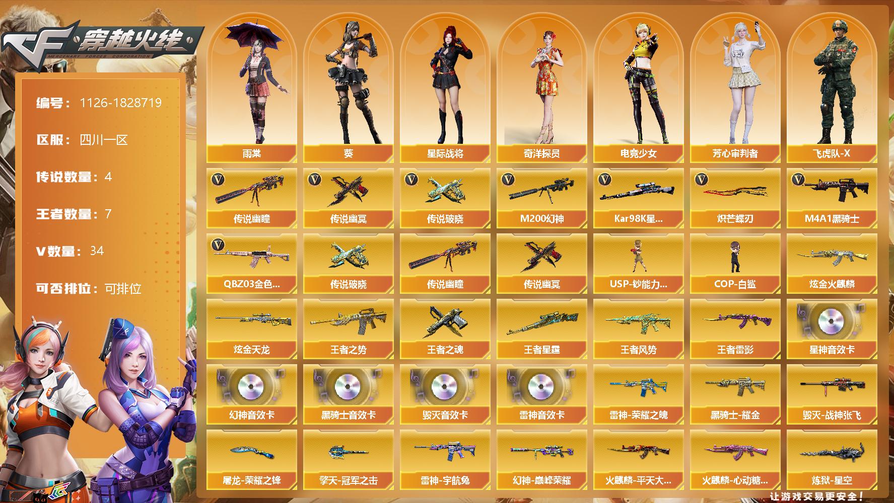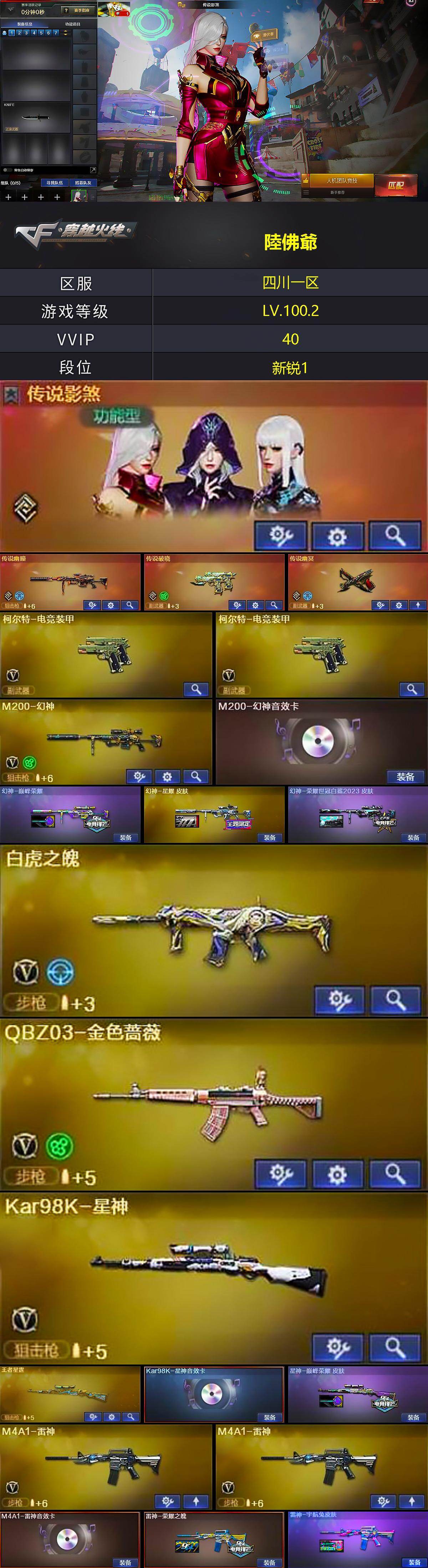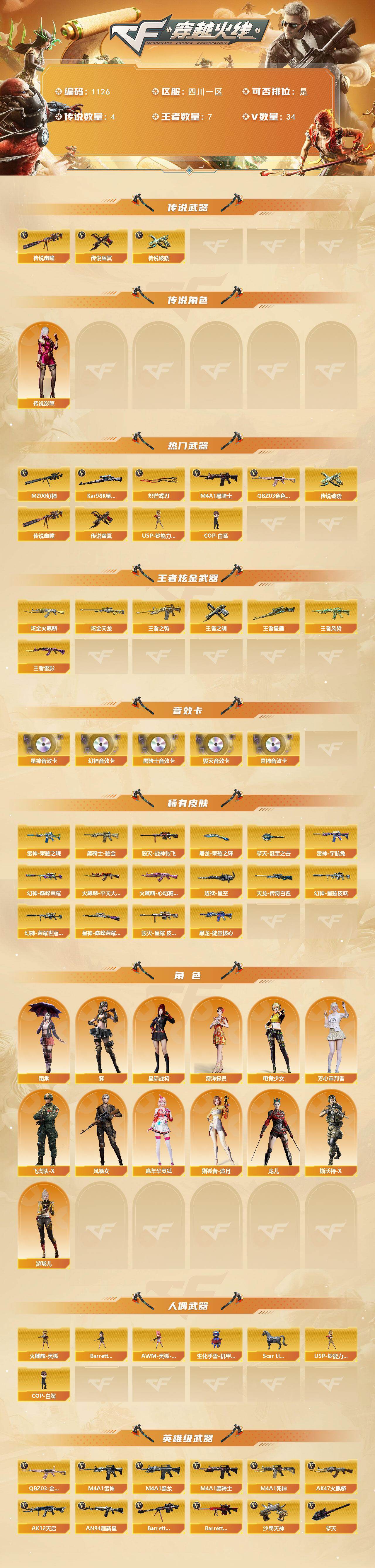 [14886266]四川一区-34V-7王者-2炫金 【传说武器】:传说幽瞳,传说破晓,传说幽冥 【传说角色】:传说影煞 【热门武器】:传说幽瞳,传说破晓,传说幽冥,QBZ03-金色蔷薇,M200-幻神,Kar98K-星神,M4A1-黑骑士,USP-钞能力灵狐,COP-白鲨,炽芒蝶刃*2 【王者炫金武器】:王者之势,王者风势,王者雷影,王者星霆,王者之魂,炫金火麒麟,炫金天龙 【音效卡】:M200-幻神音效卡,M