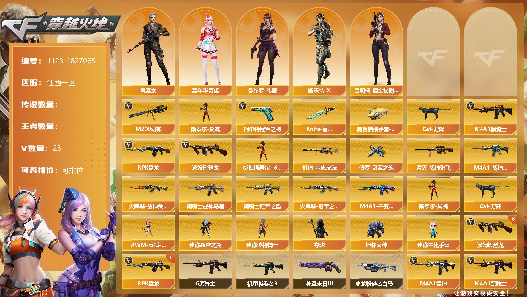 [14887097]江西一区-25V-0王者-0炫金 【热门武器】:M200-幻神,柯尔特-冠军之特,Cat-刀锋,M4A1-黑骑士*6,汤姆逊-烈龙*6,RPK-盘龙*6,斯泰尔-蝴蝶,Knife-冠军之刃,黄金猫猫手套-白鲨 【皮肤】:M200-幻神-黄忠皮肤,M4A1-战神赵云,火麒麟-冠军之心,火麒麟-战神关羽,毁灭-战神张飞,M4A1-千变-孔明皮肤,黑骑士-冠军之势,黑骑士-战神马超,修罗-冠军之魂