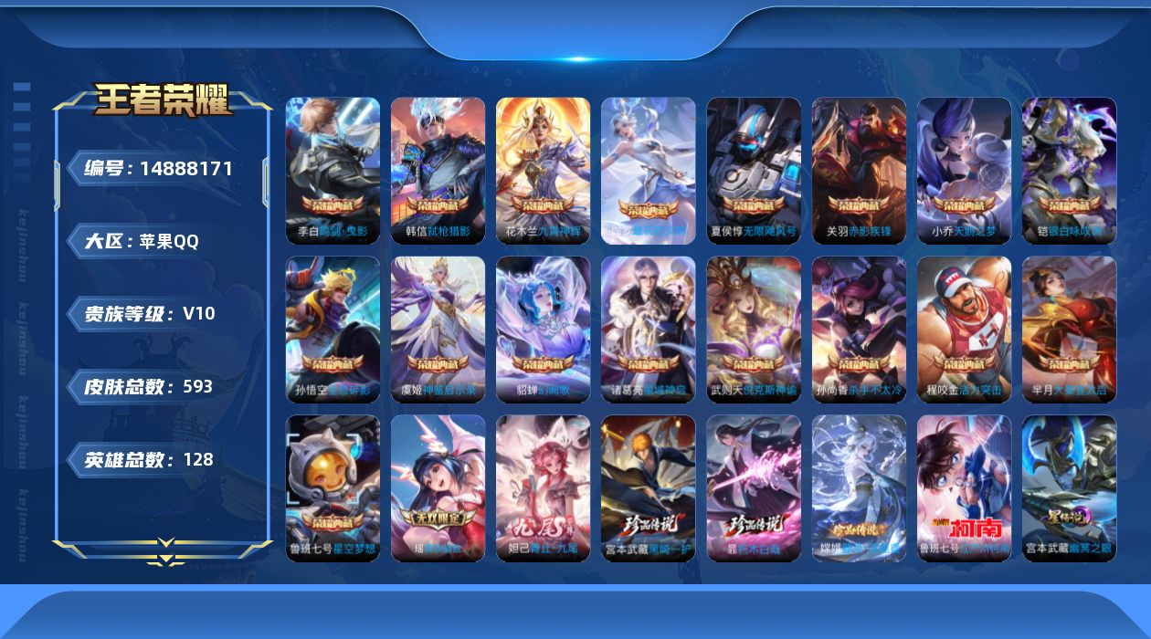 [14888171]【可二次 店主推荐捡漏号!可直接换绑】苹果Q-V10-最强王者段位-128英雄-593皮肤-17典藏皮肤-1典藏英雄-2无双-4珍品传说-88传说-199史诗