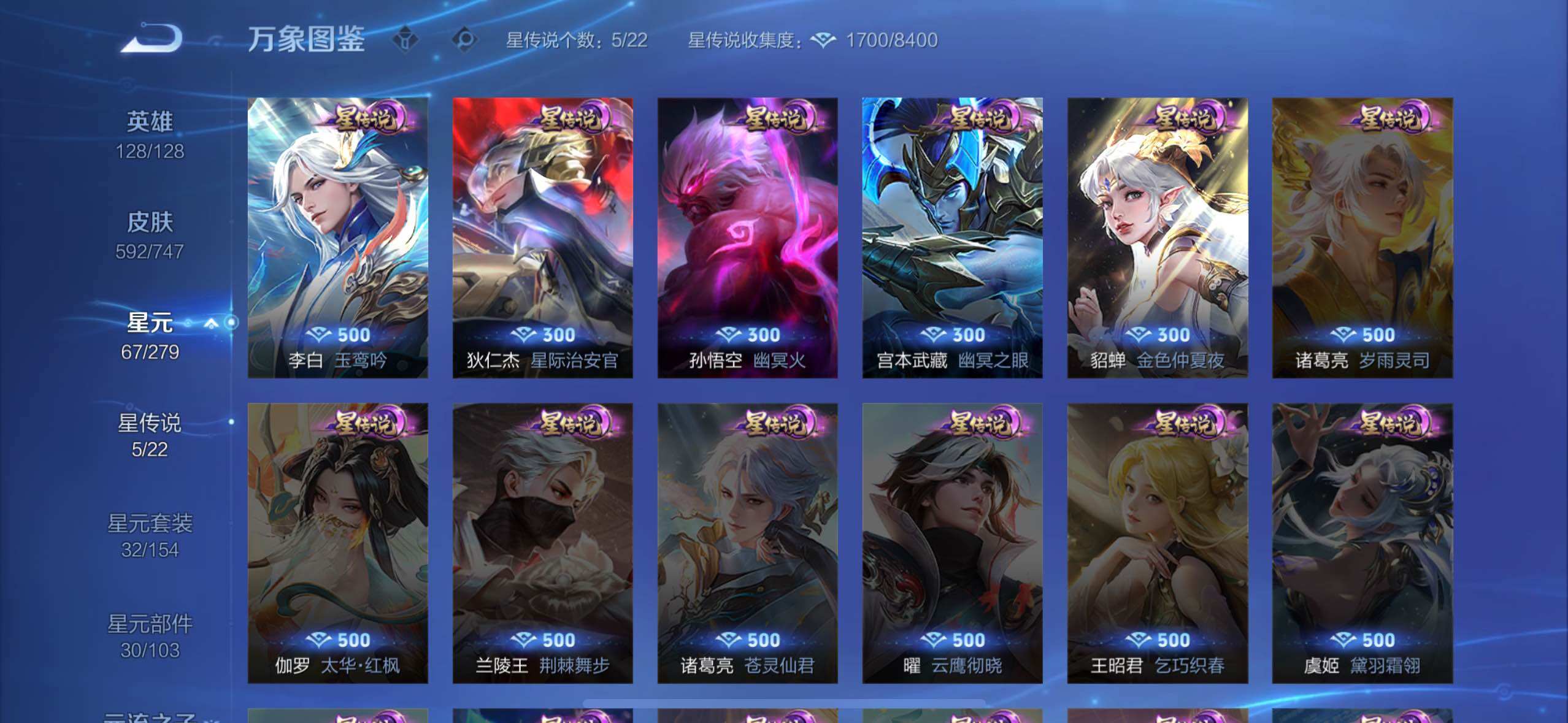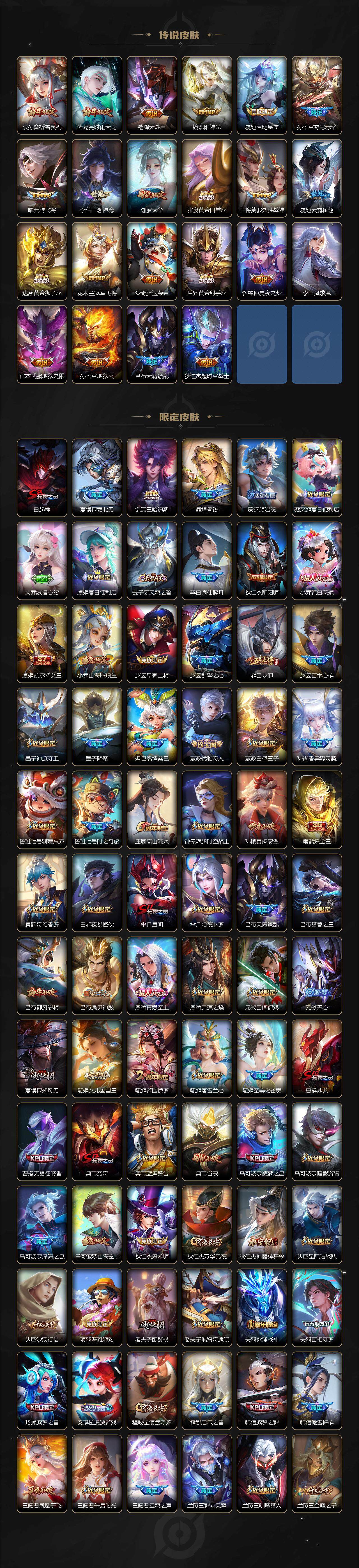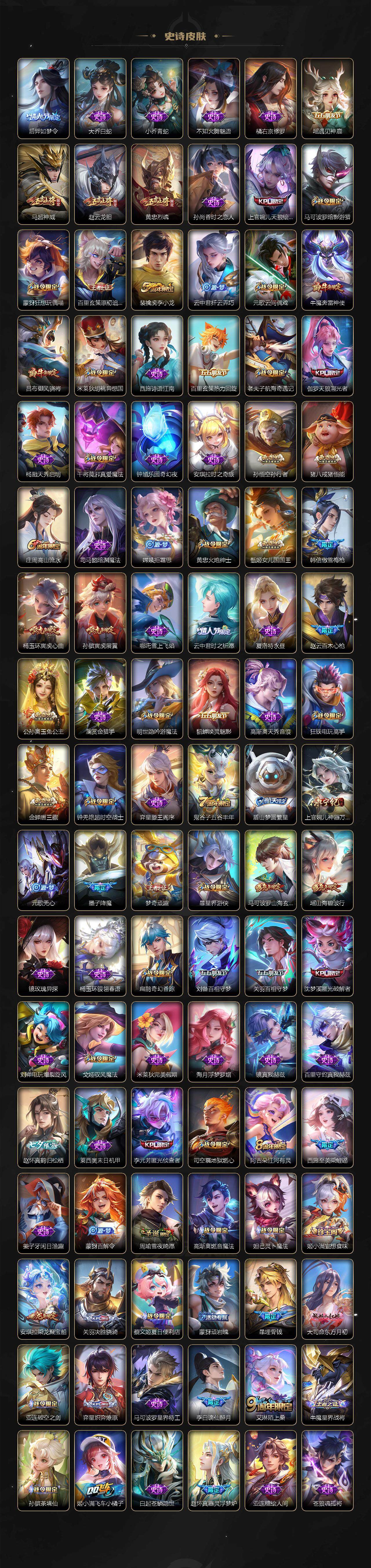 扁鹊炼金王,虞姬凯尔特女王,白起狰,太乙真人饕餮,曹操烛龙,芈月重明,典韦穷奇,狂铁御狮,米莱狄御霄,牛魔御旌,盾山御銮,夏侯惇朔风刀,明世隐疑决卦,老夫子醍醐杖,鬼谷子原初探秘者,狄仁杰万华元夜,程咬金演武夺筹,钟馗驱傩正仪,苏烈千军破阵,吕布猎兽之王,嬴政白昼王子,女娲朔望之晖,典韦蓝屏警告,钟馗神迹守卫,鲁班七号狮舞东方,沈梦溪星空之诺,李元芳银河之约,马可波罗暗影游猎,蒙犽狂想玩偶喵,元歌云间偶戏,弈星混沌棋,达摩沙漠行僧,兰陵王金庭之子,沈梦溪大漠名商,李元芳云中旅人,桑启海盐诗旅,裴擒虎擒涛扼浪,鲁班大师探海日志,张良古海寻踪,项羽苍威无极