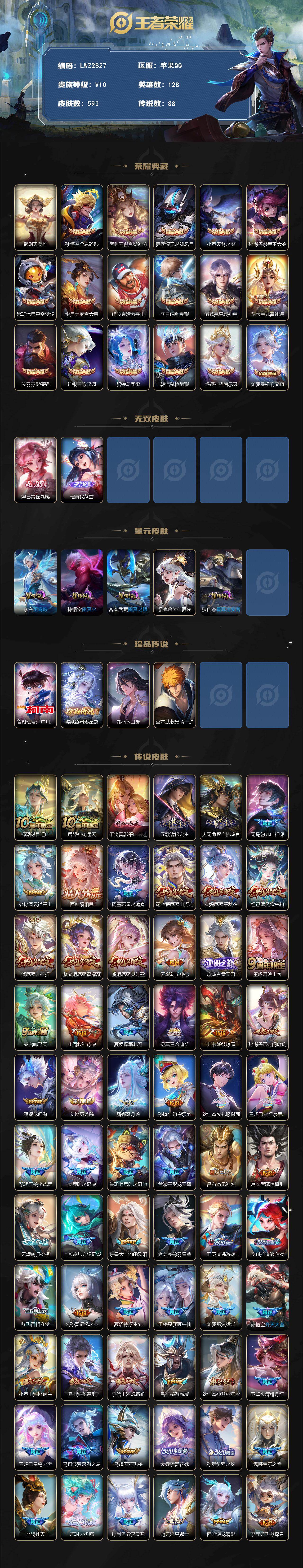 [14888171]【可二次 店主推荐捡漏号!可直接换绑】苹果Q-V10-最强王者段位-128英雄-593皮肤-17典藏皮肤-1典藏英雄-2无双-4珍品传说-88传说-199史诗 【英雄全皮】:嬴政全皮,白起全皮,元歌全皮,典韦全皮,宫本武藏全皮,狄仁杰全皮,达摩全皮,司马懿全皮,姜子牙全皮,孙权全皮,孙悟空全皮,钟馗全皮,杨玉环全皮,苍全皮,女娲全皮,鬼谷子全皮,苏烈全皮,狂铁全皮,米莱狄全皮,李信全皮,盾山全皮,猪八戒全皮,大司命全皮,西施全皮,夏洛特全皮,司空震全皮,云缨全皮,金蝉全皮,暃全皮,赵怀真全皮,莱西奥全皮,戈娅全皮,空空儿全皮,影全皮 【荣耀典藏】:武则天英雄,孙悟空全息碎影,武则天倪克斯神谕,夏侯惇无限飓风号,小乔天鹅之梦,孙尚香杀手不太冷,鲁班七号星空梦想,芈月大秦宣太后,程咬金活力突击,李白鸣剑曳影,诸葛亮星域神启,花木兰九霄神辉,关羽赤影疾锋,铠银白咏叹调,貂蝉幻阙歌,韩信弑枪猎影,虞姬神鉴启示录,伽罗最初的交响 【无双皮肤】:妲己青丘九尾,瑶真我赫兹 【珍品传说】:鲁班七号江户川柯南,嫦娥器灵落星盏,暃朽木白哉,宫本武藏黑崎一护 【传说皮肤】:杨戬纵目迁山,后羿神树通天,干将莫邪千山共赴,元歌诡秘之主,大司命死亡执政官,司马懿九山相柳,公孙离云诺千山,西施续相思,杨玉环星之鸣奏,司空震愿照山河定,女娲愿照千秋盛,妲己愿照众生和,澜愿照九州拓,蔡文姬愿照福禄聚,虞姬愿照岁时盈,云缨幻光神枪,嬴政玄雷天君,王昭君映山客,桑启鸣野蒿,庄周牧神诗旅,夏侯惇霜北刀,铠冥王哈迪斯,典韦战鼓燎原,孙尚香乘龙问璇玑,澜逐花归海,艾琳觅芳踪,露娜霜月吟,孙膑小动物乐团,狄仁杰夜礼服假面,王昭君永恒水手月亮,甄姬至美化雀舞,大乔时之奇旅,鲁班七号时之奇旅,兰陵王影龙天霄,吕布遇见神鼓,宫本武藏惊梅引,云缨鹤归松栖,上官婉儿妄想奇谈,东皇太一灼幽烈阳,诸葛亮鹤羽星尊,亚瑟追逃游戏,安琪拉追逃游戏,张飞百相守梦,公孙离记忆之芯,夏洛特浮生妄,干将莫邪画中仙,伽罗炽翼辉光,孙悟空齐天大圣,小乔山海琳琅生,曜山海苍雷引,李信山海炽霜斩,吕布怒海麟威,狄仁杰神器狴犴令,不知火舞绯月行,王昭君星穹之声,马可波罗深海之息,马超无双飞将,大乔挚爱花嫁,孙策挚爱之约,露娜启示之音,女娲补天,瑶时之祈愿,孙尚香异界灵契,赵云淬星耀世,西施游龙清影,李元芳飞鸢探春,公孙离祈雪灵祝,诸葛亮时雨天司,
