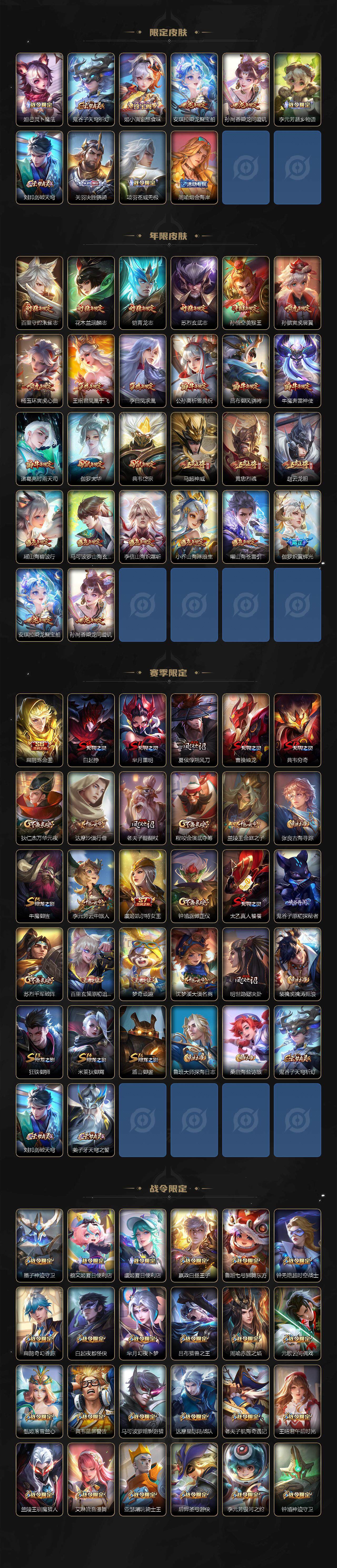 关羽冰锋战神,裴擒虎李小龙,上官婉儿梁祝,牛魔奔雷神使,貂蝉逐梦之音,公孙离祈雪灵祝,吕布御风骁将,诸葛亮时雨天司,赵云龙胆,黄忠烈魂,马超神威,典韦岱宗,伽罗太华,曹操天狼征服者,裴擒虎天狼狩猎者,上官婉儿天狼绘梦者,伽罗天狼溯光者,马可波罗逐梦之星,韩信逐梦之影,铠青龙志,花木兰瑞麟志,苏烈玄武志,百里守约朱雀志,王昭君凤凰于飞,小乔纯白花嫁,周瑜真爱至上,孙悟空大圣娶亲,后羿如梦令,孙悟空至尊宝,妲己热情桑巴,干将莫邪冰霜恋舞曲,赵云引擎之心,孙悟空美猴王,猪八戒猪悟能,孙尚香异界灵契,孙悟空孙行者,甄姬女儿国国王,韩信傲雪梅枪,孙膑寅虎·展翼,杨玉环寅虎·心曲,云中君时之祈愿,瑶时之祈愿,女娲补天,赵云百木心枪,公孙离玉兔公主,露娜启示之音,马可波罗深海之息,金蝉唐三藏,王昭君星穹之声,不知火舞绯月行,上官婉儿神器·万象笔,盾山梦圆繁星,墨子降魔,马可波罗山海·玄木吟,瑶山海·碧波行,兰陵王影龙天霄,西施至美·乘鲤谣,甄姬至美·化雀舞,夏侯惇霜北刀,桑启鸣野蒿,艾琳陌上桑,王昭君映山客,澜愿照·九州拓,蔡文姬愿照·福禄聚,虞姬愿照·岁时盈,司空震愿照·山河定,妲己愿照·众生和,女娲愿照·千秋盛