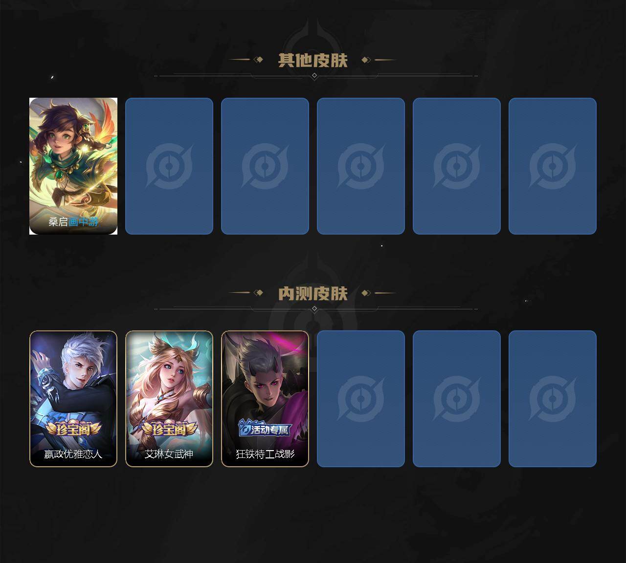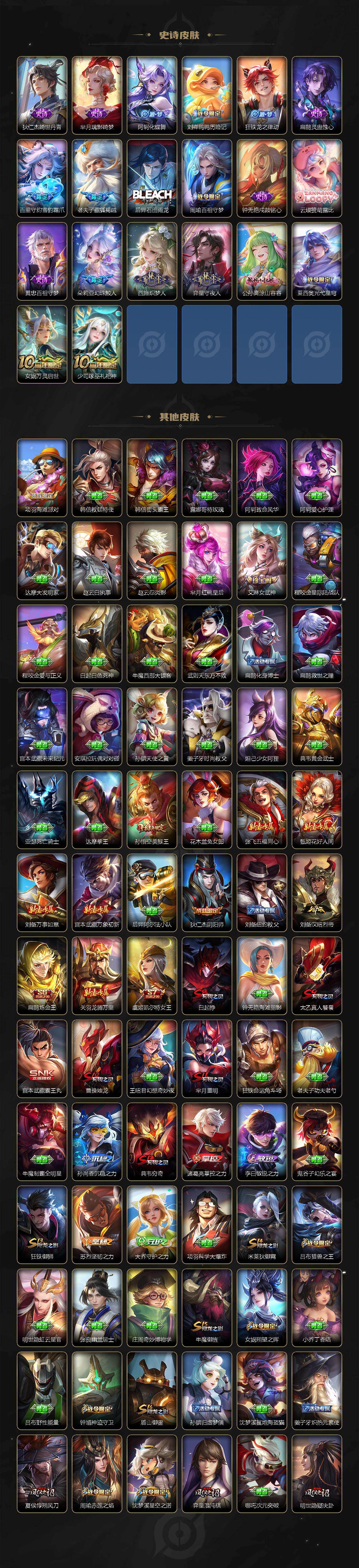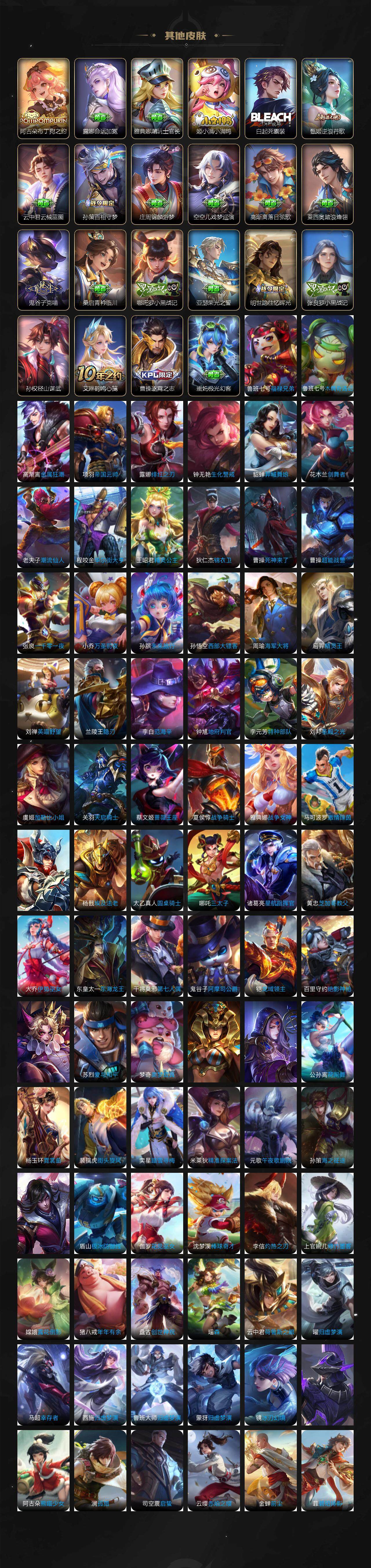 小乔青蛇,大乔白蛇,瑶遇见神鹿,娜可露露晚萤,伽罗箭羽风息,李元芳逐浪之夏,不知火舞魅语,公孙离无限星赏官,大乔猫狗日记,孙策猫狗日记,阿轲节奏热浪,露娜紫霞仙子,诸葛亮黄金分割率,王昭君偶像歌手,韩信白龙吟,项羽苍穹之光,孙尚香时之恋人,阿轲暗夜猫娘,雅典娜冰冠公主,吕布末日机甲,鲁班七号电玩小子,橘右京修罗,墨子龙骑士,嬴政摇滚巨星,刘禅绅士熊喵,刘禅天才门将,白起星夜王子,安琪拉心灵骇客,安琪拉时之奇旅,程咬金功夫厨神,刘邦德古拉伯爵,兰陵王暗隐猎兽者,曹操幽灵船长,宫本武藏鬼剑武藏,司马懿暗渊魔法,亚瑟心灵战警,钟馗乐园奇幻夜,杨戬天秀·启明,蔡文姬舞动绿茵,廉颇地狱岩魂,西施诗语江南,小乔缤纷独角兽,夏侯惇乘风破浪,花木兰水晶猎龙者,铠曙光守护者,百里玄策热力回旋,墨子金属风暴,百里玄策原初追逐者,吕布圣诞狂欢,貂蝉圣诞恋歌,百里守约特工魅影,嬴政暗夜贵公子,嫦娥拒霜思,李白千年之狐,哪吒雪上飞焰,夏洛特永昼,澜赏金猎手,貂蝉唤灵魅影,高渐离天秀·音浪,弈星滕王阁序,镜玫瑰异探,杨玉环银翎春语,刘备百相守梦,关羽百相守梦,沈梦溪匿光破解者,刘禅电玩·爆裂旋风,海月浮梦罗烟,镜真我赫兹,百里守约真我赫兹,赵怀真鹤归松栖,莱西奥末日机甲,李元芳匿光侦查者,姜子牙闲日渔趣,蒙犽百解令,周瑜雪夜绮愿,高渐离燃音魔法,安琪拉乘龙·聚宝船,关羽决胜骁骑,李白谪仙醉月,姬小满飞车小橘子,白起苍鳞隐世,赵怀真器灵·浮梦炉,亚连糖绘人间,苍狼魂孤将,狄仁杰绮世丹青