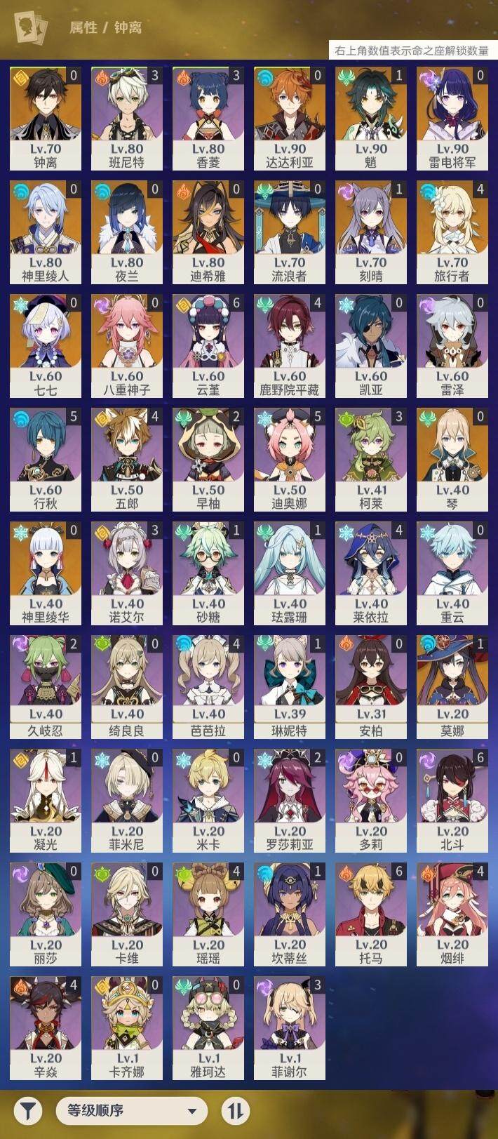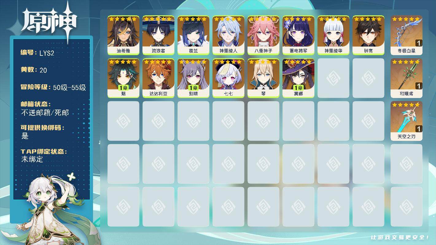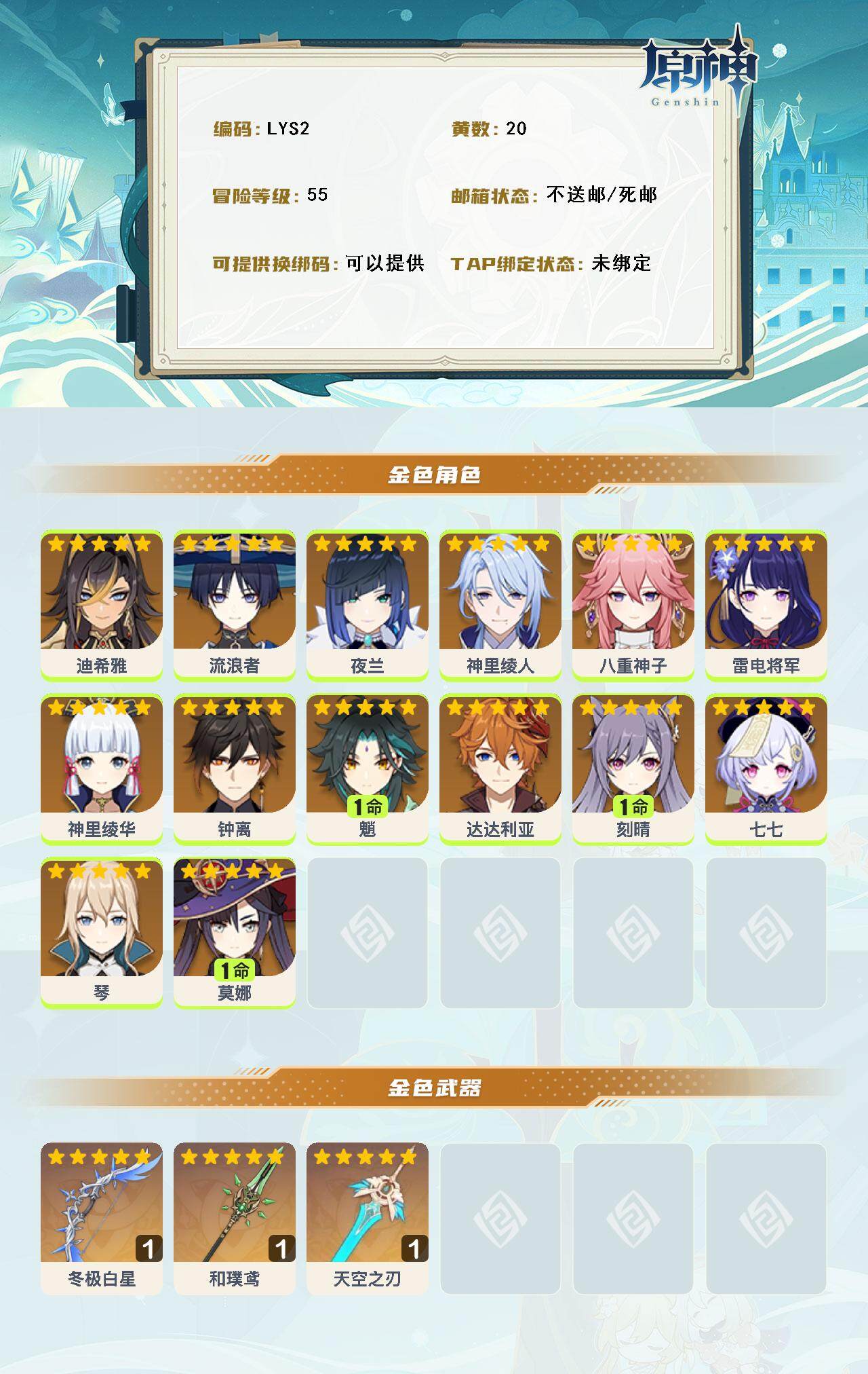 [14888178]55级/20黄/女主/14个五星角色/3个五星武器 0命迪希雅,0命流浪者,0命夜兰,0命神里绫人,0命八重神子,0命雷电将军,0命神里绫华,0命钟离,1命魈,0命达达利亚,1命刻晴,0命七七,0命琴,1命莫娜,精1冬极白星,精1和璞鸢,精1天空之刃