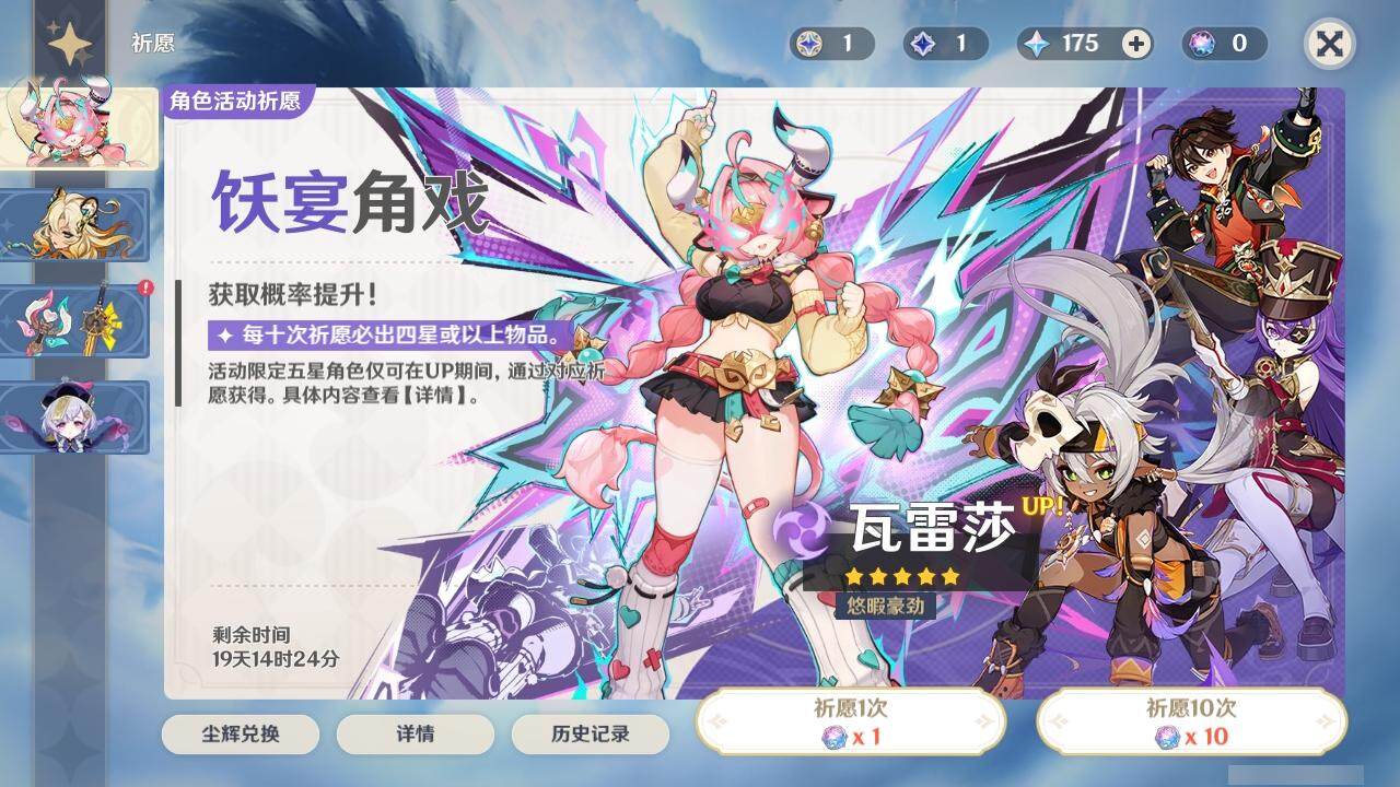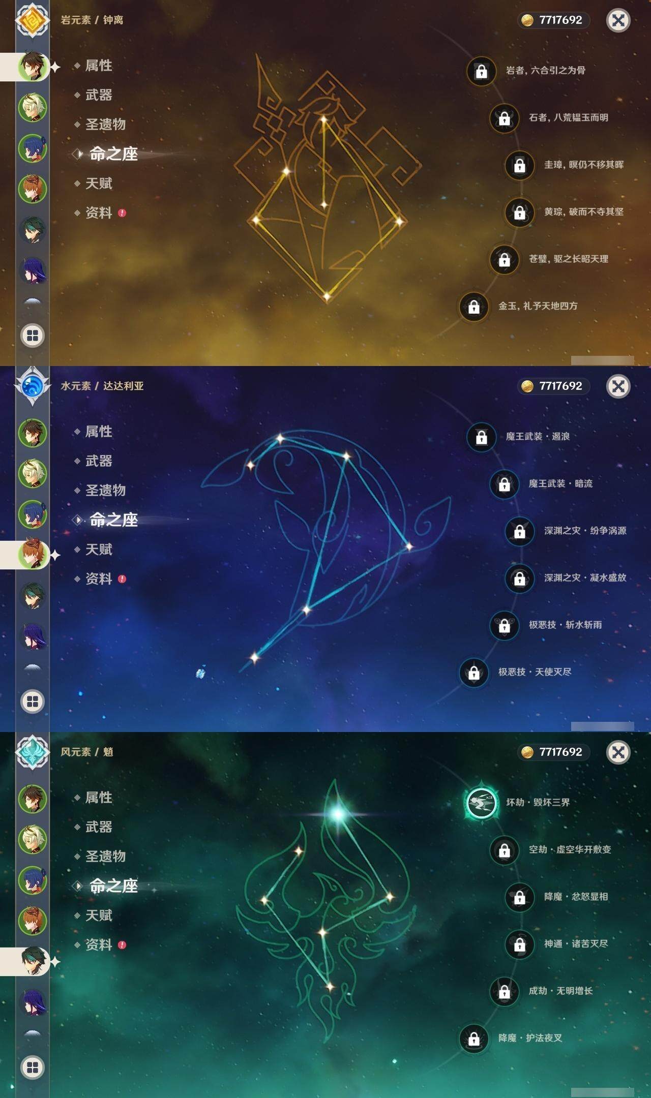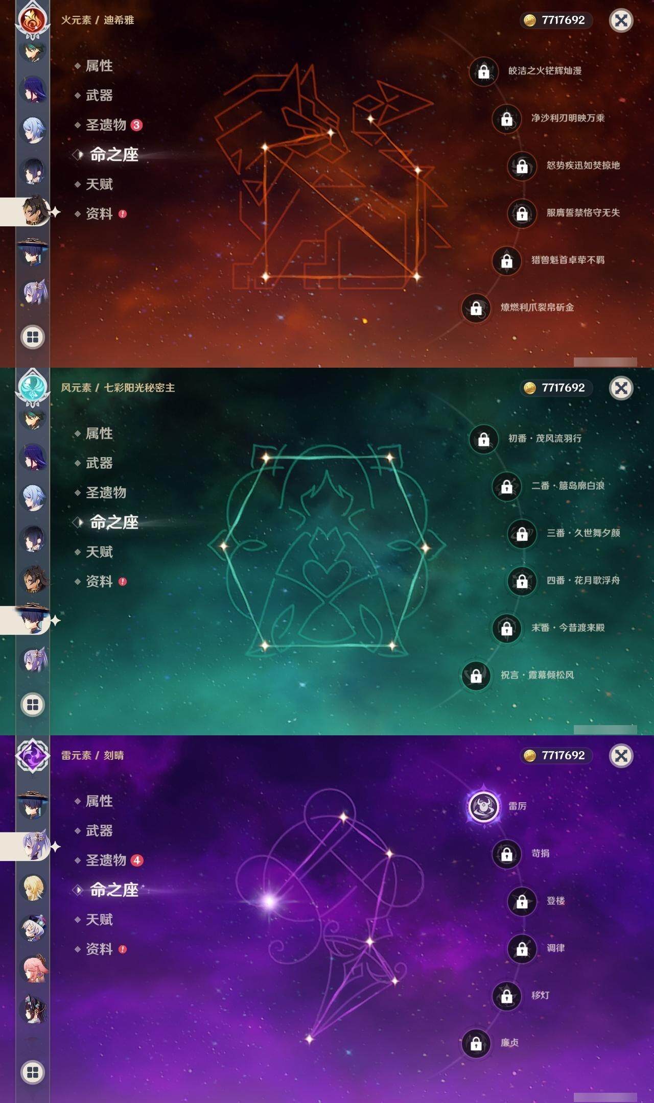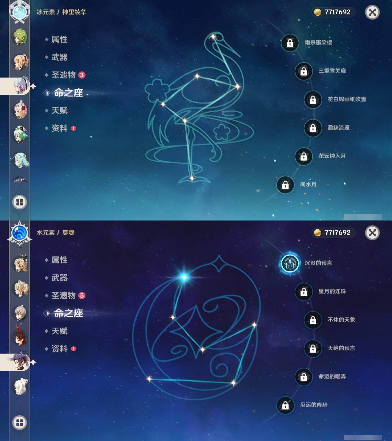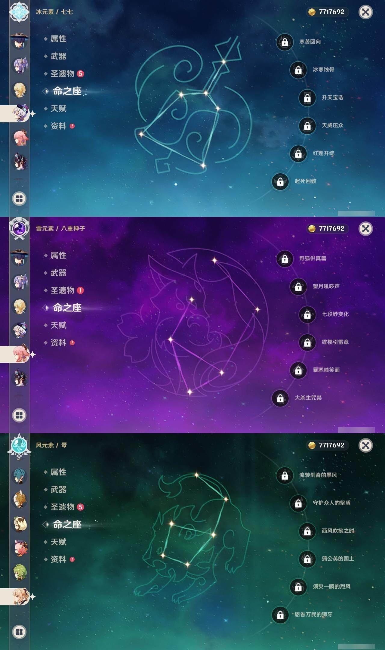0命迪希雅,0命流浪者,0命夜兰,0命神里绫人,0命八重神子,0命雷电将军,0命神里绫华,0命钟离,1命魈,0命达达利亚,1命刻晴,0命七七,0命琴,1命莫娜,精1冬极白星,精1和璞鸢,精1天空之刃