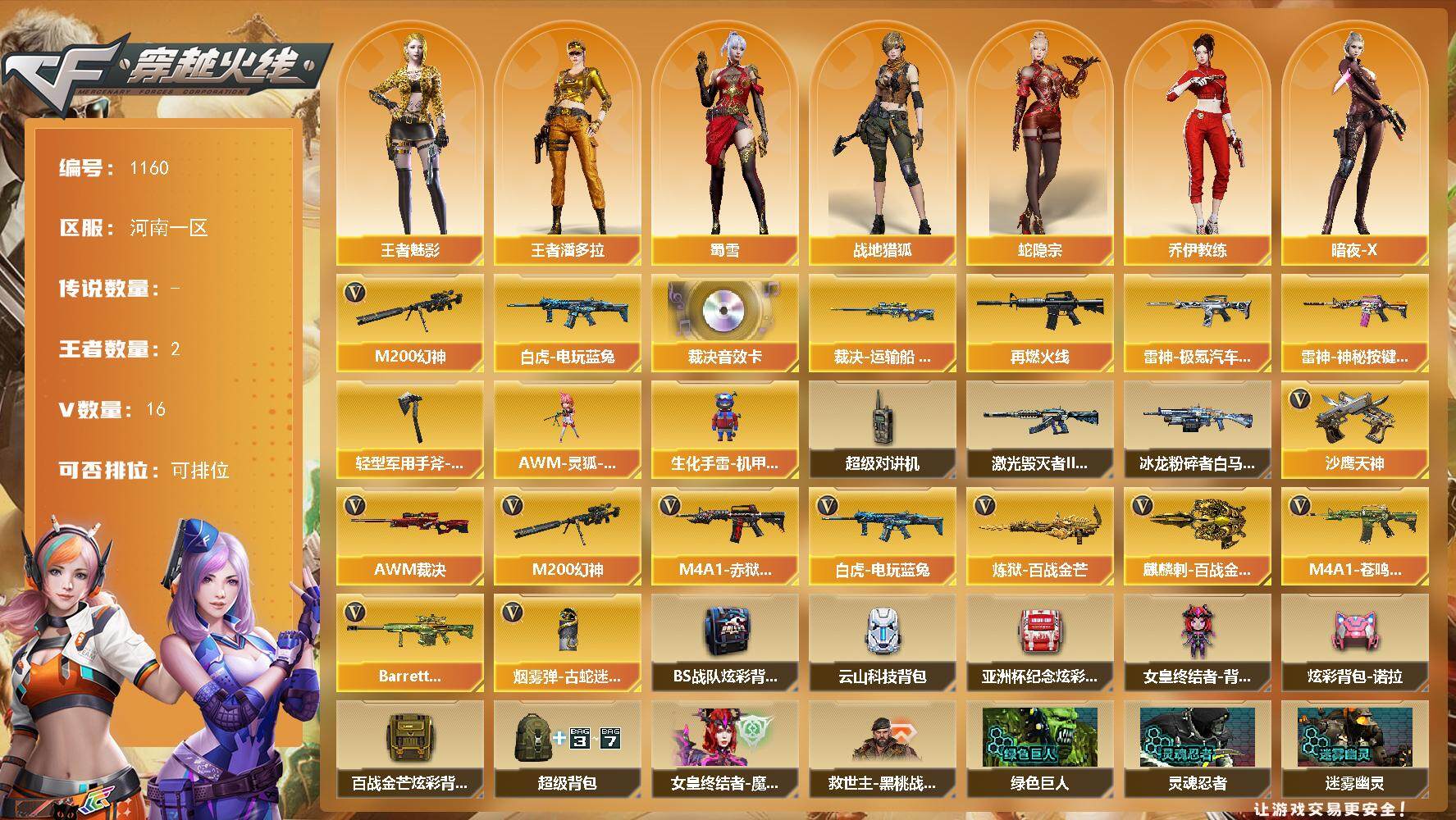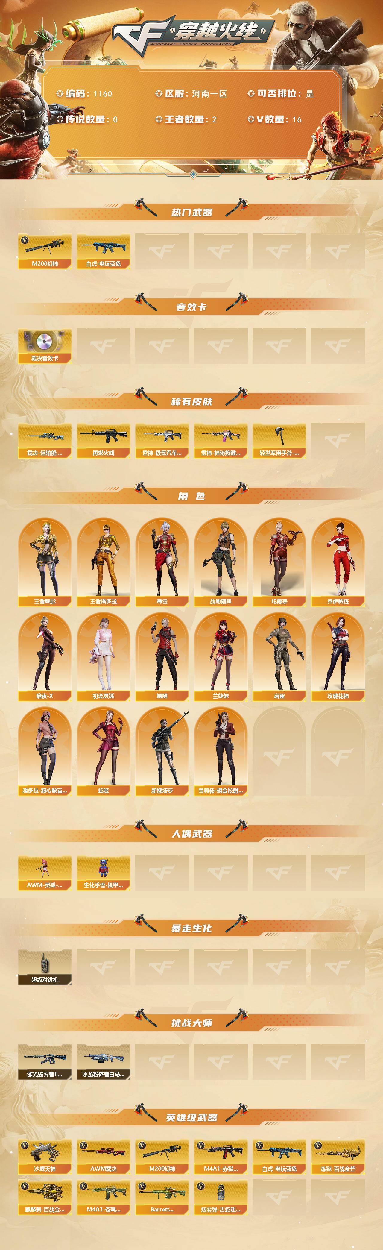[14888315]河南一区-16V-2王者-0炫金 【热门武器】:M200-幻神,白虎-电玩蓝兔 【音效卡】:AWM-裁决音效卡 【皮肤】:裁决-运输船 皮肤,M4A1-再燃火线,雷神-极氪汽车 皮肤,雷神-神秘按键 皮肤,轻型军用手斧-再燃火线 【角色】:战地猎狐,王者-魅影,王者潘多拉,蛇隐宗,乔伊教练,暗夜-X,初恋灵狐,娟娟,兰妹妹,麻雀,玫瑰花神,潘多拉-甜心教官,蛇姬,蜀雪,新娜塔莎,雪莉杨-摸金校尉 【人偶武器】:AWM-灵狐-15周年嘉年华,生化手雷-机甲核心 【暴走生化】:超级对讲机 【挑战大师】:冰龙粉碎者-白马银枪,激光毁灭者III-白马银枪 【英雄级武器】:白虎-电玩蓝兔,AWM-裁决,M200-幻神,炼狱-百战金芒,沙鹰-天神*2,麒麟刺-百战金芒,烟雾弹-古蛇迷踪,M4A1-赤狱骑士,M4A1-苍鸣雷神,Barrett-碧霄极光 【道具】:BS战队炫彩背包,云山科技背包,亚洲杯纪念炫彩背包,女皇终结者-背包,炫彩背包-诺拉,百战金芒炫彩背包,超级背包,女皇终结者-魔龙之吻,救世主-黑桃战神,黄金生化钩,绿色巨人,灵魂忍者,迷雾幽灵,夺命之镰,防化服*3,语音特效-盛典烟火,萌萌小葵表情,动感闪耀表情,防弹头盔*3,防弹衣*3,C4工具钳*3,手雷包*3 【特殊枪械】: