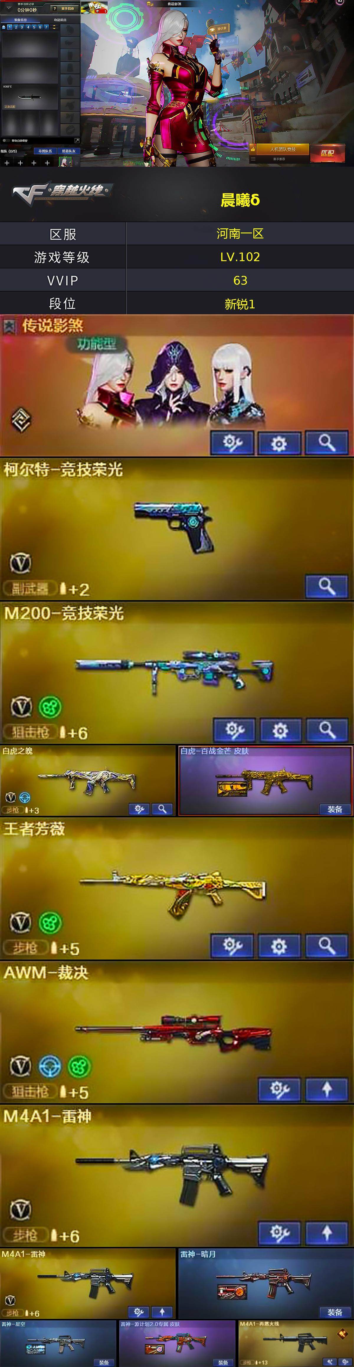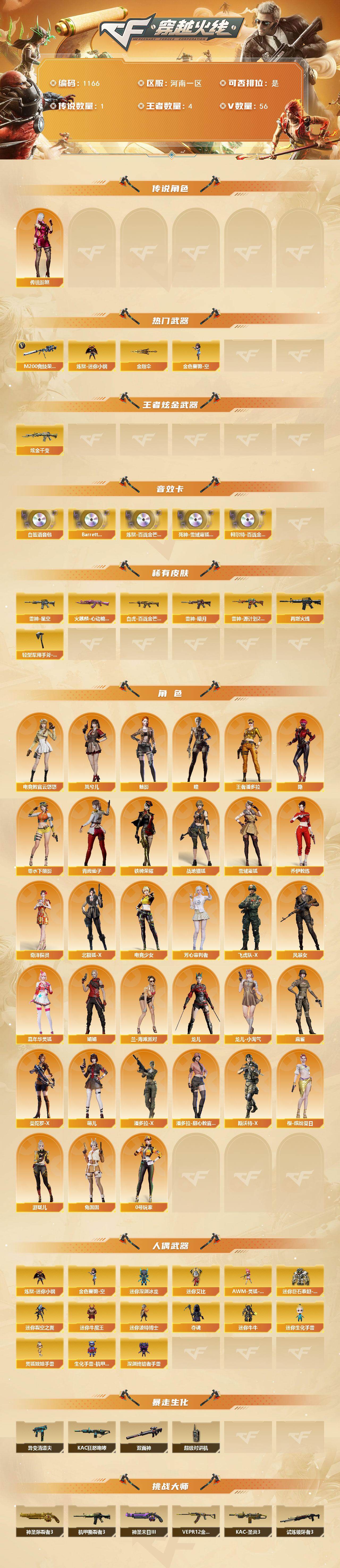 [14888443]河南一区-56V-4王者-1炫金 【传说角色】:传说影煞 【热门武器】:M200-竞技荣光,炼狱-迷你小钢,金色蔷薇-空,金刚伞 【王者炫金武器】:炫金千变 【音效卡】:白鲨语音包,Barrett-碧霄极光音效卡,炼狱-百战金芒-庆典舞曲音效卡,死神-雪域霜狐-怀旧音效卡,柯尔特-百战金芒-庆典舞曲音效卡 【皮肤】:白虎-百战金芒 皮肤,雷神-暗月,雷神-星空,雷神-源计划2.0专属 皮肤,M
