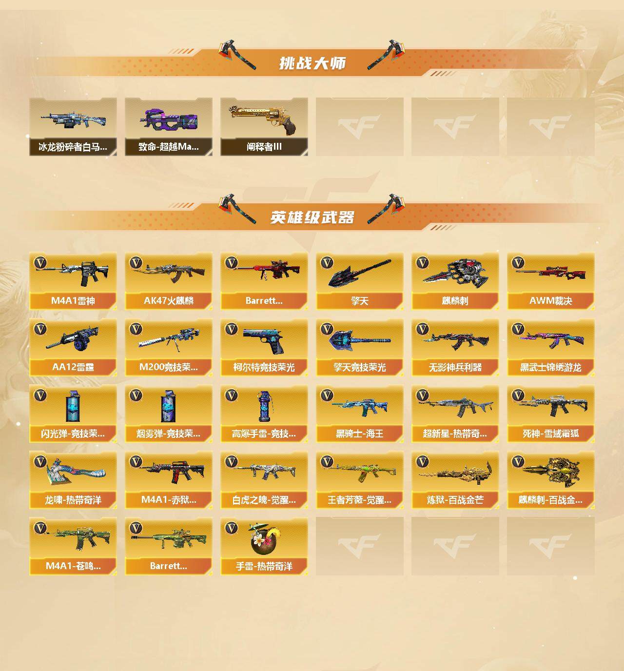 【热门武器】:M200-竞技荣光,炼狱-迷你小钢,金色蔷薇-空,金刚伞