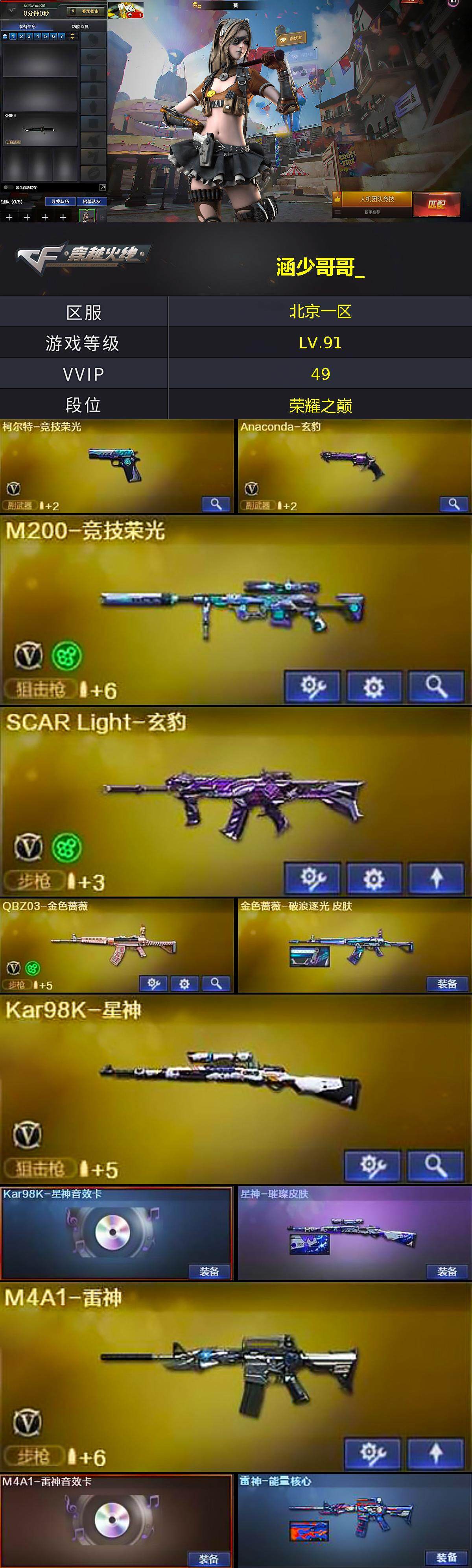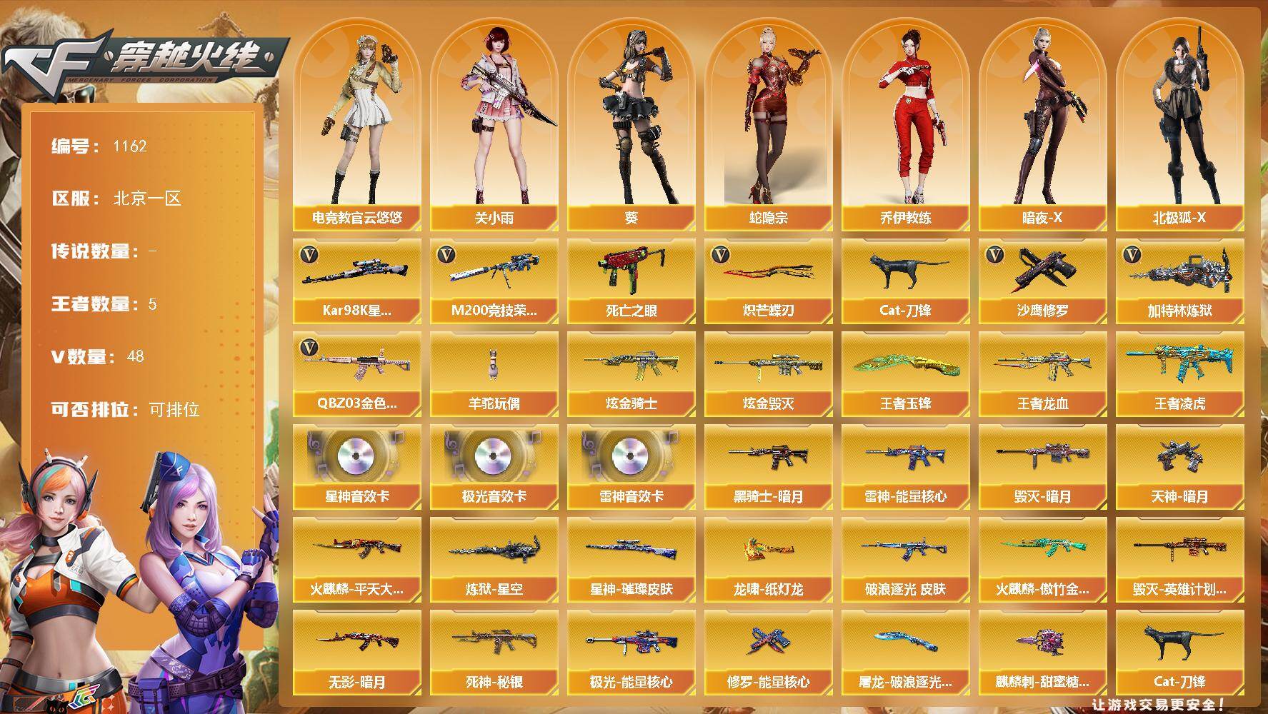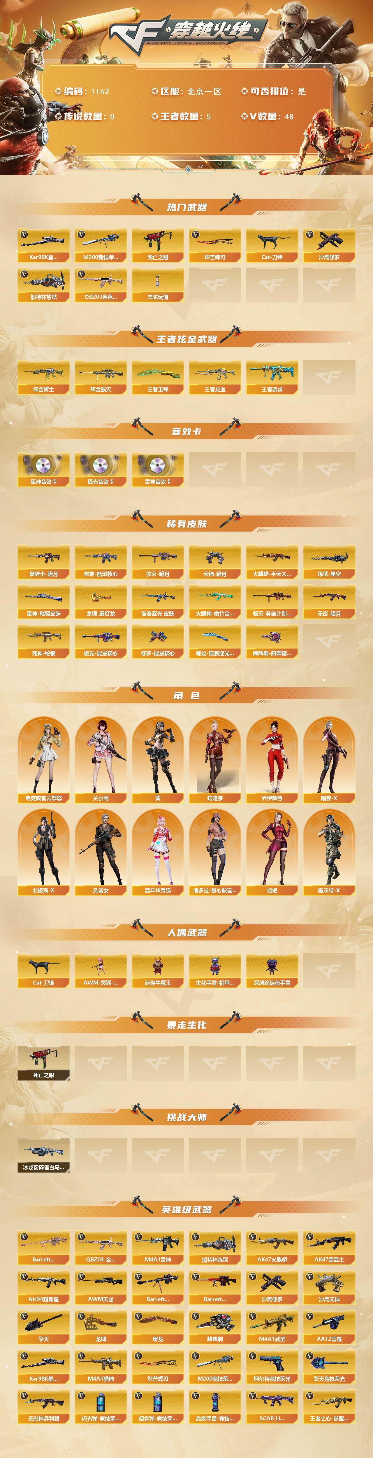 [14888543]北京一区-48V-5王者-2炫金 【热门武器】:QBZ03-金色蔷薇,M200-竞技荣光,死亡之眼,Kar98K-星神,Cat-刀锋,加特林-炼狱,羊驼玩偶*2,沙鹰-修罗*2,炽芒蝶刃 【王者炫金武器】:王者龙血,王者凌虎,王者玉锋,炫金骑士,炫金毁灭 【音效卡】:M4A1-雷神音效卡,Barrett-极光音效卡,Kar98K-星神音效卡 【皮肤】:金色蔷薇-破浪逐光 皮肤,星神-璀璨皮肤,