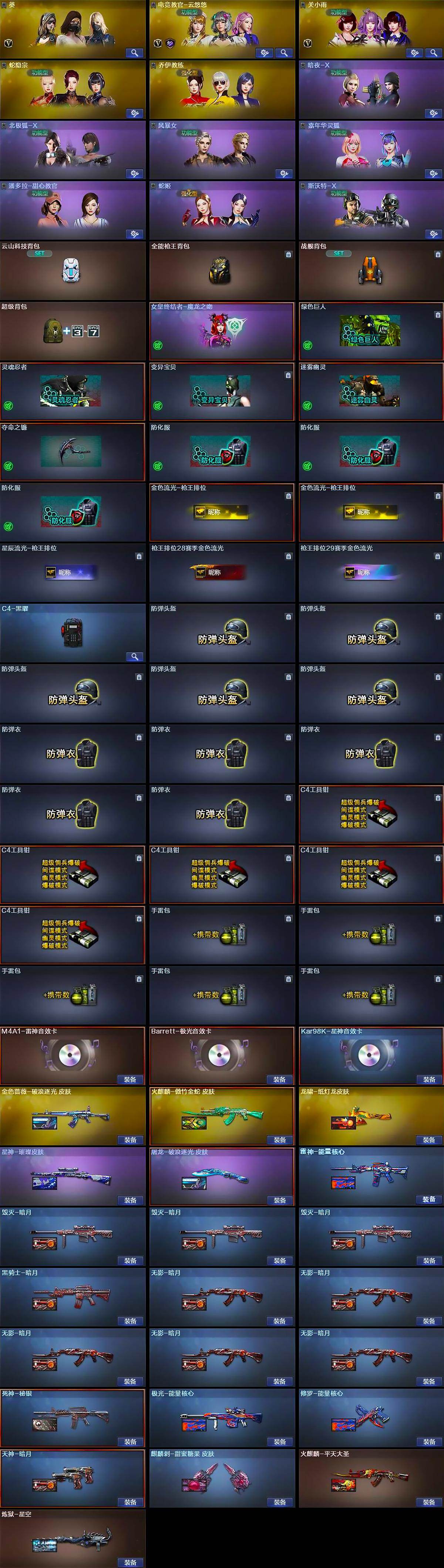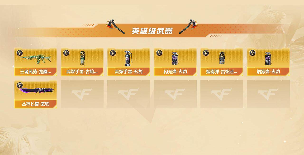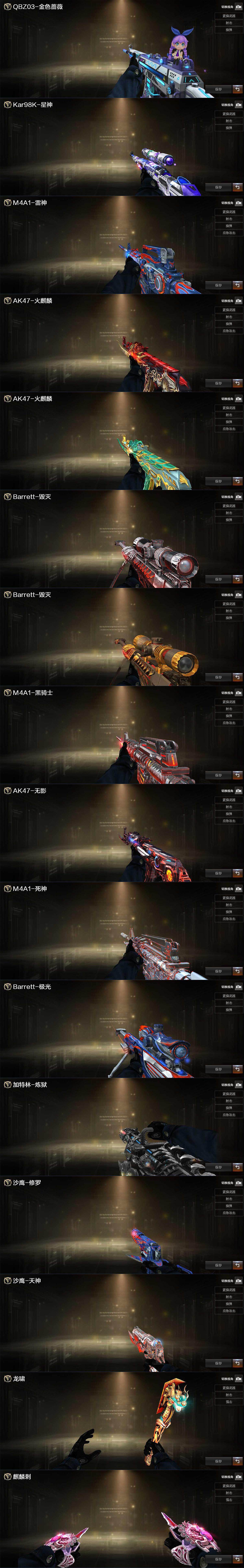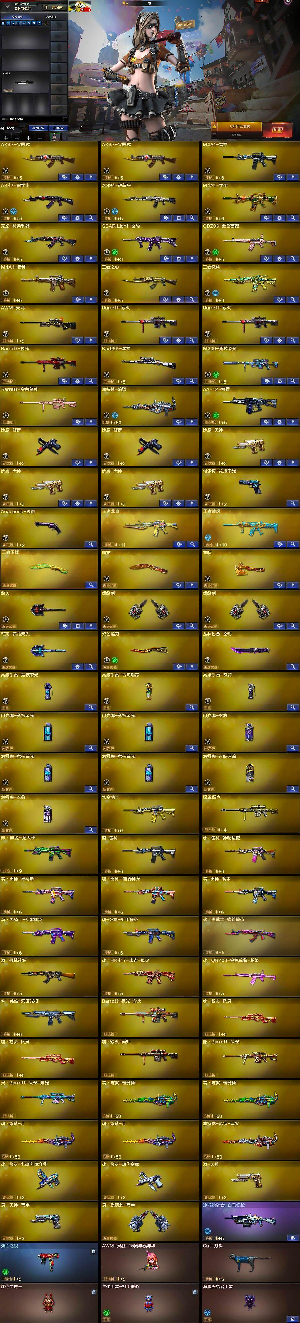 【热门武器】:QBZ03-金色蔷薇,M200-竞技荣光,死亡之眼,Kar98K-星神,Cat-刀锋,加特林-炼狱,羊驼玩偶*2,沙鹰-修罗*2,炽芒蝶刃