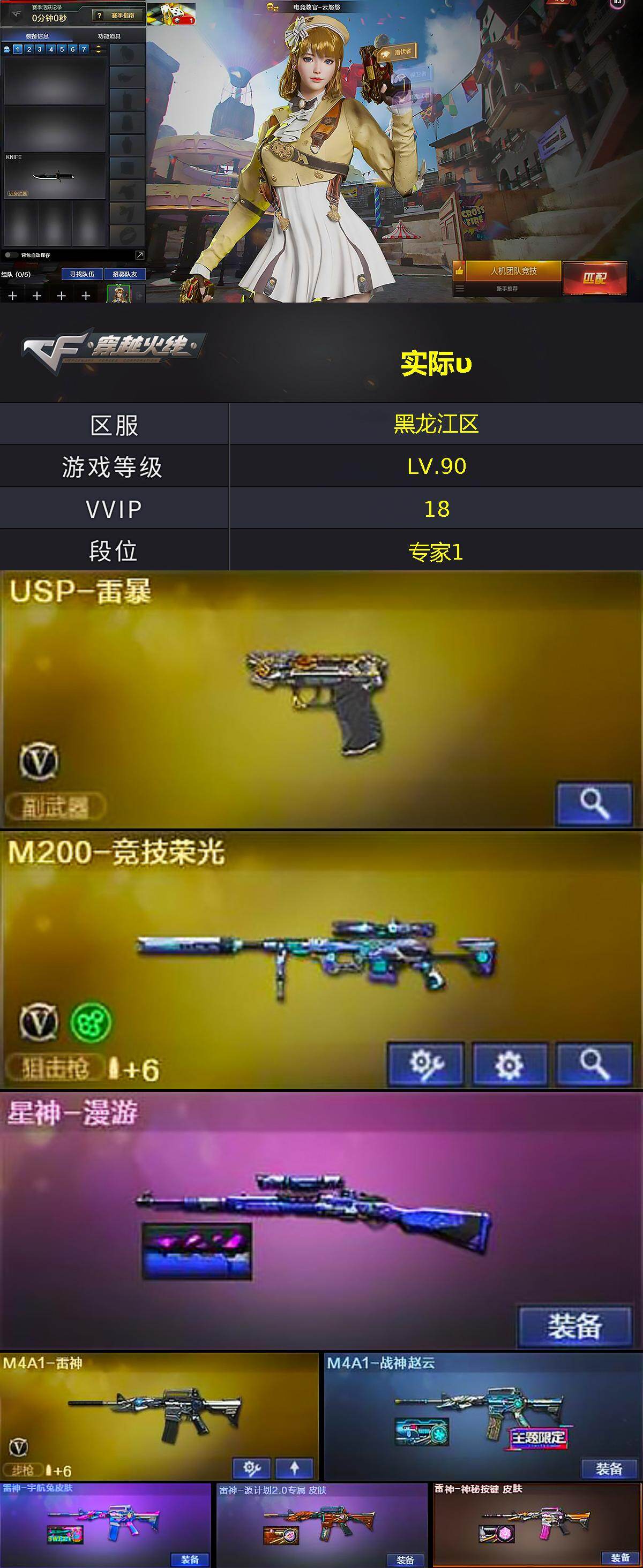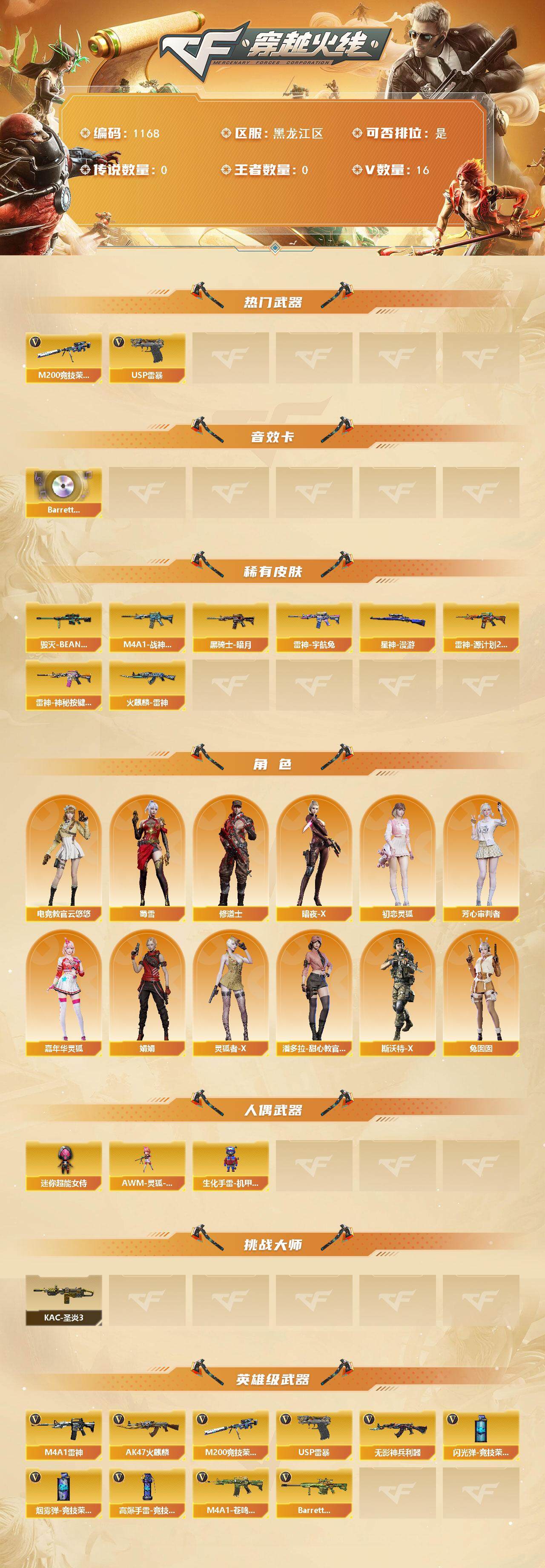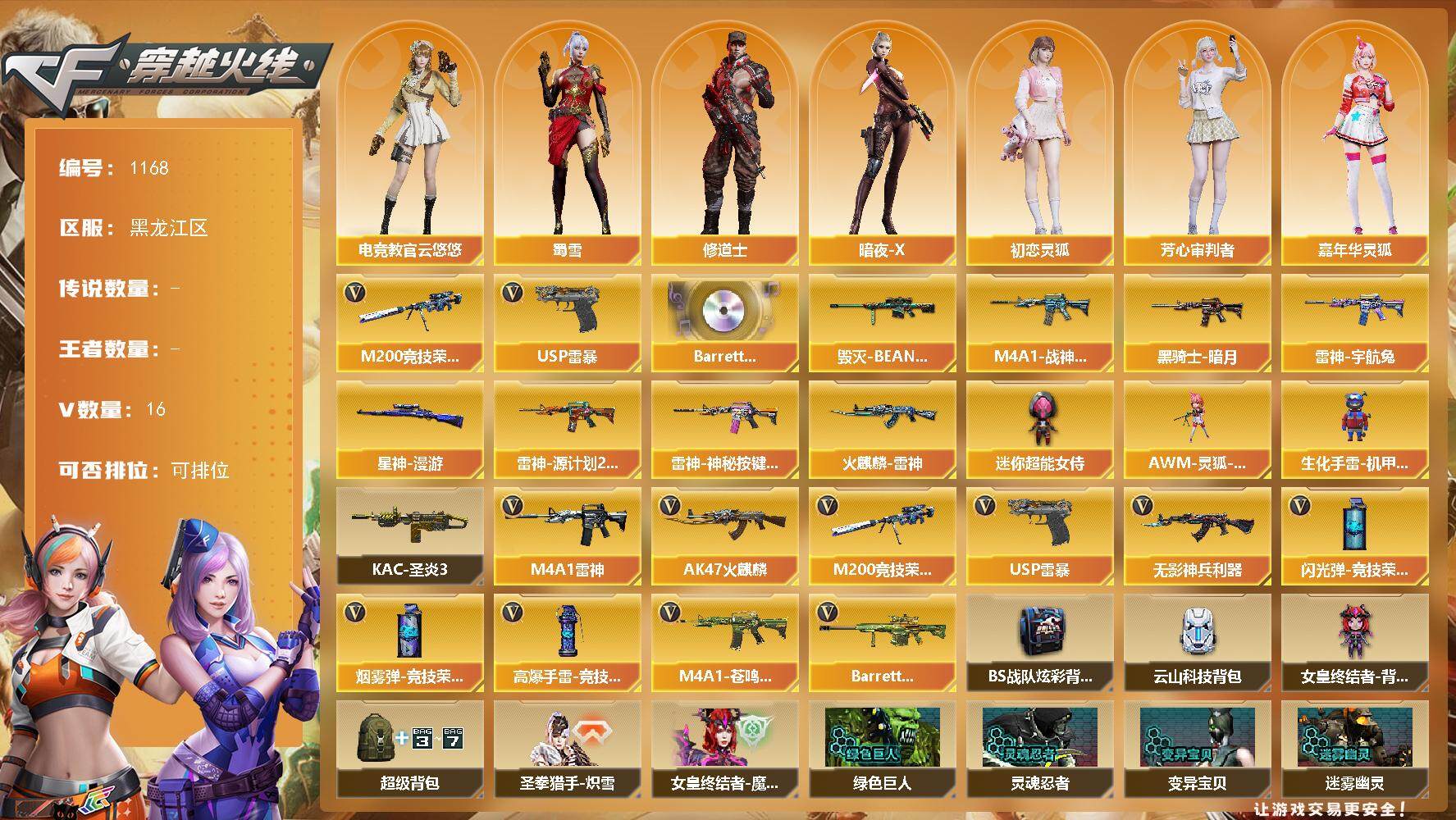 [14891924]黑龙江区-16V-0王者-0炫金 【热门武器】:M200-竞技荣光,USP-雷暴 【音效卡】:Barrett-碧霄极光音效卡 【皮肤】:星神-漫游,M4A1-战神赵云,雷神-宇航兔皮肤,雷神-源计划2.0专属 皮肤,雷神-神秘按键 皮肤,火麒麟-雷神,毁灭-BEAN-2020MVP,黑骑士-暗月 【角色】:电竞教官-云悠悠,修道士,暗夜-X,初恋灵狐,芳心审判者,嘉年华灵狐,娟娟,灵狐者-X,