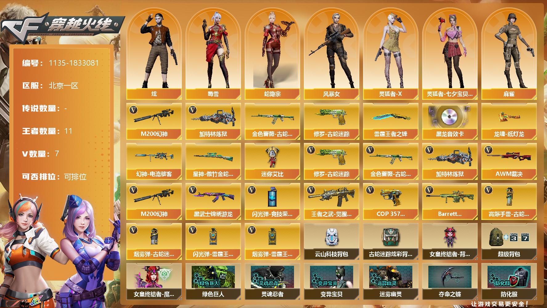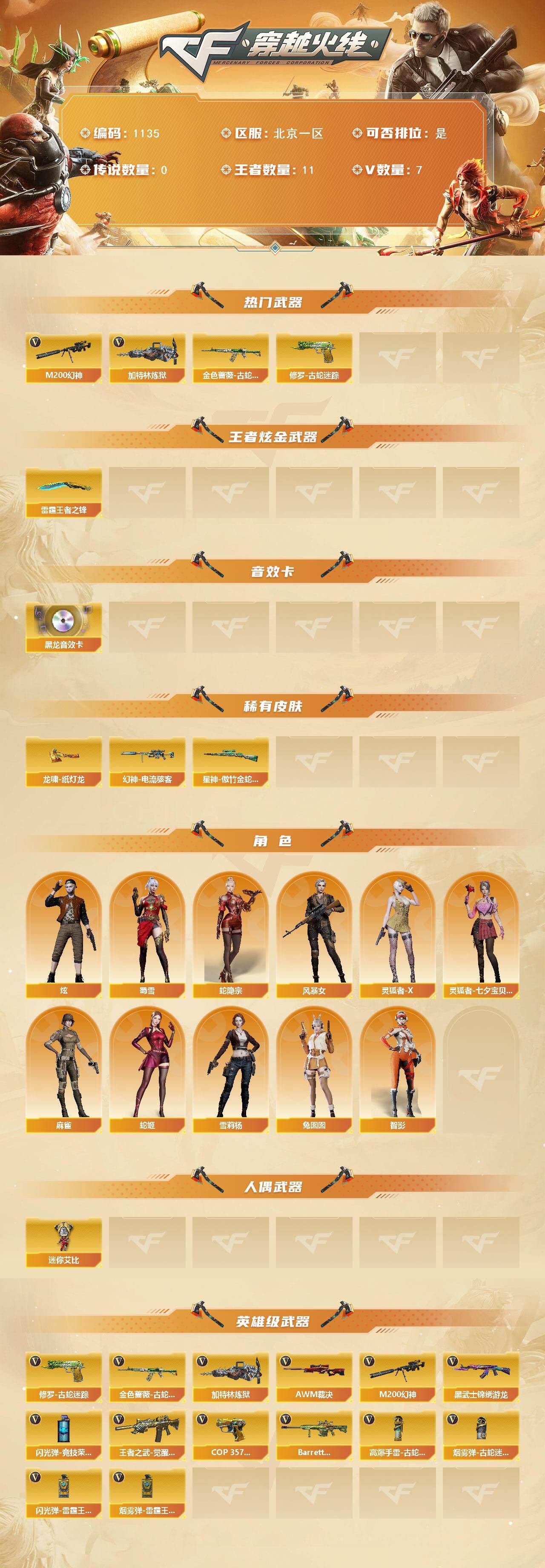 [14892412]北京一区-7V-11王者-0炫金 【热门武器】:M200-幻神,金色蔷薇-古蛇迷踪,修罗-古蛇迷踪,加特林-炼狱 【王者炫金武器】:雷霆王者之锋 【音效卡】:M4A1-黑龙音效卡 【皮肤】:幻神-电流骇客 皮肤,星神-傲竹金蛇 皮肤,龙啸-纸灯龙皮肤 【角色】:炫,蛇隐宗,风暴女,灵狐者-X,灵狐者-七夕宝贝,麻雀,蛇姬,蜀雪,兔囡囡,雪莉杨,智影 【人偶武器】:迷你艾比 【英雄级武器】:黑武