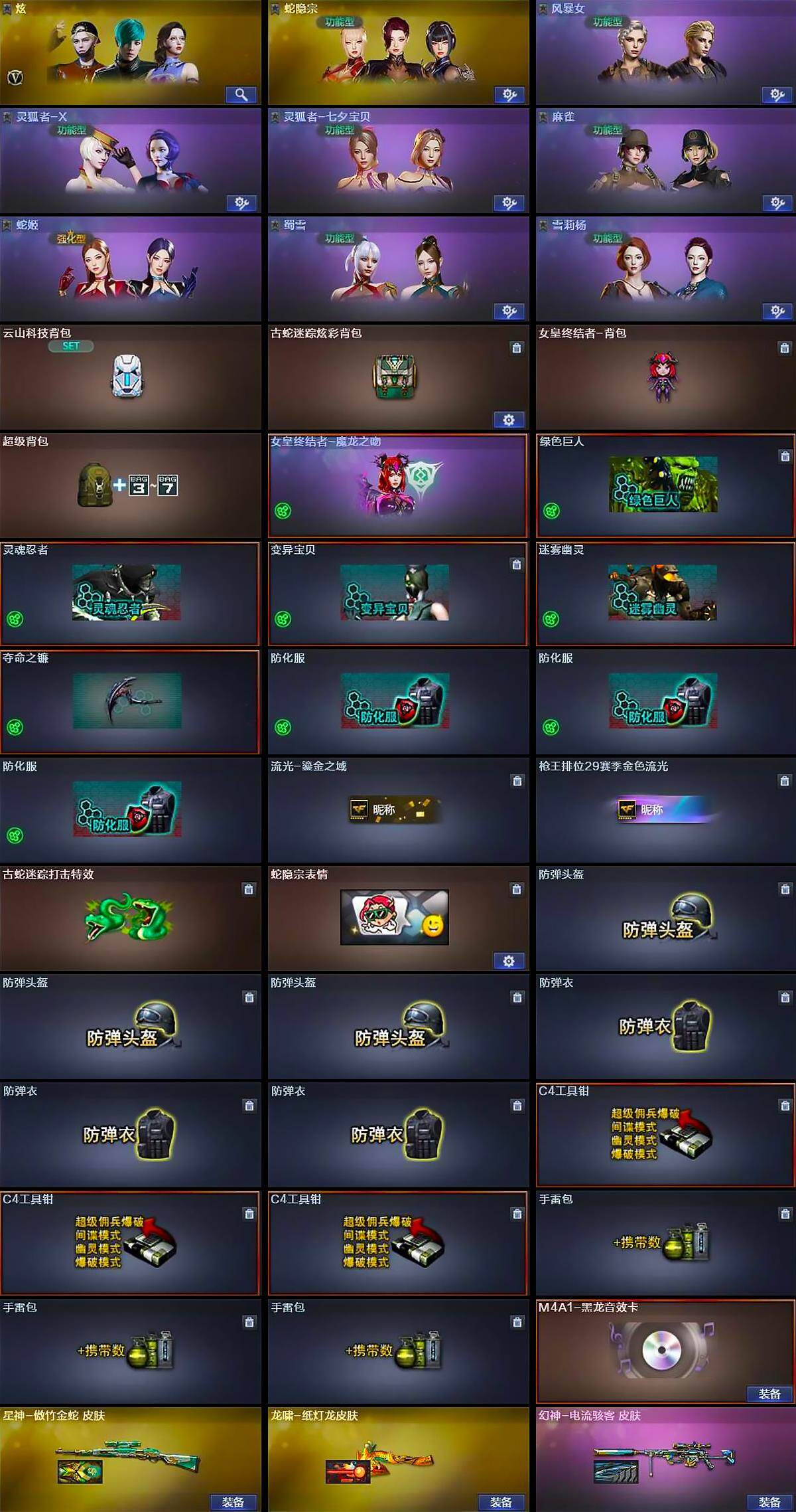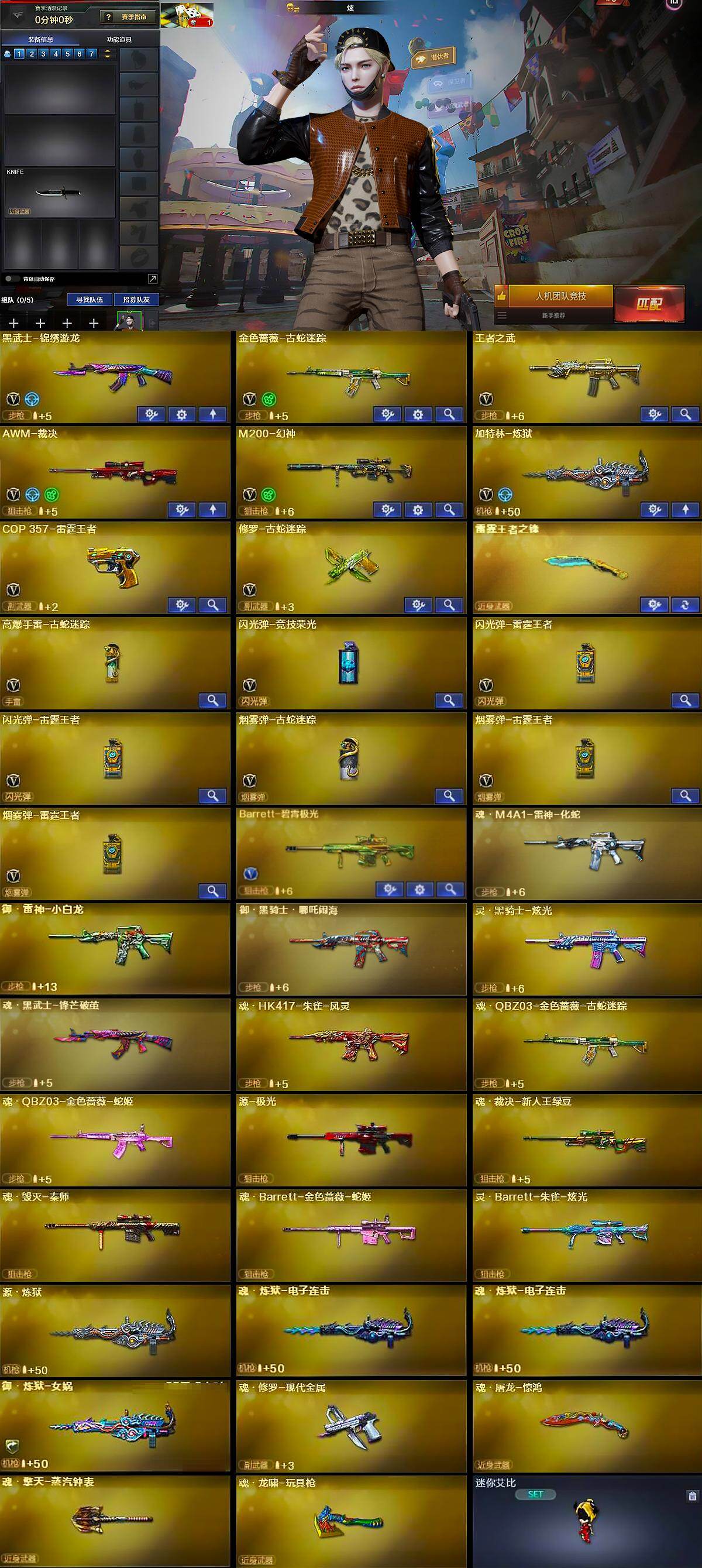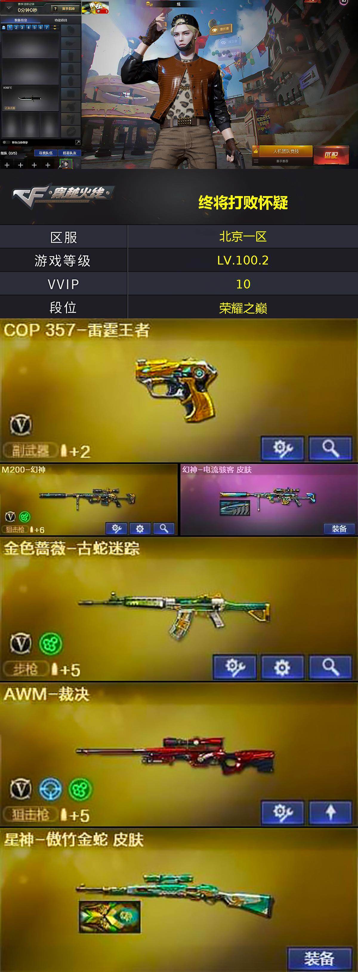 - [15525458]北方大区-51V-3王者-0炫金 【传说武器】:传说梦魇 【热门武器】:传说梦魇,QBZ03-金色蔷薇,Scar Light-白虎,加特林-炼狱,Knife-冠军之刃*2,炽芒蝶刃*2 【王者炫金武器】:王者星霆 【皮肤】:白虎-白鲨-CFPLS23冠军,QBZ03-巅峰荣耀皮肤,裁决-巅峰荣耀 皮肤,雷神-宠儿-2019MVP,雷神-R.LGD-CFPLS18冠军,雷神-源计划2.0专属 皮肤,雷神-仲达白露 皮肤,毁灭-暗月,毁灭-神秘黑洞皮肤,毁灭-虹光风暴 皮肤,黑骑士-AG-S4冠军典藏,龙啸-冠军之啸 【角色】:晴雅,华,王者晴雅,蛇隐宗,奇洋探员,云海玲珑,电竞少女,芳心审判者,飞虎队-X,猎狐者-追月,蛇姬,甜心偶像,铁骑荣耀,游珑儿 【人偶武器】:巴雷特-零-水下丽影,Scar Light-马枪,迷你牛牛 【英雄级武器】:M4A1-雷神,AK12-天启,Scar Light-白虎,QBZ03-云龙,黑武士-锦绣游龙,超新星-热带奇洋,QBZ03-金色蔷薇,王者之心-觉醒版,Barrett-毁灭,Barrett-极光,AWM-裁决,王者幻神-觉醒版,加特林-炼狱,AA-12-雷霆,沙鹰-天神*3,COP 357-云龙,屠龙,麒麟刺-堕天神,麒麟刺,炽芒蝶刃*2,龙啸-热带奇洋,龙啸-堕天神,斩神刀-雷暴,高爆手雷-雷暴,高爆手雷-堕天神*3,高爆手雷-云龙*2,手雷-热带奇洋,高爆手雷-古蛇迷踪,闪光弹-雷暴,闪光弹-堕天神*2,闪光弹-云龙*7,烟雾弹-雷暴*2,烟雾弹-堕天神*2,烟雾弹-云龙*6,烟雾弹-古蛇迷踪 【道具】:CFS限定背包,EP战队炫彩背包,奇洋探员-海龟背包,热带奇洋炫彩背包,虎牙炫彩背包,救世主-黑桃战神,绿色巨人,灵魂忍者,迷雾幽灵,夺命之镰,防化服*2,星辰流光-枪王排位,巅峰赛先锋-金色流光,流光-再燃火线,枪王排位28赛季金色流光,枪王排位29赛季金色流光,热带奇洋打击特效,蛇隐宗表情,热带奇洋表情,斯沃特表情,EP战队名片,EP战队喷图,EP战队击杀图标*2,防弹头盔*2,防弹衣*2,C4工具钳*2,手雷包*2 【特殊枪械】:1白虎,1炼狱