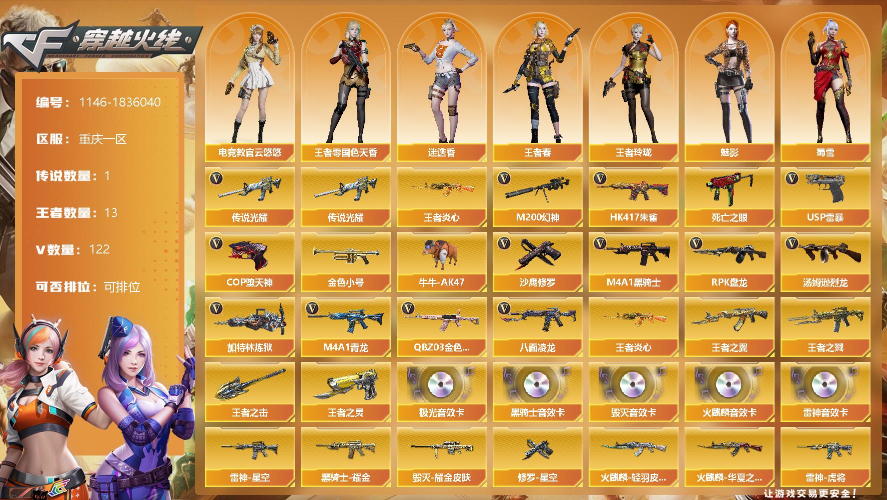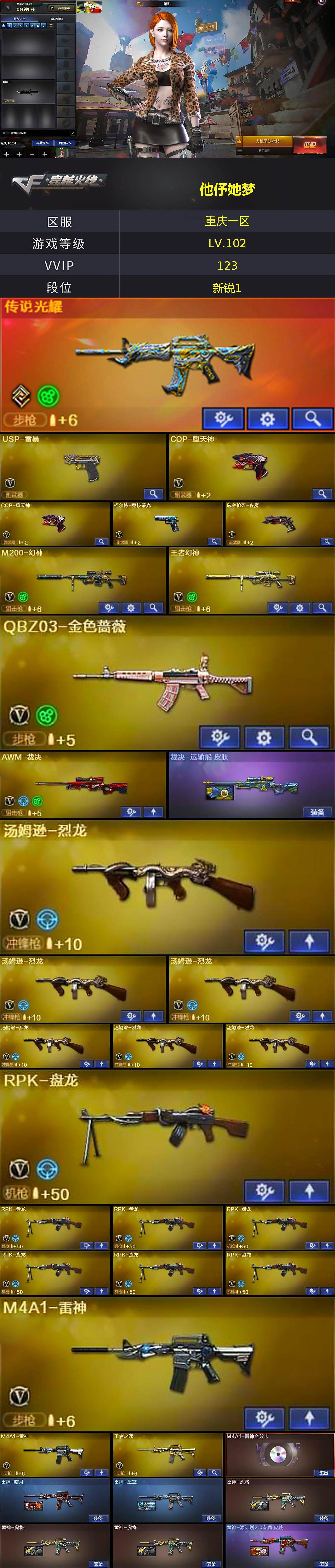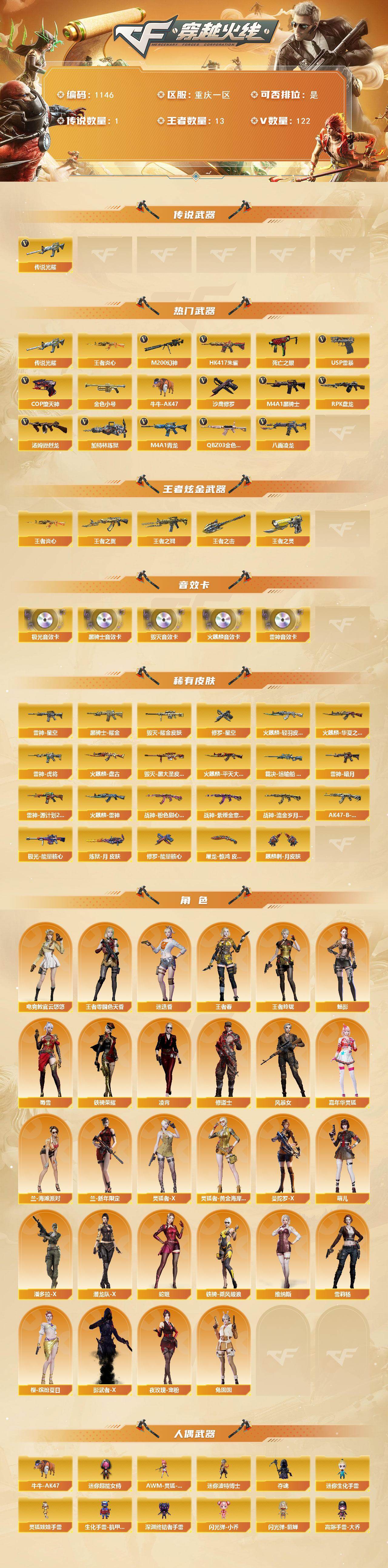 [14893236]重庆一区-122V-13王者-0炫金 【传说武器】:传说光耀 【热门武器】:传说光耀,QBZ03-金色蔷薇,HK417-朱雀,M4A1-青龙,M200-幻神,八面凌龙,死亡之眼,王者炎心,金色小号,牛牛-AK47,M4A1-黑骑士*6,汤姆逊-烈龙*6,RPK-盘龙*7,加特林-炼狱*7,USP-雷暴,COP-堕天神*2,沙鹰-修罗*5 【王者炫金武器】:王者炎心,王者之戮,王者之翼,王者之灵