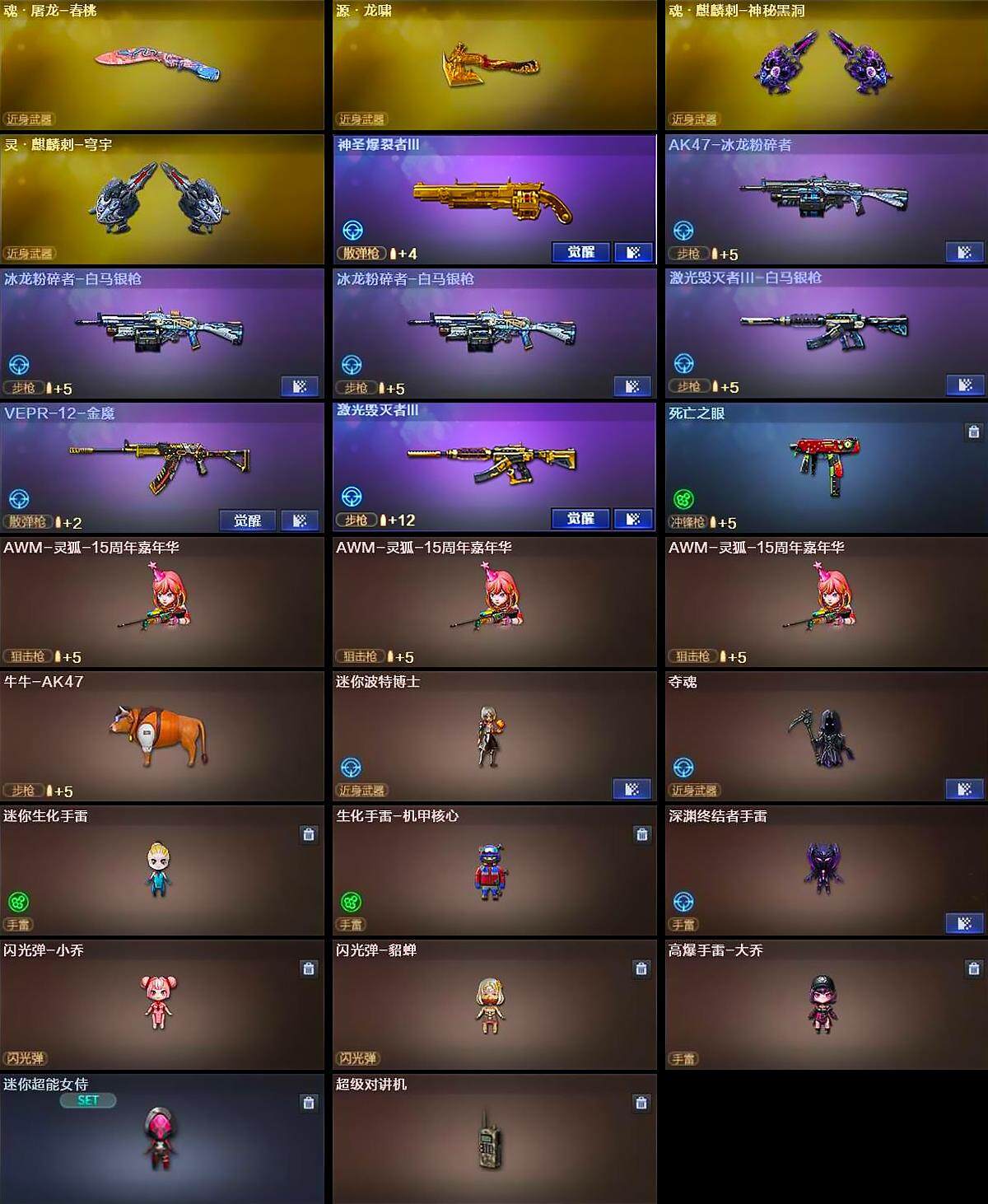 【热门武器】:传说光耀,QBZ03-金色蔷薇,HK417-朱雀,M4A1-青龙,M200-幻神,八面凌龙,死亡之眼,王者炎心,金色小号,牛牛-AK47,M4A1-黑骑士*6,汤姆逊-烈龙*6,RPK-盘龙*7,加特林-炼狱*7,USP-雷暴,COP-堕天神*2,沙鹰-修罗*5