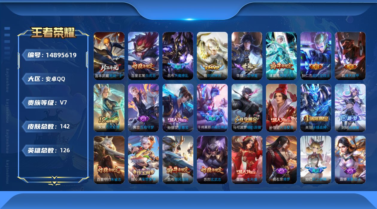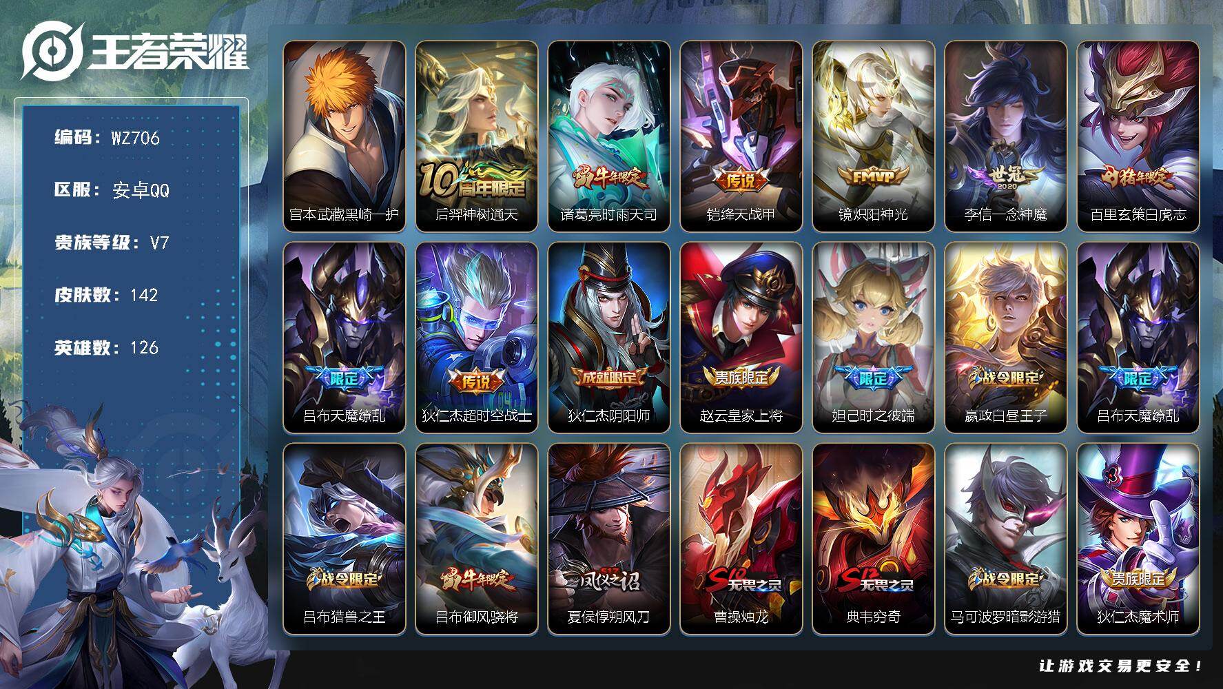 [14895619]安卓Q-V7-最强王者段位-126英雄-142皮肤-1珍品传说-8传说-45史诗 【珍品传说】:宫本武藏黑崎一护 【传说皮肤】:后羿神树通天,诸葛亮时雨天司,铠绛天战甲,镜炽阳神光,李信一念神魔,百里玄策白虎志,吕布天魔缭乱,狄仁杰超时空战士 【限定皮肤】:狄仁杰阴阳师,赵云皇家上将,妲己时之彼端,嬴政白昼王子,吕布天魔缭乱,吕布猎兽之王,吕布御风骁将,夏侯惇朔风刀,曹操烛龙,典韦穷奇,马可波罗暗影游猎,狄仁杰魔术师,狄仁杰万华元夜,项羽海滩派对,项羽霸王别姬,老夫子醍醐杖,关羽冰锋战神,安琪拉魔法小厨娘,程咬金演武夺筹,露娜一生所爱,孙悟空至尊宝,孙悟空大圣娶亲,李元芳银河之约,虞姬霸王别姬,干将莫邪冰霜恋舞曲,蔡文姬繁星吟游,鬼谷子原初探秘者,诸葛亮时雨天司,苏烈玄武志,百里玄策白虎志,百里玄策原初追逐者,百里守约朱雀志,弈星混沌棋,沈梦溪星空之诺,明世隐疑决卦,裴擒虎李小龙,米莱狄御霄,云中君纤云弄巧,盾山御銮,猪八戒西部大镖客,姬小满妄想食味 【年限皮肤】:百里玄策白虎志,百里守约朱雀志,苏烈玄武志,吕布御风骁将,诸葛亮时雨天司 【赛季限定】:夏侯惇朔风刀,曹操烛龙,典韦穷奇,狄仁杰万华元夜,老夫子醍醐杖,程咬金演武夺筹,鬼谷子原初探秘者,百里玄策原初追逐者,弈星混沌棋,明世隐疑决卦,米莱狄御霄,盾山御銮 【战令限定】:嬴政白昼王子,吕布猎兽之王,马可波罗暗影游猎,李元芳银河之约,沈梦溪星空之诺,猪八戒西部大镖客 【史诗皮肤】:露娜紫霞仙子,赵云皇家上将,貂蝉圣诞恋歌,狄仁杰魔术师,廉颇地狱岩魂,宫本武藏鬼剑武藏,孙尚香水果甜心,嬴政暗夜贵公子,嬴政摇滚巨星,吕布圣诞狂欢,曹操幽灵船长,李白千年之狐,安琪拉魔法小厨娘,张飞乱世虎臣,项羽霸王别姬,虞姬霸王别姬,关羽冰锋战神,孙悟空至尊宝,刘邦德古拉伯爵,夏侯惇乘风破浪,兰陵王暗隐猎兽者,刘禅天才门将,程咬金功夫厨神,嬴政白昼王子,孙策猫狗日记,百里守约朱雀志,干将莫邪冰霜恋舞曲,露娜一生所爱,孙悟空大圣娶亲,苏烈玄武志,狄仁杰鹰眼统帅,蔡文姬繁星吟游,李元芳银河之约,妲己时之彼端,橘右京修罗,马可波罗暗影游猎,百里玄策原初追逐者,裴擒虎李小龙,云中君纤云弄巧,吕布御风骁将,杨戬天秀启明,姬小满妄想食味,阿轲化蝶舞,黄忠百相守梦,女娲万灵启世 【其他皮肤】:项羽海滩派对,韩信教廷特使,韩信街头霸王,露娜哥特玫