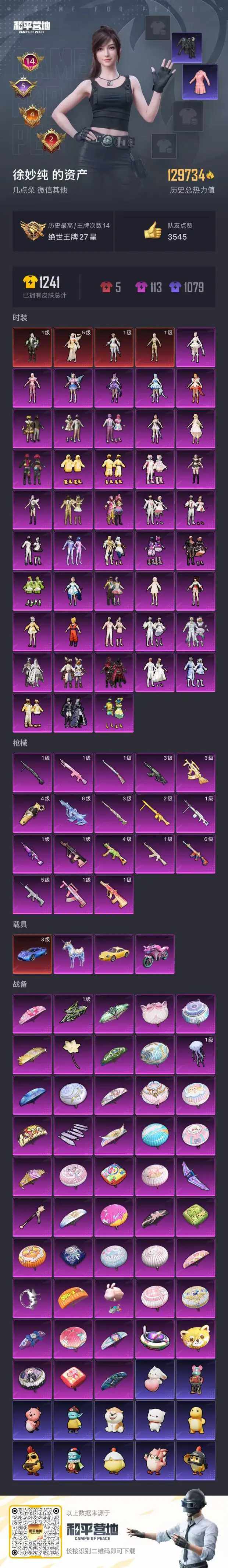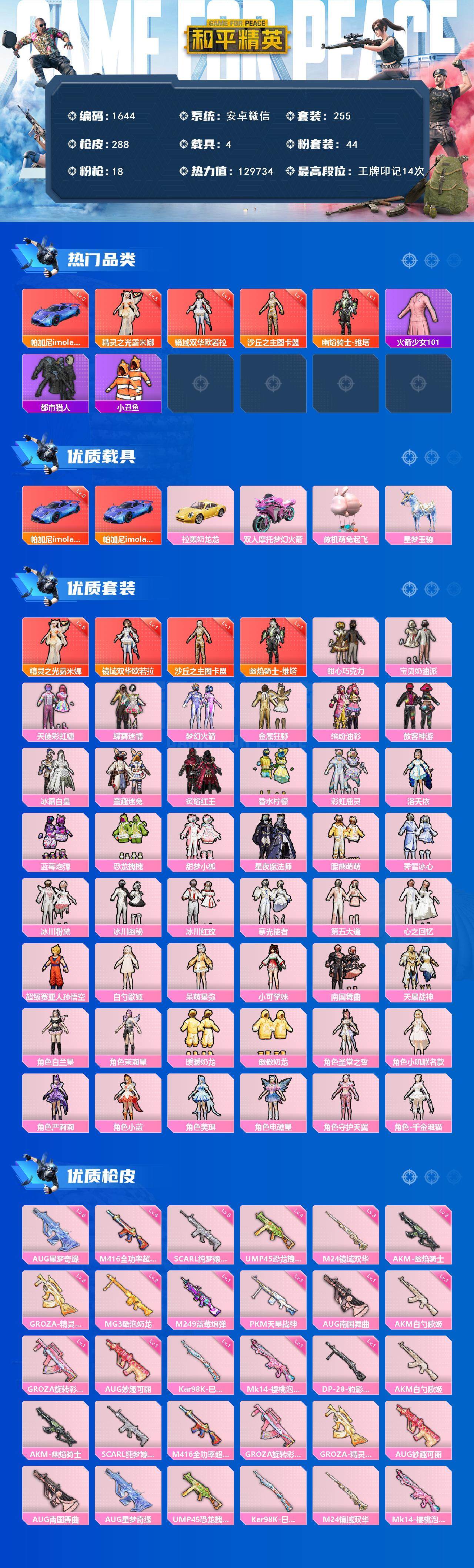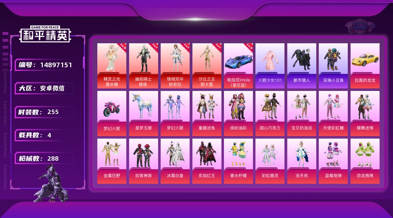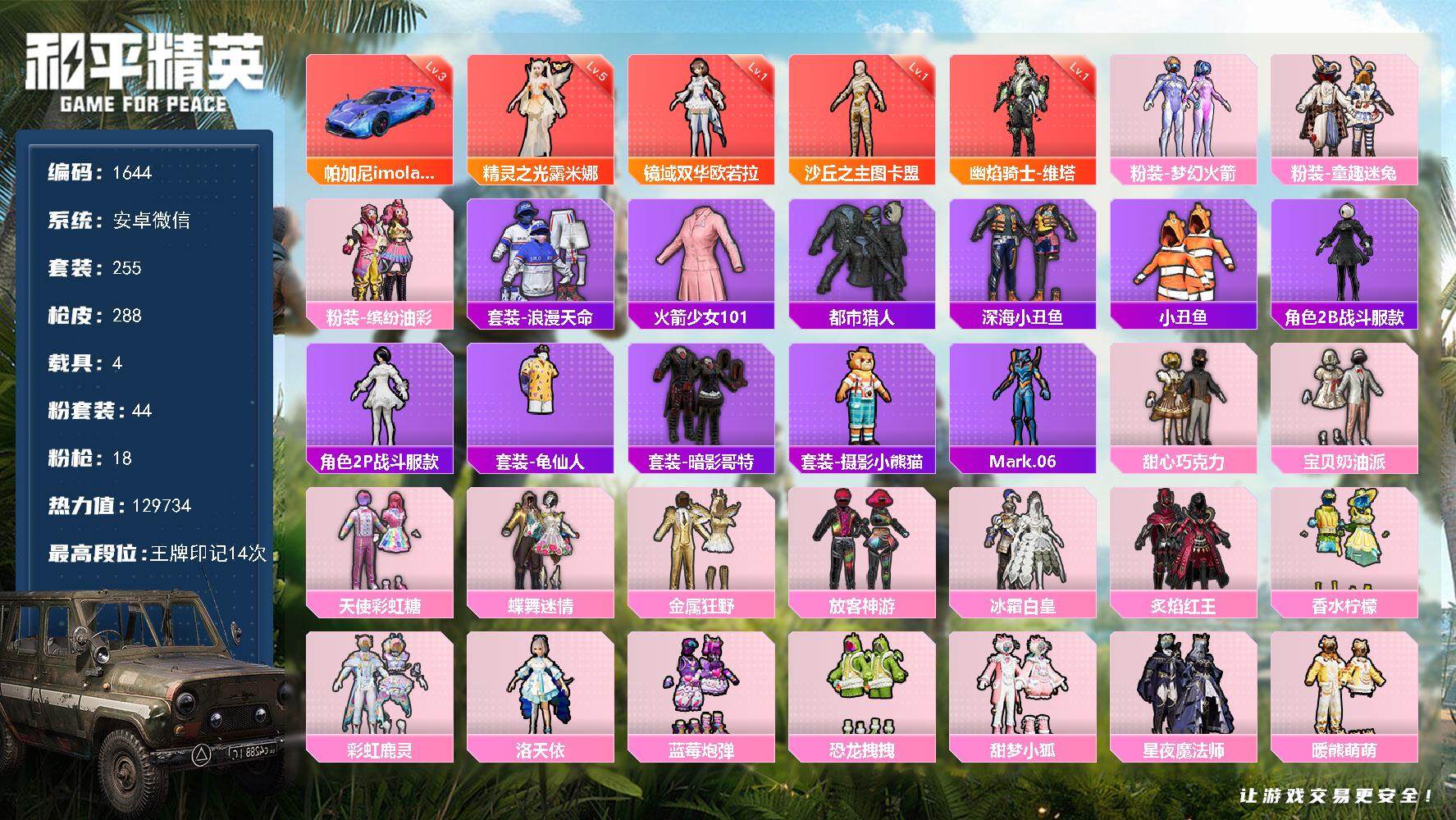 [14897151]安卓 微信-4神装-44粉装-18特效枪-4载具-8粉色飞行器-129734热力值-14王牌印记-255套装-288枪皮