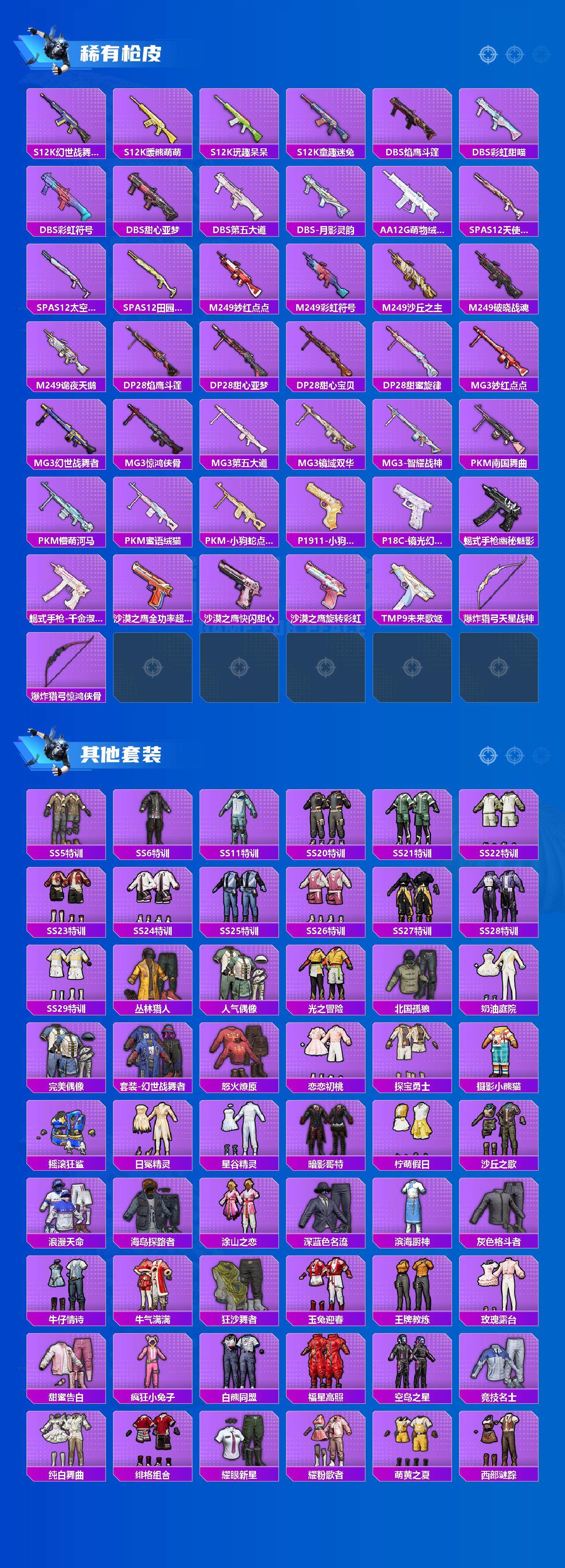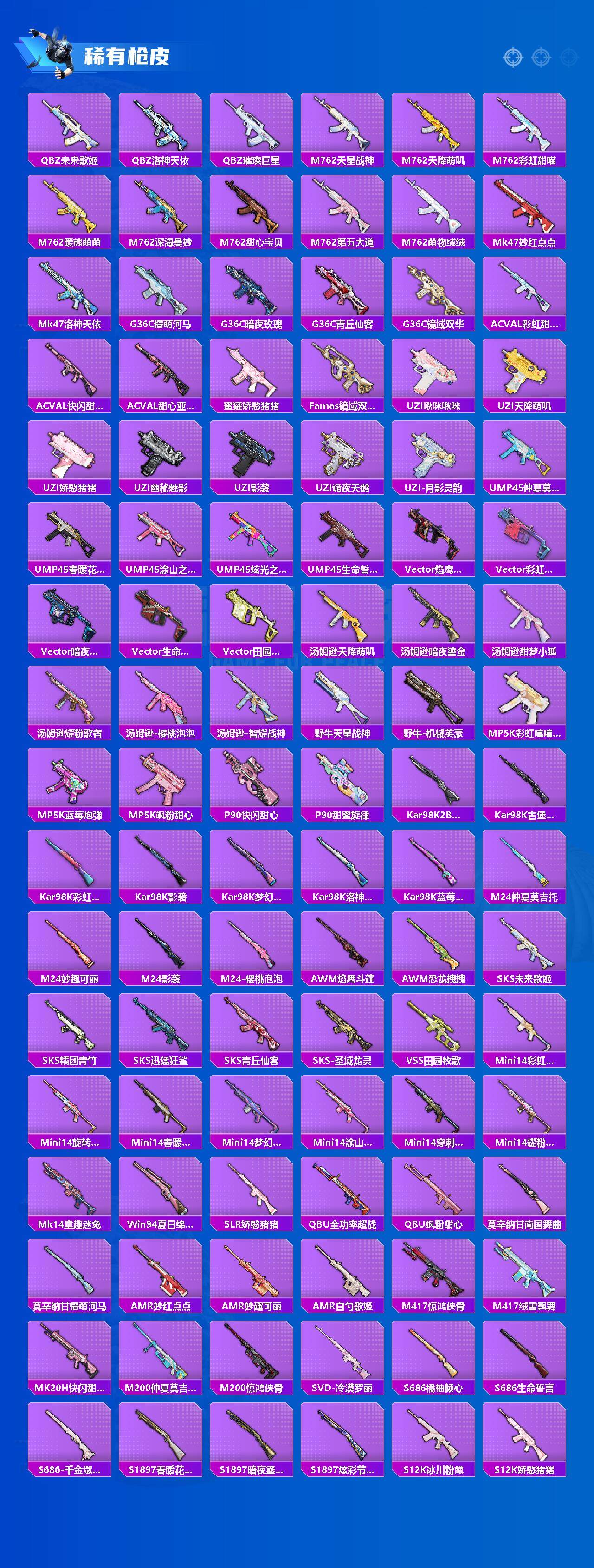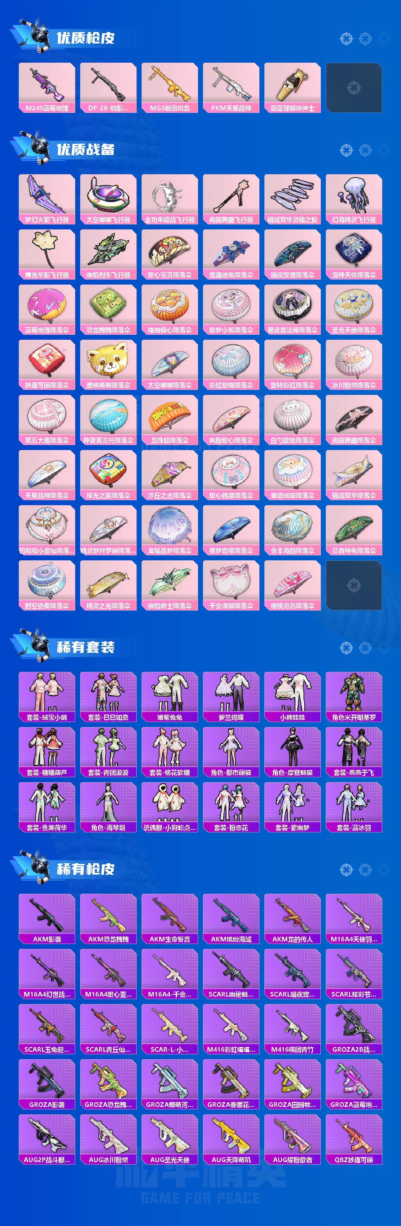 AKM-白勺歌姬,AKM-幽焰骑士,SCAR-L-纯梦嫁纱,M416-全功率超战,GROZA-旋转彩虹,GROZA-精灵之光,AUG-妙趣可丽,AUG-南国舞曲,AUG-星梦奇缘,UMP45-恐龙拽拽,Kar98K-巳巳如意,M24-镜域双华,Mk14-樱桃泡泡,M249-蓝莓炮弹,MG3-酷泡奶龙,PKM-天星战神,烟雾弹-猫咪绅士