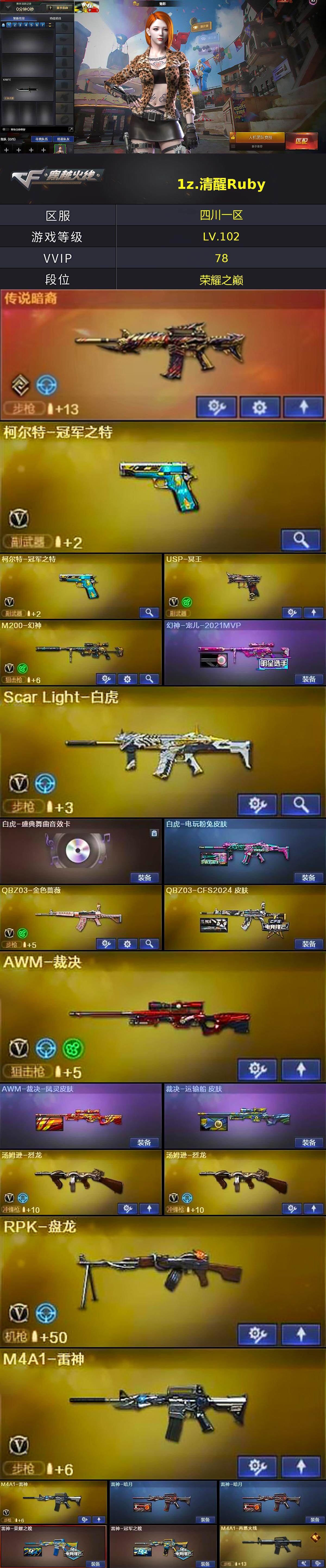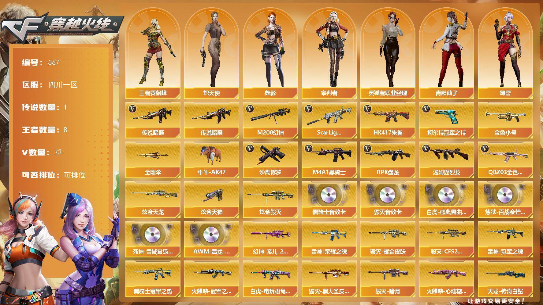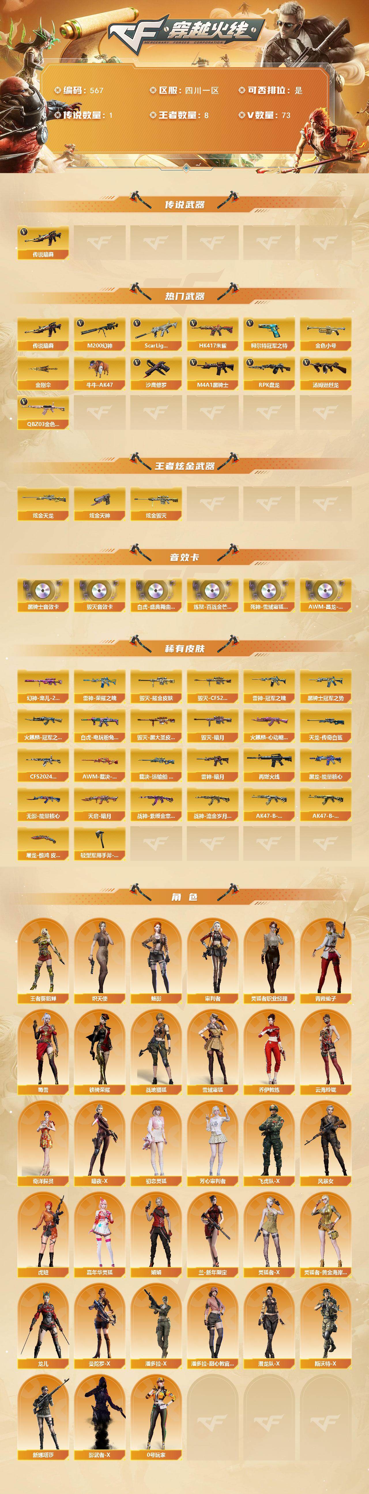 [14897597]四川一区-73V-8王者-3炫金 【传说武器】:传说暗裔 【热门武器】:传说暗裔,QBZ03-金色蔷薇,Scar Light-白虎,HK417-朱雀,M200-幻神,柯尔特-冠军之特*2,金色小号,牛牛-AK47,M4A1-黑骑士,汤姆逊-烈龙*2,RPK-盘龙,沙鹰-修罗*3,金刚伞 【王者炫金武器】:炫金毁灭,炫金天龙,炫金天神 【音效卡】:M4A1-黑骑士音效卡,Barrett-毁灭音效卡,白虎-盛典舞曲音效卡,炼狱-百战金芒-庆典舞曲音效卡,死神-雪域霜狐-怀旧音效卡,AWM-昌龙-怀旧音效卡 【皮肤】:幻神-宠儿-2021MVP,白虎-电玩粉兔皮肤,QBZ03-CFS2024 皮肤,AWM-裁决-凤灵皮肤,裁决-运输船 皮肤,雷神-暗月*2,雷神-荣耀之魄,雷神-冠军之魄,M4A1-再燃火线,火麒麟-冠军之心,火麒麟-心动糖果,毁灭-暗月,毁灭耀金皮肤,毁灭-CFS2020,毁灭-黑大圣皮肤,黑龙-能量核心,黑骑士-冠军之势,无影-能量核心,天启-暗月,战神-紫绶金章皮肤,战神-流金岁月皮肤,AK47-B-常胜将军-刘备,AK47-B-常胜将军-孙权*2,AWM-天龙-传奇白鲨,屠龙-惊鸿 皮肤,轻型军用手斧-再燃火线 【角色】:魅影,审判者,战地猎狐,王者-葵-貂蝉,雪域霜狐,奇洋探员,乔伊教练,云海玲珑,炽天使,暗夜-X,初恋灵狐,芳心审判者,飞虎队-X,风暴女,虎妞,嘉年华灵狐,娟娟,兰-新年限定,0号玩家,灵狐者-X,灵狐者-黄金海岸,灵狐者-职业经理,龙儿,曼陀罗-X,潘多拉-X,潘多拉-甜心教官,潜龙队-X,青霞仙子,斯沃特-X,蜀雪,铁骑荣耀,新娜塔莎,影武者-X 【人偶武器】:AWM-灵狐-15周年嘉年华,牛牛-AK47,迷你深渊冰龙,夺魂,生化手雷-机甲核心,闪光弹-小乔,闪光弹-貂蝉,高爆手雷-大乔,灵狐娃娃手雷*3 【暴走生化】:超级对讲机 【挑战大师】:神圣爆裂者III,AK47-冰龙粉碎者,激光毁灭者III-白马银枪,激光毁灭者III,神圣爆裂者-末日III 【英雄级武器】:M4A1-千变,AK47-火麒麟*2,M4A1-黑龙,M4A1-雷神*2,M4A1-黑骑士,AK47-无影*2,M4A1-死神,AK12-天启,AN94-超新星,M4A1-武圣,HK417-朱雀,Scar Light-白虎,无影-神兵利器,超新星-热带奇洋,
