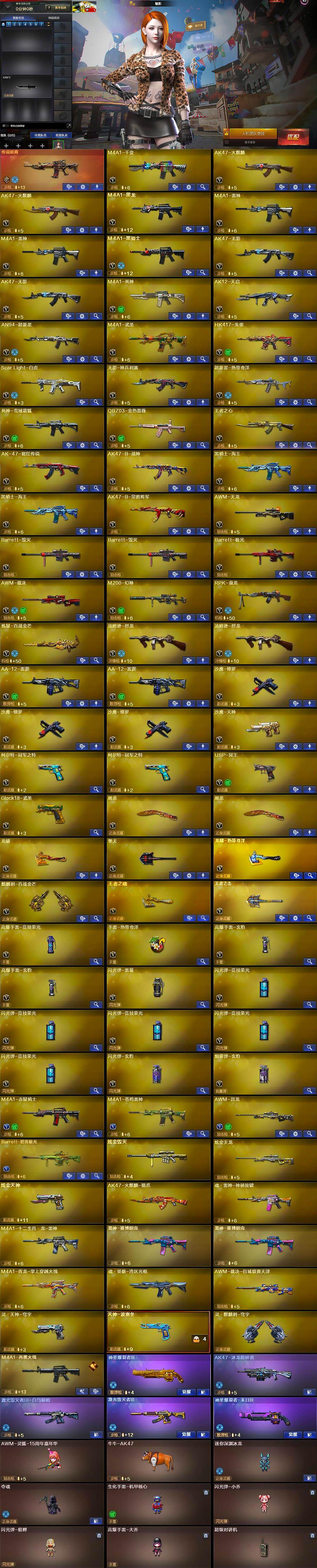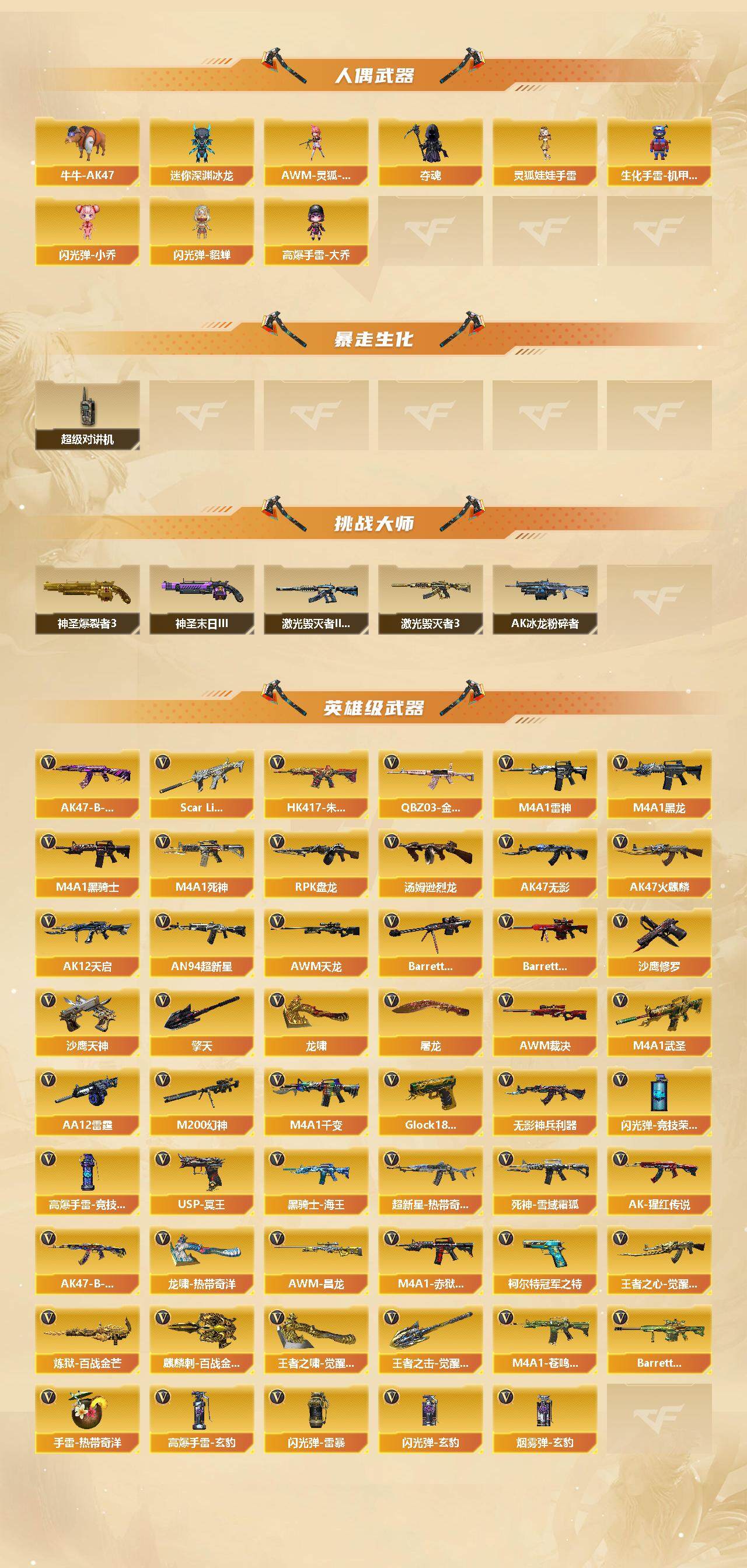 【英雄级武器】:M4A1-千变,AK47-火麒麟*2,M4A1-黑龙,M4A1-雷神*2,M4A1-黑骑士,AK47-无影*2,M4A1-死神,AK12-天启,AN94-超新星,M4A1-武圣,HK417-朱雀,Scar Light-白虎,无影-神兵利器,超新星-热带奇洋,