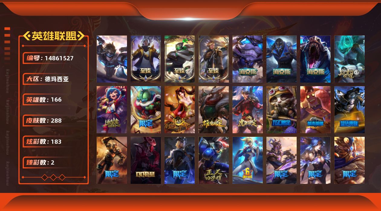 [14861527]【店主推荐捡漏号】未定级段位-166英雄-288皮肤-183炫彩-1终极-9神话-44限定-33传说-77史诗