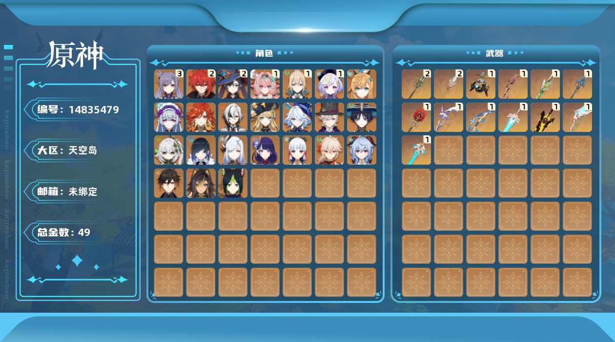 0命阿蕾奇诺,0命娜维娅,0命芙宁娜,0命林尼,0命迪希雅,0命流浪者,0命纳西妲,0命提纳里,0命夜兰,0命申鹤,0命雷电将军,0命枫原万叶,0命神里绫华,0命钟离,0命甘雨,3命刻晴,1命七七,1命琴,2命莫娜,2命迪卢克,0命玛薇卡,0命梦见月瑞希,1命瓦雷莎,0命爱可菲,精1金流监督,精1最初的大魔术,精1裁叶萃光,精1息灾,精1终末嗟叹之诗,精1无工之剑,精1护摩之杖,精2和璞鸢,精2天空之脊,精1天空之翼,精1阿莫斯之弓,精1天空之刃,精1天空之傲