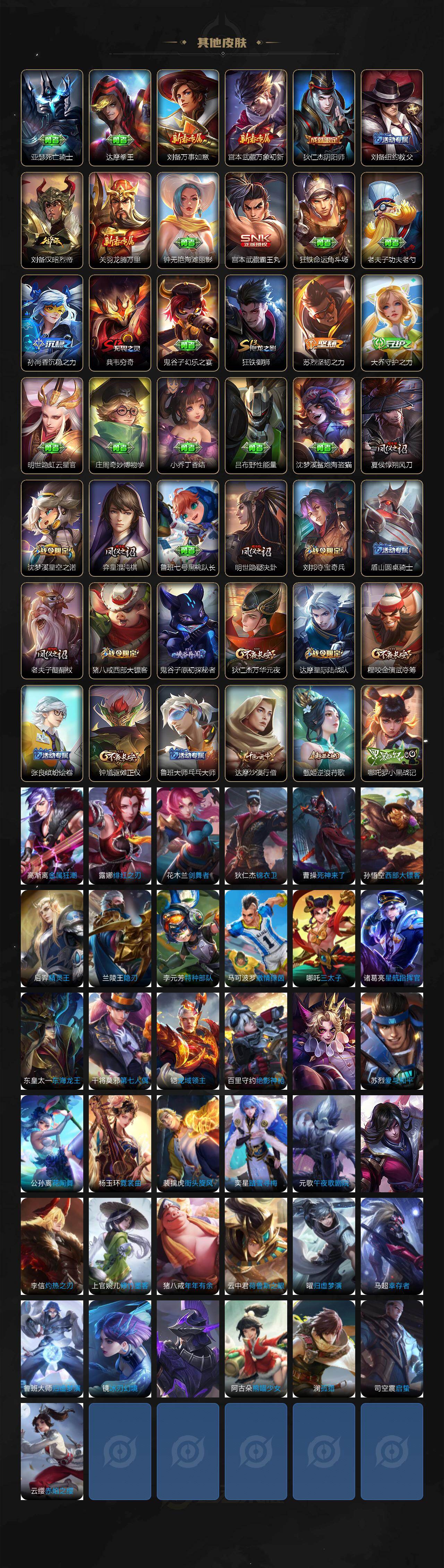 【其他皮肤】:项羽海滩派对,韩信教廷特使,韩信街头霸王,赵云忍炎影,白起白色死神,妲己少女阿狸,亚瑟死亡骑士,达摩拳王,刘备万事如意,宫本武藏万象初新,狄仁杰阴阳师,刘备纽约教父,刘备汉昭烈帝,关羽龙腾万里,钟无艳海滩丽影,宫本武藏霸王丸,狂铁命运角斗场,老夫子功夫老勺,孙尚香沉稳之力,典韦穷奇,鬼谷子幻乐之宴,狂铁御狮,苏烈坚韧之力,大乔守护之力,明世隐虹云星官,庄周奇妙博物学,小乔丁香结,吕布野性能量,沈梦溪鲨炮海盗猫,夏侯惇朔风刀,沈梦溪星空之诺,弈星混沌棋,鲁班七号黑桃队长,明世隐疑决卦,刘邦夺宝奇兵,盾山圆桌骑士,老夫子醍醐杖,猪八戒西部大镖客,鬼谷子原初探秘者,狄仁杰万华元夜,达摩星际陆战队,程咬金演武夺筹,张良缤纷绘卷,钟馗驱傩正仪,鲁班大师乓乓大师,达摩沙漠行僧,甄姬逆浪荇歌,哪吒罗