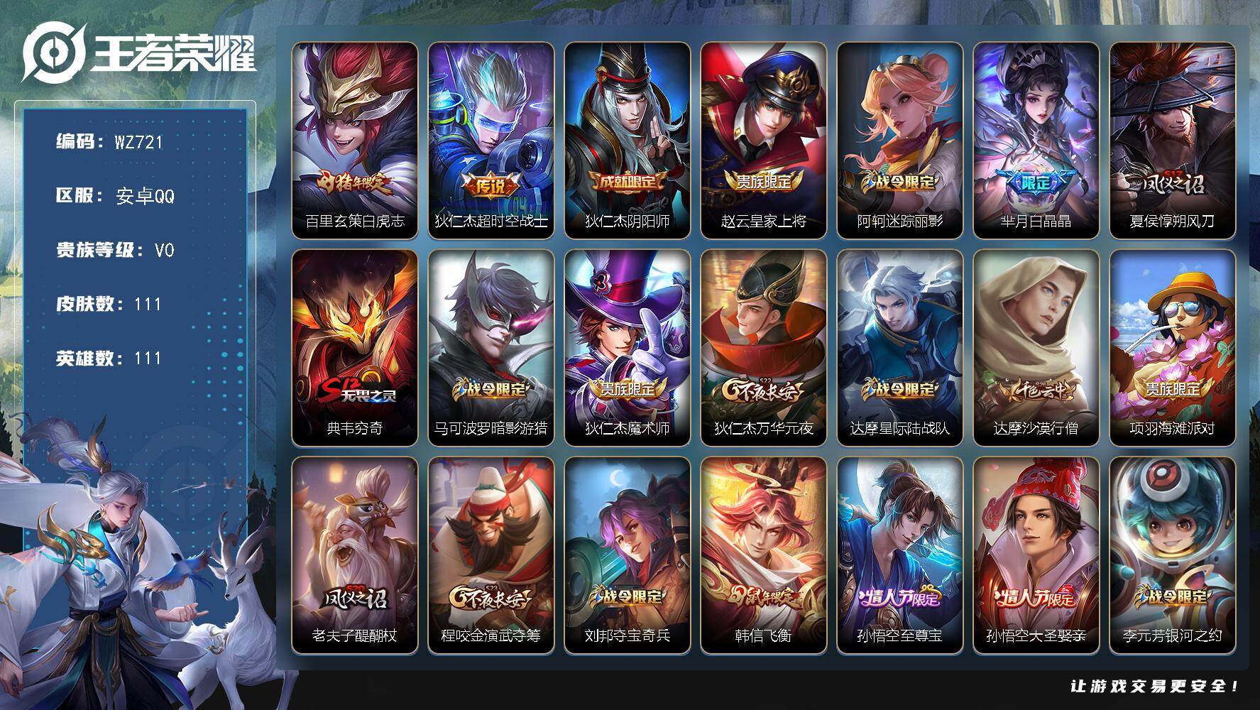 [14898133]安卓Q-111英雄-111皮肤-2传说-24史诗 【传说皮肤】:百里玄策白虎志,狄仁杰超时空战士 【限定皮肤】:狄仁杰阴阳师,赵云皇家上将,阿轲迷踪丽影,芈月白晶晶,夏侯惇朔风刀,典韦穷奇,马可波罗暗影游猎,狄仁杰魔术师,狄仁杰万华元夜,达摩星际陆战队,达摩沙漠行僧,项羽海滩派对,老夫子醍醐杖,程咬金演武夺筹,刘邦夺宝奇兵,韩信飞衡,孙悟空至尊宝,孙悟空大圣娶亲,李元芳银河之约,钟馗驱傩正仪,蔡文姬繁星吟游,鬼谷子原初探秘者,百里玄策白虎志,弈星混沌棋,沈梦溪星空之诺,明世隐疑决卦,裴擒虎李小龙,狂铁御狮,米莱狄胡桃异想国,猪八戒西部大镖客,上官婉儿梁祝,嫦娥拒霜思 【年限皮肤】:百里玄策白虎志,韩信飞衡 【赛季限定】:夏侯惇朔风刀,典韦穷奇,狄仁杰万华元夜,达摩沙漠行僧,老夫子醍醐杖,程咬金演武夺筹,钟馗驱傩正仪,鬼谷子原初探秘者,弈星混沌棋,明世隐疑决卦,狂铁御狮 【战令限定】:阿轲迷踪丽影,马可波罗暗影游猎,达摩星际陆战队,刘邦夺宝奇兵,李元芳银河之约,沈梦溪星空之诺,米莱狄胡桃异想国,猪八戒西部大镖客 【史诗皮肤】:赵云皇家上将,貂蝉圣诞恋歌,狄仁杰魔术师,宫本武藏鬼剑武藏,妲己魅力维加斯,妲己女仆咖啡,韩信白龙吟,孙悟空至尊宝,夏侯惇乘风破浪,百里守约特工魅影,孙悟空大圣娶亲,狄仁杰鹰眼统帅,上官婉儿梁祝,蔡文姬繁星吟游,李元芳银河之约,韩信飞衡,阿轲迷踪丽影,橘右京修罗,马可波罗暗影游猎,裴擒虎李小龙,芈月白晶晶,米莱狄胡桃异想国,嫦娥拒霜思,后羿石田雨龙 【其他皮肤】:项羽海滩派对,韩信教廷特使,韩信街头霸王,赵云忍炎影,白起白色死神,妲己少女阿狸,亚瑟死亡骑士,达摩拳王,刘备万事如意,宫本武藏万象初新,狄仁杰阴阳师,刘备纽约教父,刘备汉昭烈帝,关羽龙腾万里,钟无艳海滩丽影,宫本武藏霸王丸,狂铁命运角斗场,老夫子功夫老勺,孙尚香沉稳之力,典韦穷奇,鬼谷子幻乐之宴,狂铁御狮,苏烈坚韧之力,大乔守护之力,明世隐虹云星官,庄周奇妙博物学,小乔丁香结,吕布野性能量,沈梦溪鲨炮海盗猫,夏侯惇朔风刀,沈梦溪星空之诺,弈星混沌棋,鲁班七号黑桃队长,明世隐疑决卦,刘邦夺宝奇兵,盾山圆桌骑士,老夫子醍醐杖,猪八戒西部大镖客,鬼谷子原初探秘者,狄仁杰万华元夜,达摩星际陆战队,程咬金演武夺筹,张良缤纷绘卷,钟馗驱傩正仪,鲁班大师乓乓大师,达摩沙漠行僧,甄姬逆浪荇歌,哪吒罗