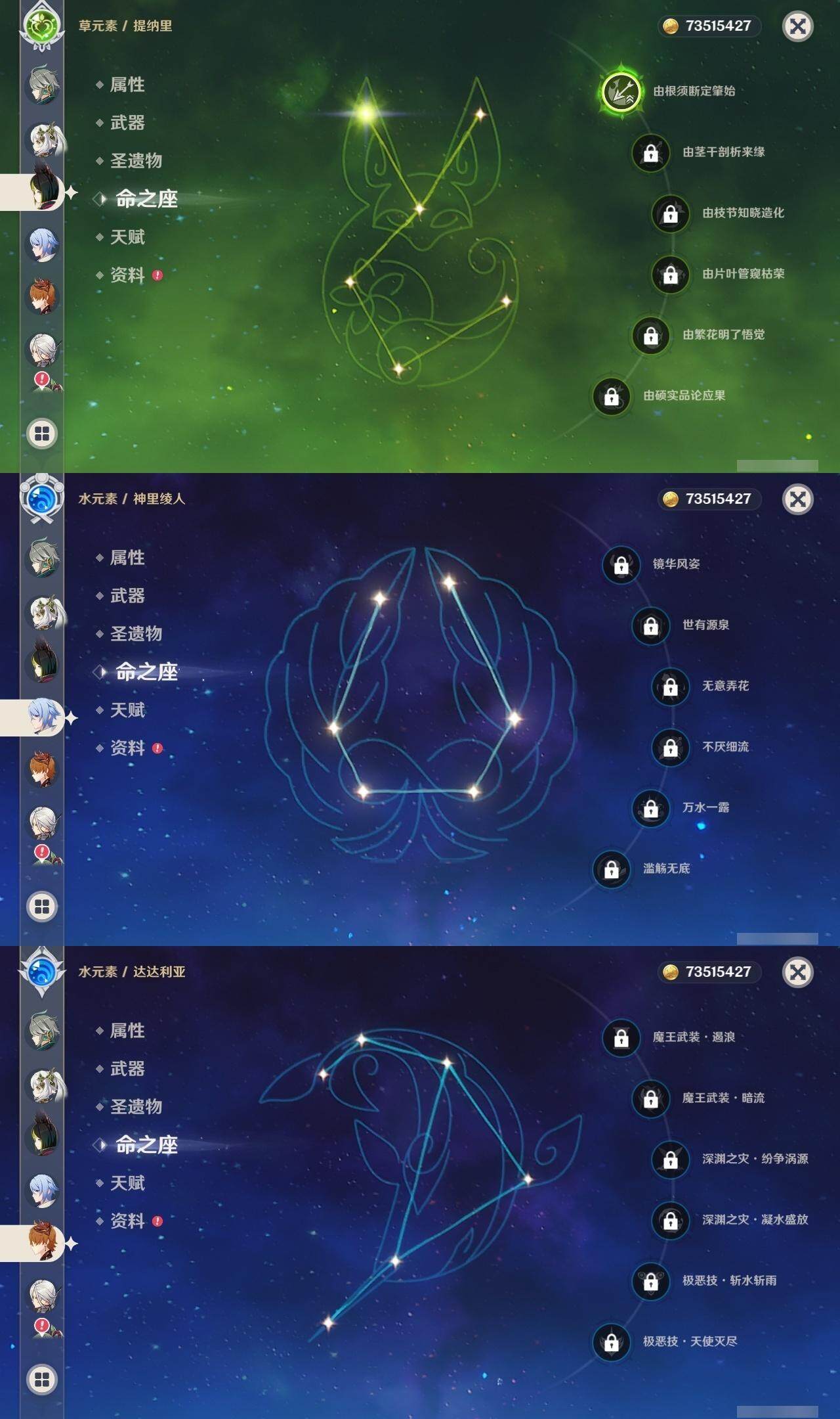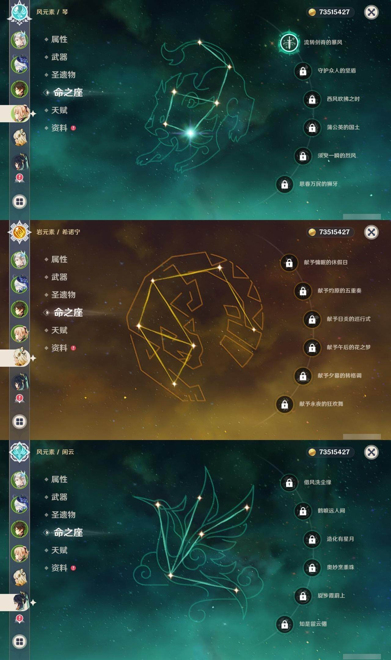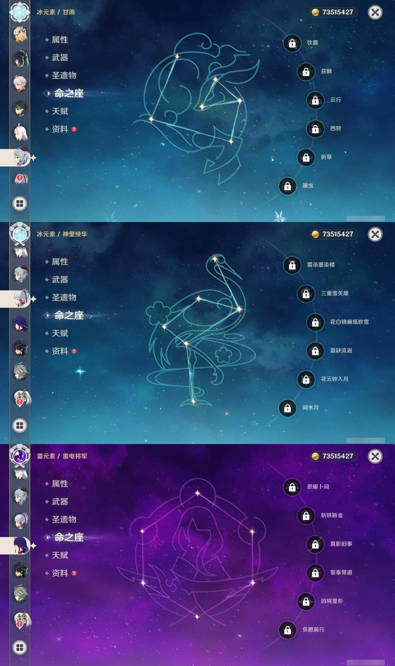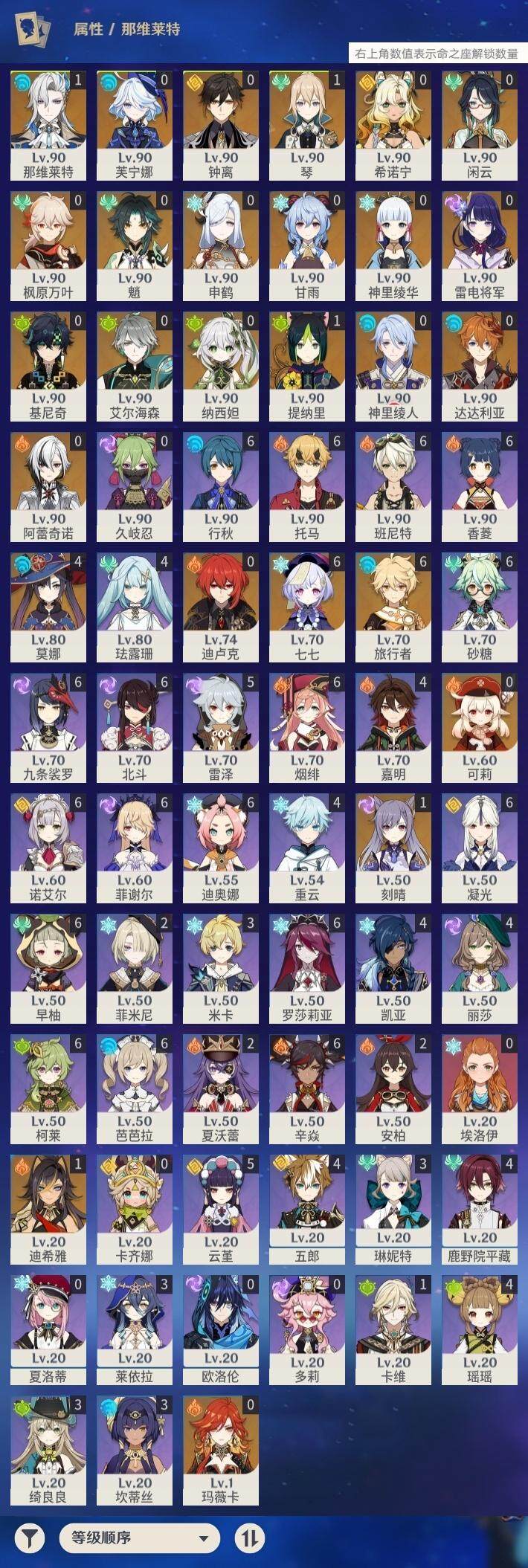 0命阿蕾奇诺,0命闲云,0命芙宁娜,1命那维莱特,1命迪希雅,0命艾尔海森,0命纳西妲,1命提纳里,0命神里绫人,0命申鹤,0命雷电将军,0命枫原万叶,0命神里绫华,0命钟离,0命甘雨,0命魈,0命可莉,0命达达利亚,1命刻晴,满命七七,1命琴,4命莫娜,0命迪卢克,0命基尼奇,0命希诺宁,0命玛薇卡,精1万世流涌大典,精1裁叶萃光,精1若水,精1波乱月白经津,精1息灾,精1薙草之稻光,精1四风原典,精1和璞鸢,精1天空之翼,精2阿莫斯之弓,精1天空之卷,精1山王长牙