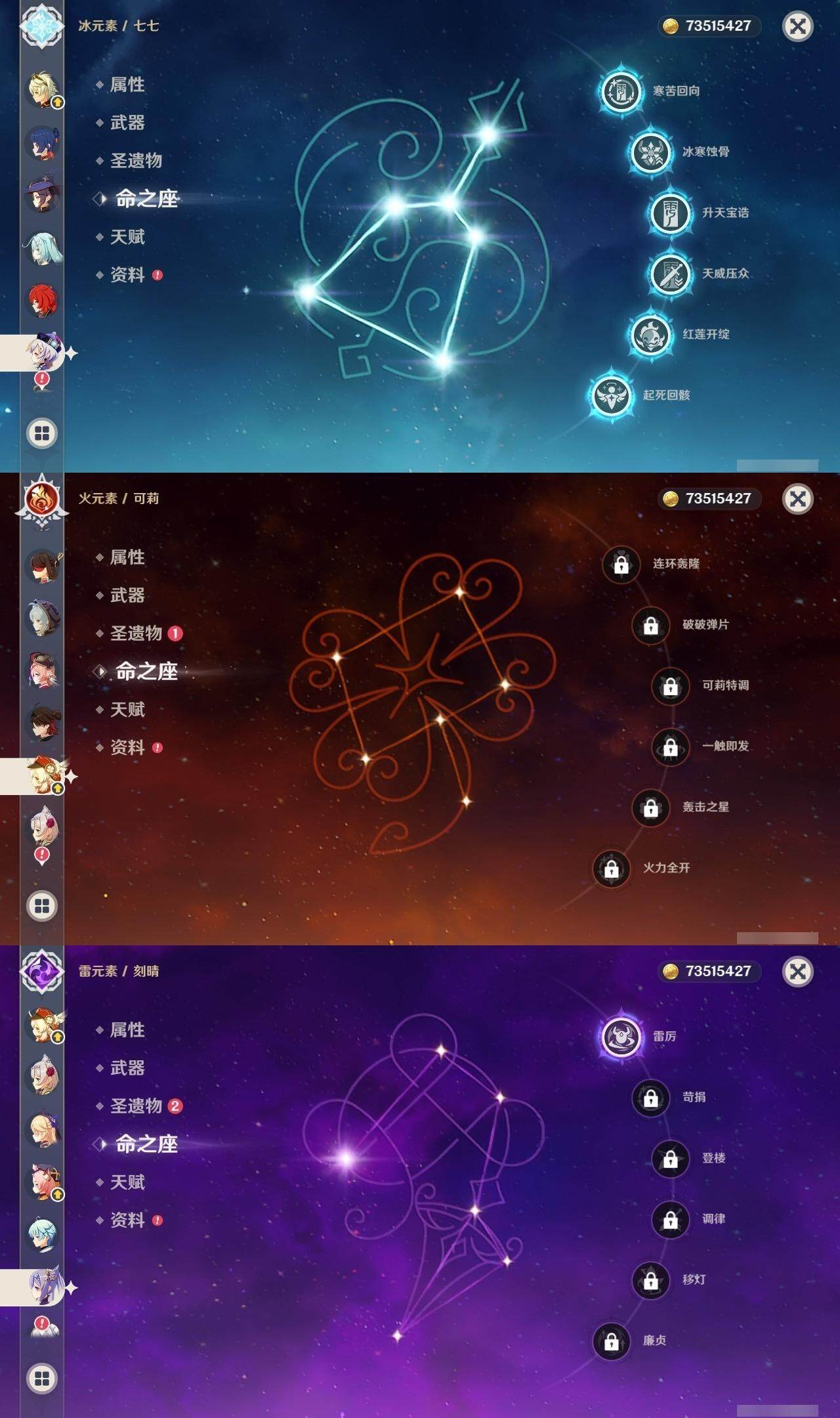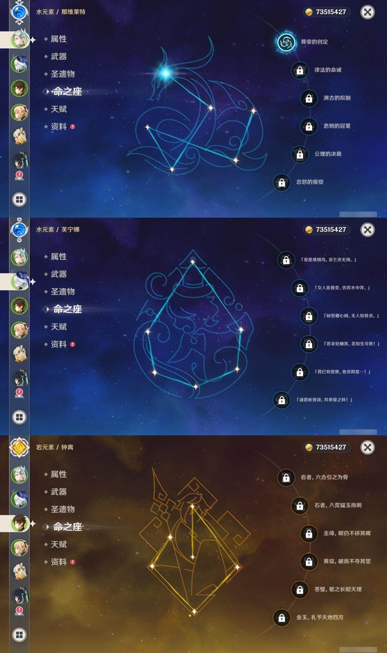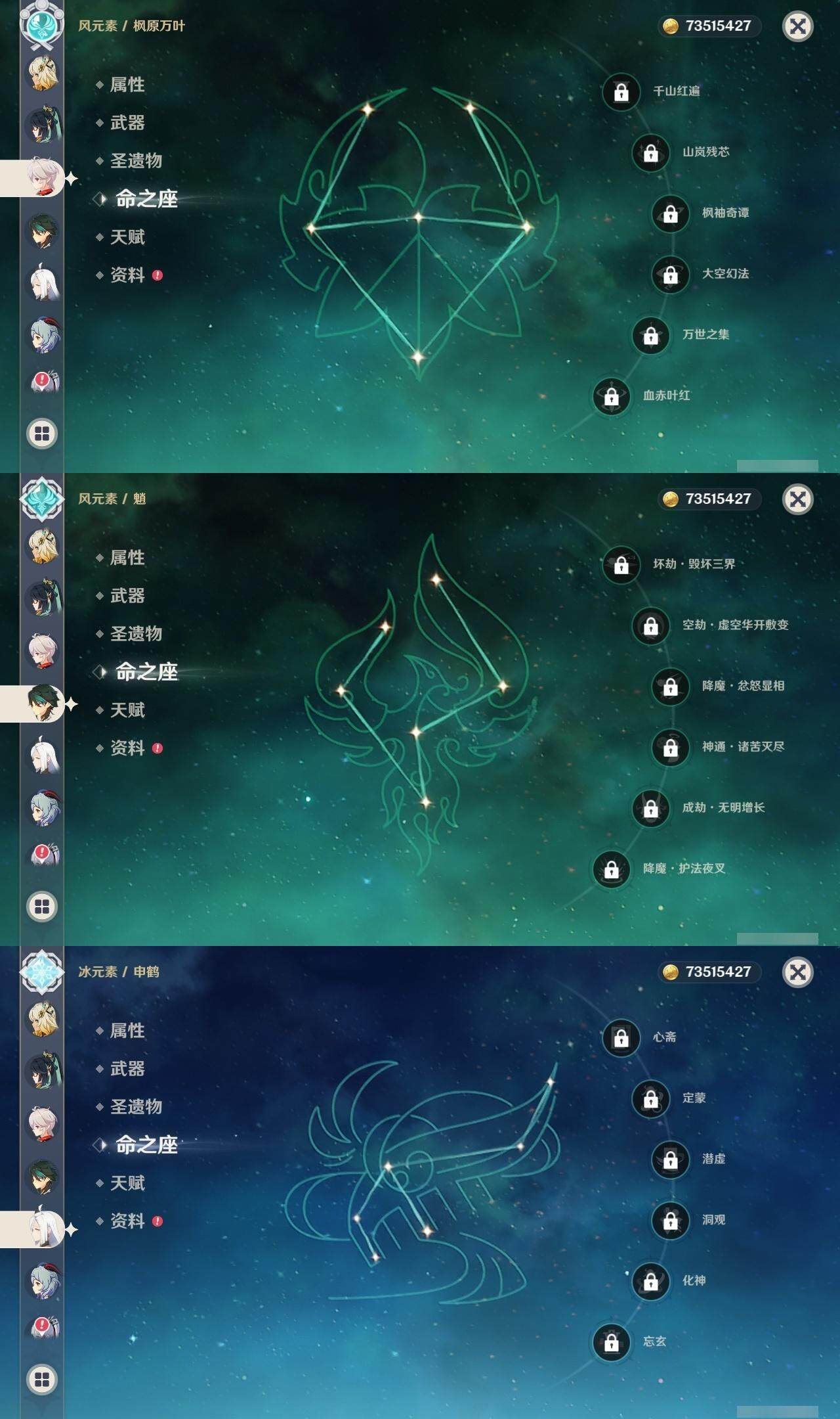 0命阿蕾奇诺,0命闲云,0命芙宁娜,1命那维莱特,1命迪希雅,0命艾尔海森,0命纳西妲,1命提纳里,0命神里绫人,0命申鹤,0命雷电将军,0命枫原万叶,0命神里绫华,0命钟离,0命甘雨,0命魈,0命可莉,0命达达利亚,1命刻晴,满命七七,1命琴,4命莫娜,0命迪卢克,0命基尼奇,0命希诺宁,0命玛薇卡,精1万世流涌大典,精1裁叶萃光,精1若水,精1波乱月白经津,精1息灾,精1薙草之稻光,精1四风原典,精1和璞鸢,精1天空之翼,精2阿莫斯之弓,精1天空之卷,精1山王长牙