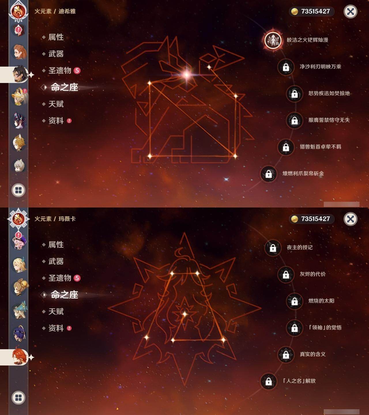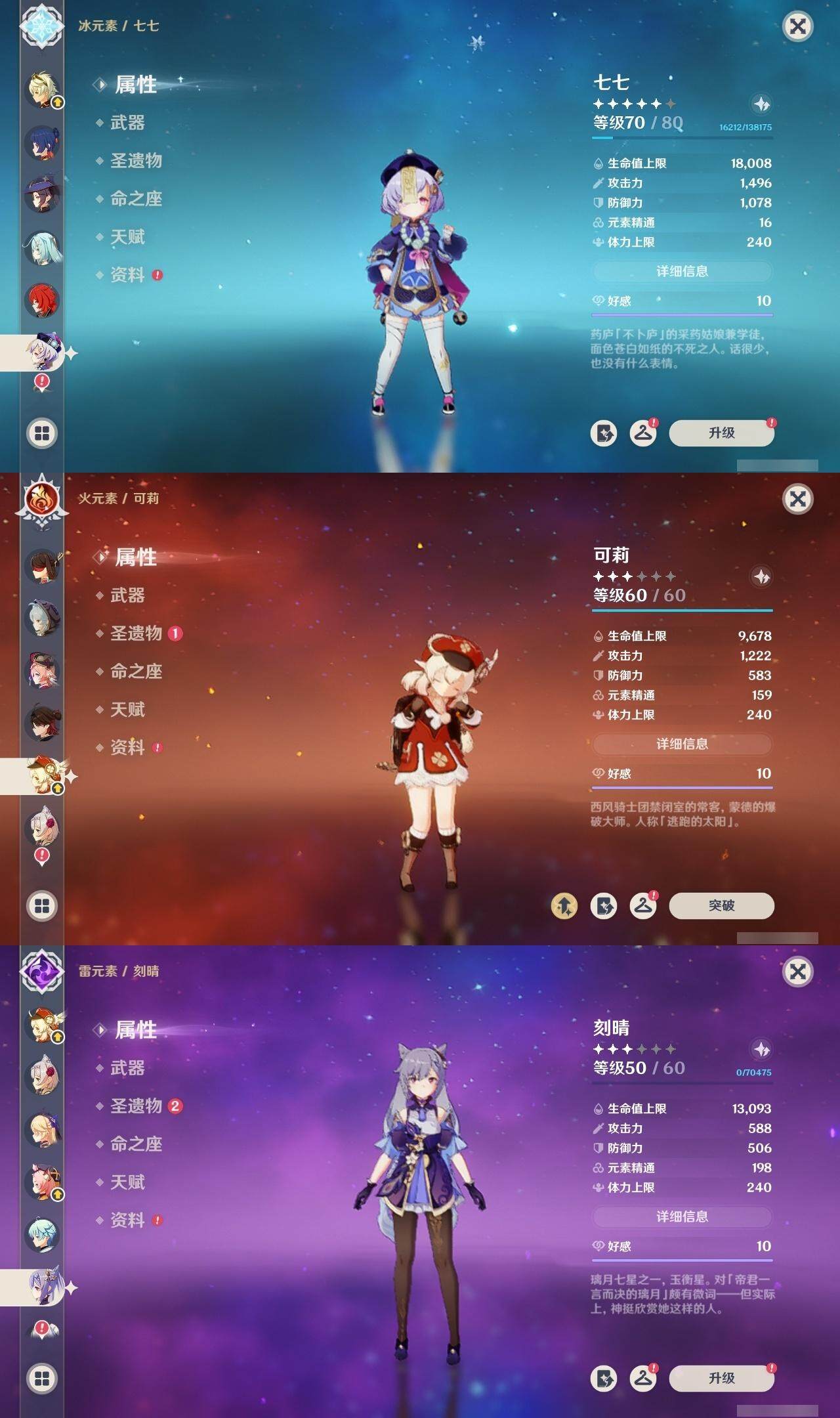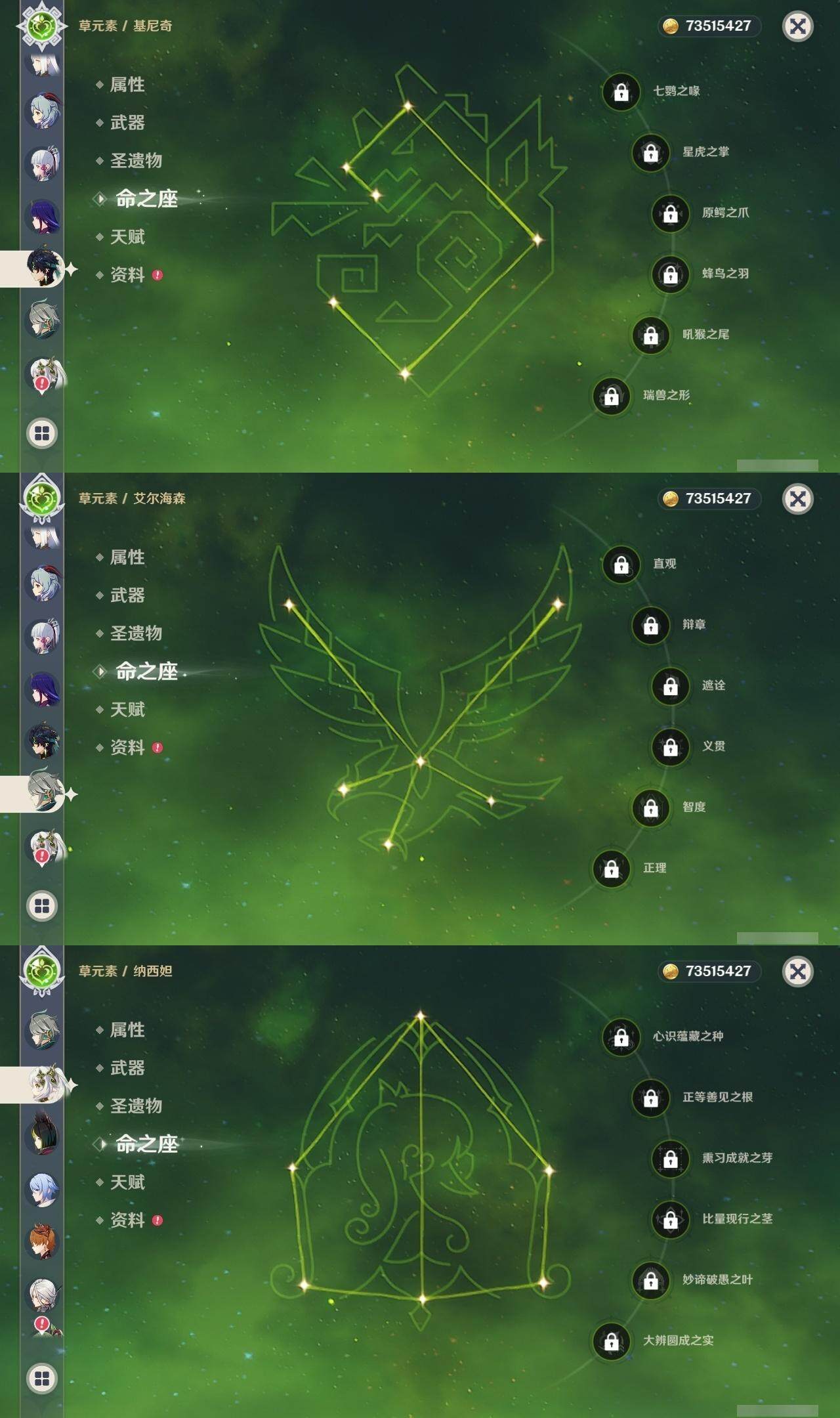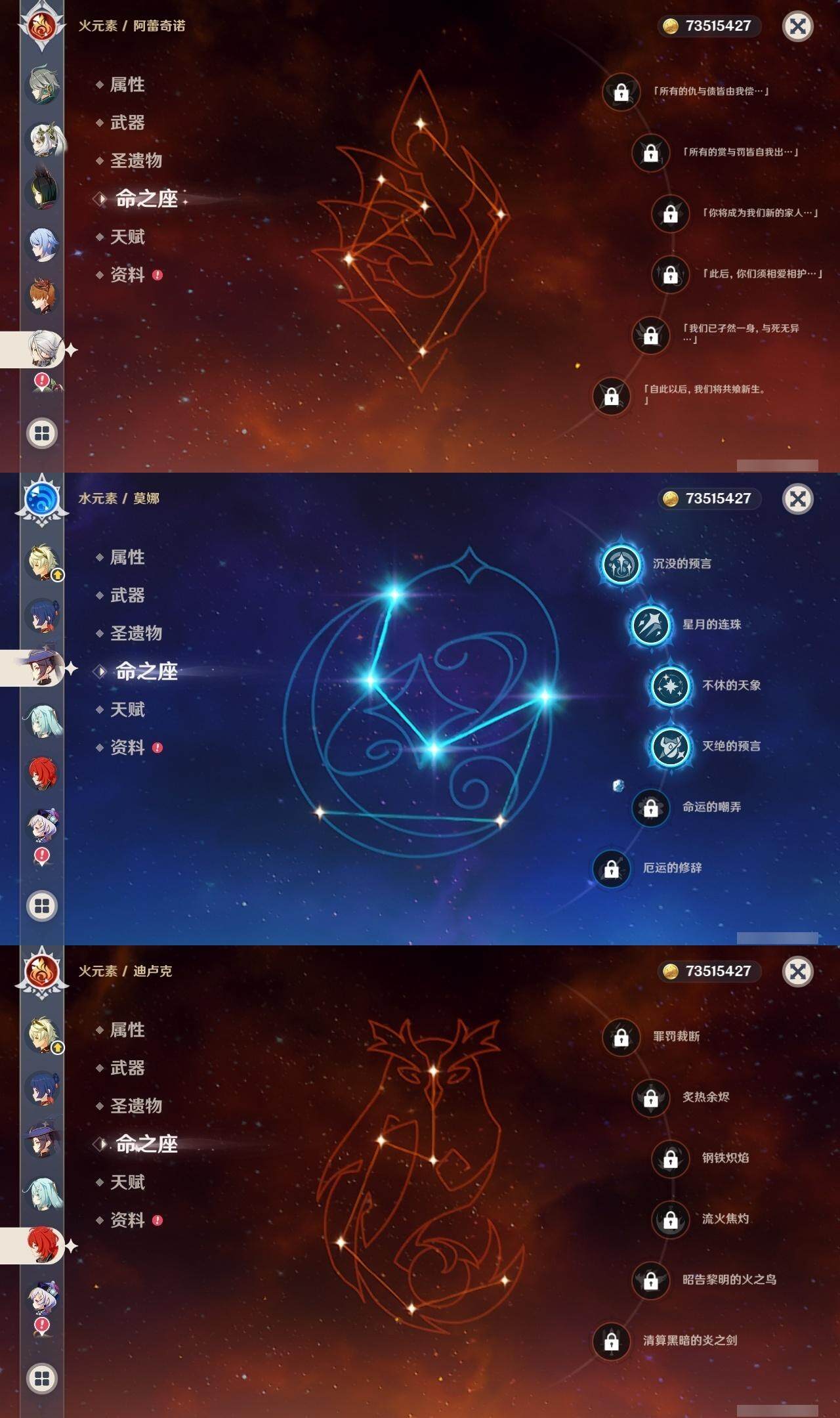 0命阿蕾奇诺,0命闲云,0命芙宁娜,1命那维莱特,1命迪希雅,0命艾尔海森,0命纳西妲,1命提纳里,0命神里绫人,0命申鹤,0命雷电将军,0命枫原万叶,0命神里绫华,0命钟离,0命甘雨,0命魈,0命可莉,0命达达利亚,1命刻晴,满命七七,1命琴,4命莫娜,0命迪卢克,0命基尼奇,0命希诺宁,0命玛薇卡,精1万世流涌大典,精1裁叶萃光,精1若水,精1波乱月白经津,精1息灾,精1薙草之稻光,精1四风原典,精1和璞鸢,精1天空之翼,精2阿莫斯之弓,精1天空之卷,精1山王长牙