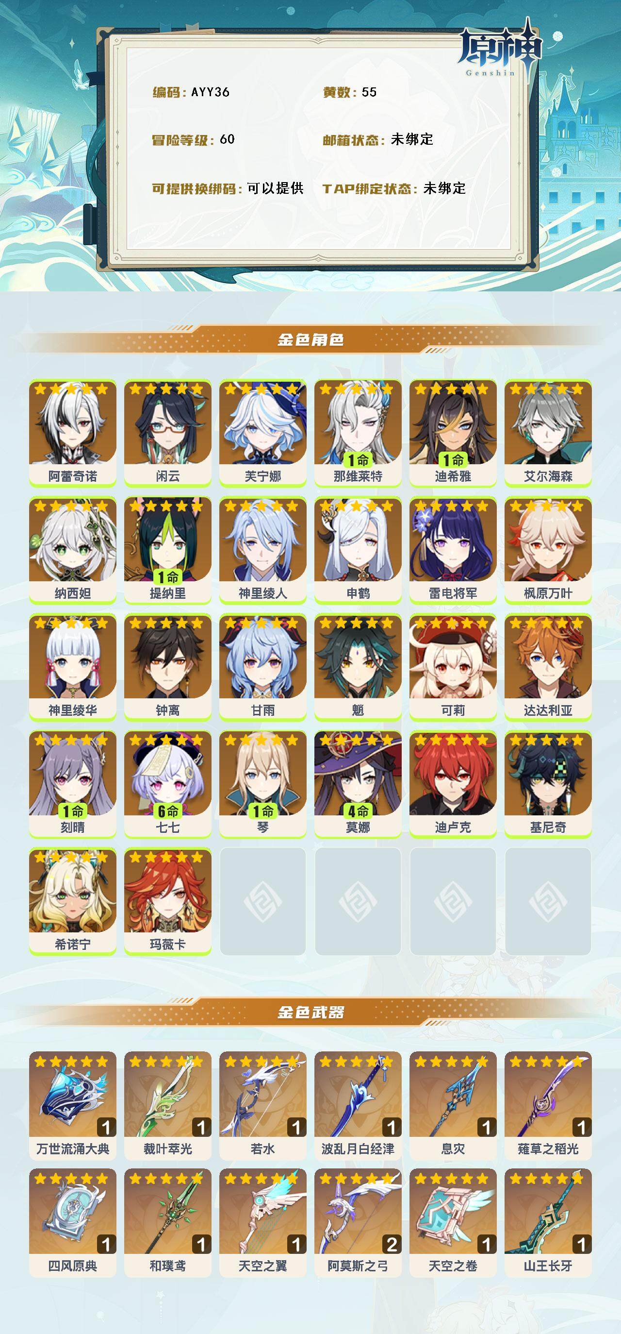 [14744040]60级/55黄/男主/26个五星角色/13个五星武器 0命阿蕾奇诺,0命闲云,0命芙宁娜,1命那维莱特,1命迪希雅,0命艾尔海森,0命纳西妲,1命提纳里,0命神里绫人,0命申鹤,0命雷电将军,0命枫原万叶,0命神里绫华,0命钟离,0命甘雨,0命魈,0命可莉,0命达达利亚,1命刻晴,满命七七,1命琴,4命莫娜,0命迪卢克,0命基尼奇,0命希诺宁,0命玛薇卡,精1万世流涌大典,精1裁叶萃光,精1若水,精1波乱月白经津,精1息灾,精1薙草之稻光,精1四风原典,精1和璞鸢,精1天空之翼,精2阿莫斯之弓,精1天空之卷,精1山王长牙