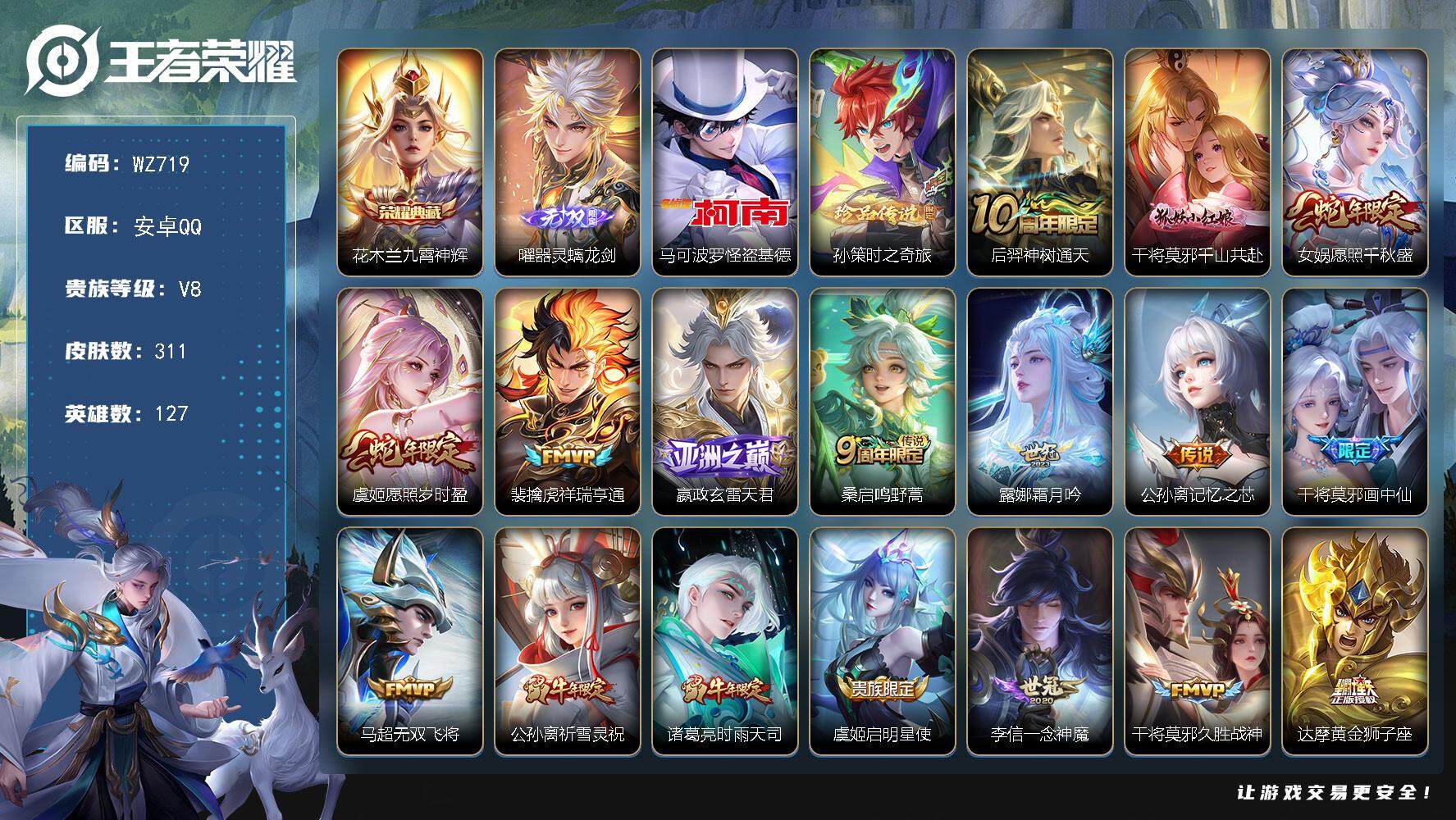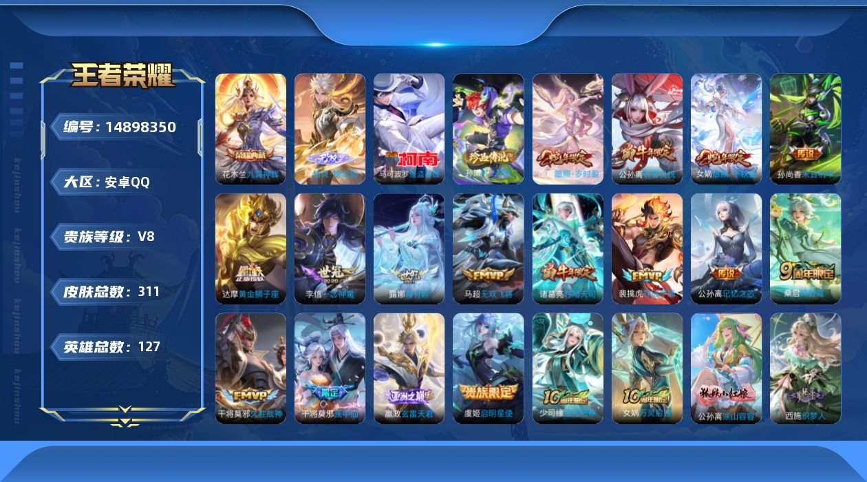 - [12980589]安卓Q-V8-至尊星耀V段位-124英雄-211皮肤-1典藏-0珍品无双-0无双-0珍品传说-25传说-74史诗 【荣耀典藏】:貂蝉幻阙歌 【传说皮肤】:女娲愿照千秋盛,虞姬愿照岁时盈,桑启鸣野蒿,宫本武藏惊梅引,澜电玩雷克斯,花木兰燃星之曲,孙悟空齐天大圣,曜山海苍雷引,李信山海炽霜斩,吕布怒海麟威,李白诗剑行,娜可露露前尘镜,马可波罗深海之息,后羿无尽星芒,马超无双飞将,诸葛亮时雨天司,铠绛天战甲,虞姬启明星使,曜云鹰飞将,李信一念神魔,刘备时之恋人,貂蝉猫影幻舞,梦奇胖达荣荣,孙尚香末日机甲,宫本武藏地狱之眼 【限定皮肤】:姜子牙天穹之誓,狄仁杰阴阳师,赵云皇家上将,赵云引擎之心,孙尚香蔷薇恋人,庄周高山流水,钟无艳超时空战士,扁鹊奇幻香踪,元歌无心,甄姬游园惊梦,甄姬落雪兰心,典韦岱宗,马可波罗暗影游猎,马可波罗深海之息,狄仁杰魔术师,狄仁杰万华元夜,达摩沙漠行僧,项羽海滩派对,露娜一生所爱,韩信傲雪梅枪,王昭君午后时光,兰陵王金庭之子,花木兰瑞麟志,花木兰燃星之曲,娜可露露前尘镜,孙悟空孙行者,孙悟空齐天大圣,后羿无尽星芒,李元芳云中旅人,虞姬启明星使,钟馗驱傩正仪,杨戬潮玩骑兵,干将莫邪真爱魔法,雅典娜黎明之约,鬼谷子原初探秘者,鬼谷子五谷丰年,诸葛亮时雨天司,铠青龙志,苏烈千军破阵,沈梦溪大漠名商,沈梦溪匿光破解者,裴擒虎擒涛扼浪,狂铁电玩高手,云中君时之祈愿,李信山海炽霜斩,上官婉儿梁祝,嫦娥拒霜思,嫦娥暖冬兔眠,曜山海苍雷引,西施玲珑珍味,鲁班大师探海日志,桑启海盐诗旅,暃星界游侠,戈娅驭风魔法,艾琳女武神,艾琳流音漫舞,司空震地狱燃心,阿古朵江河有灵,张良古海寻踪,蒙犽百解令,鬼谷子天穹祈灯,周瑜熔金海岸 【年限皮肤】:花木兰瑞麟志,铠青龙志,诸葛亮时雨天司,典韦岱宗,李信山海炽霜斩,曜山海苍雷引 【赛季限定】:狄仁杰万华元夜,达摩沙漠行僧,兰陵王金庭之子,张良古海寻踪,李元芳云中旅人,钟馗驱傩正仪,雅典娜黎明之约,鬼谷子原初探秘者,苏烈千军破阵,沈梦溪大漠名商,裴擒虎擒涛扼浪,鲁班大师探海日志,桑启海盐诗旅,鬼谷子天穹祈灯,姜子牙天穹之誓 【战令限定】:钟无艳超时空战士,扁鹊奇幻香踪,甄姬落雪兰心,马可波罗暗影游猎,王昭君午后时光,艾琳流音漫舞,杨戬潮玩骑兵,干将莫邪真爱魔法,狂铁电玩高手,嫦娥暖冬兔眠,西施玲珑珍味,司空震地狱燃心,暃星界游