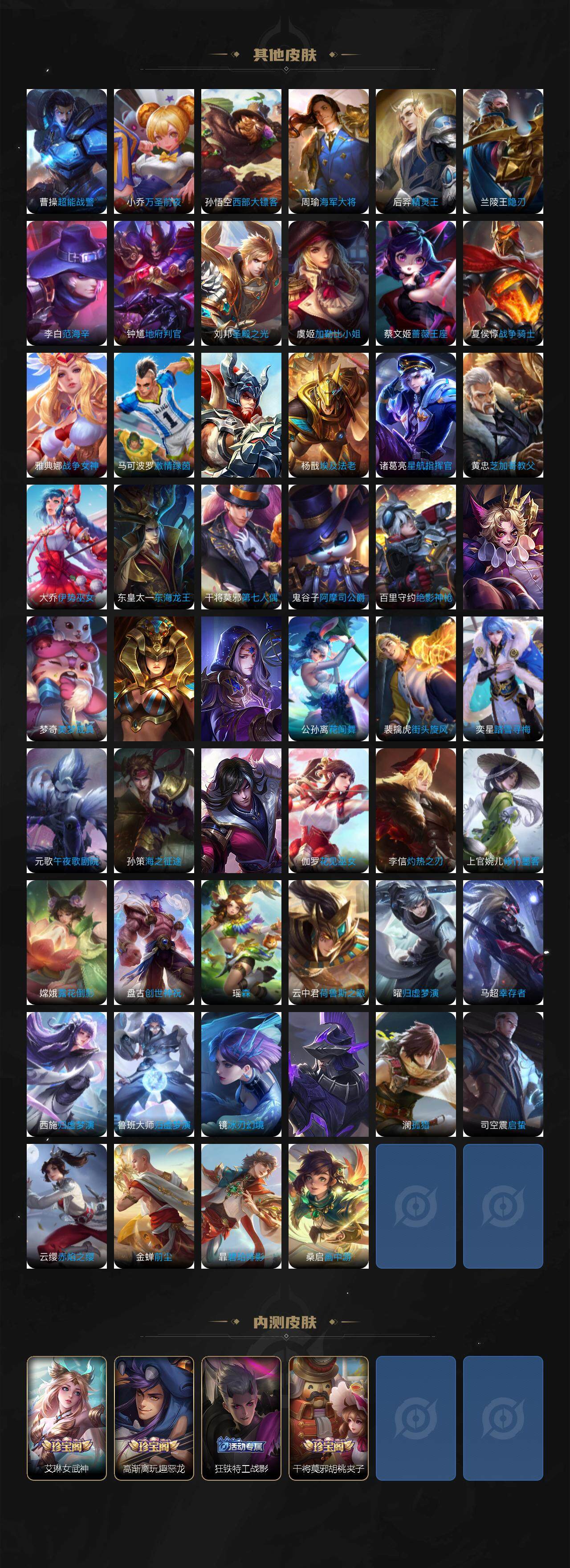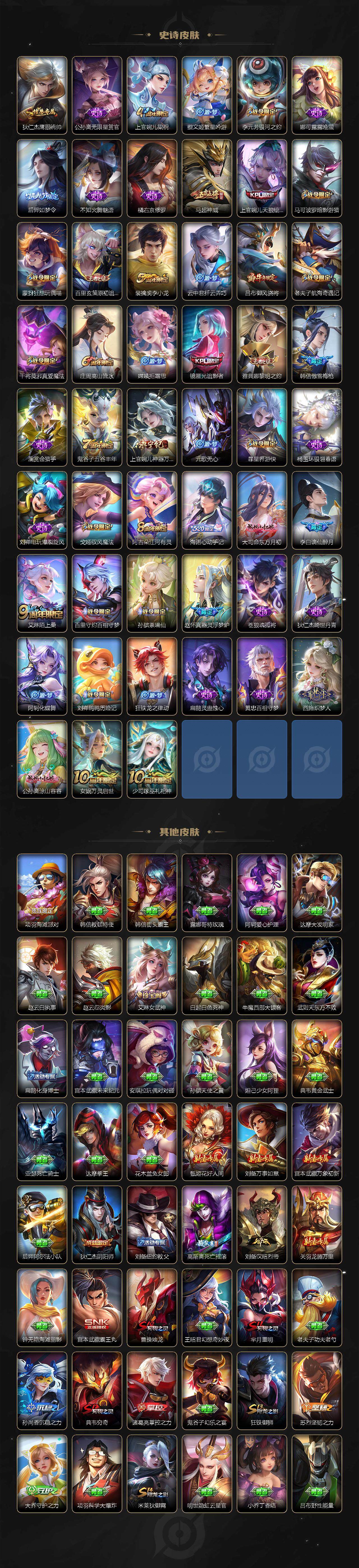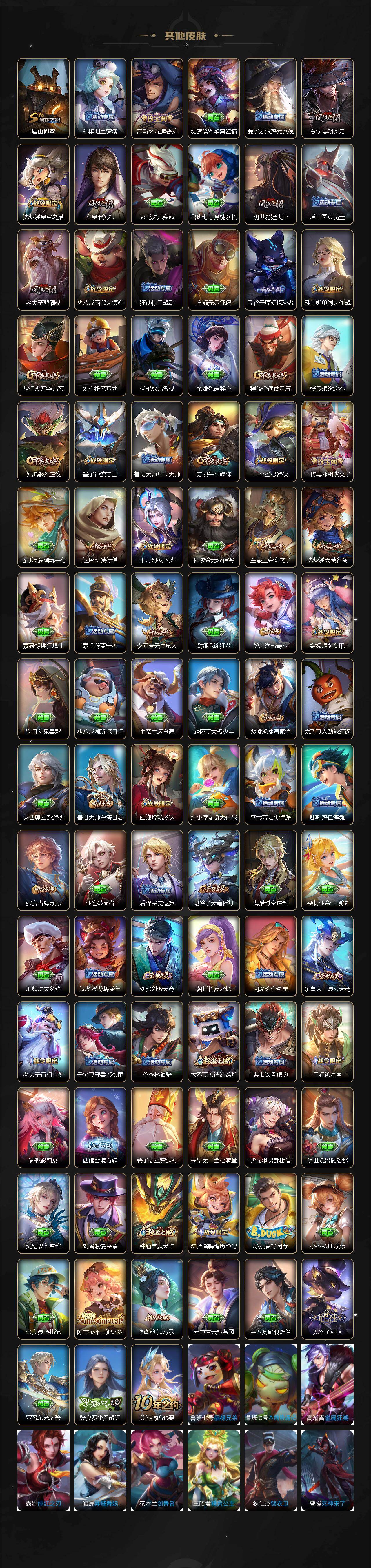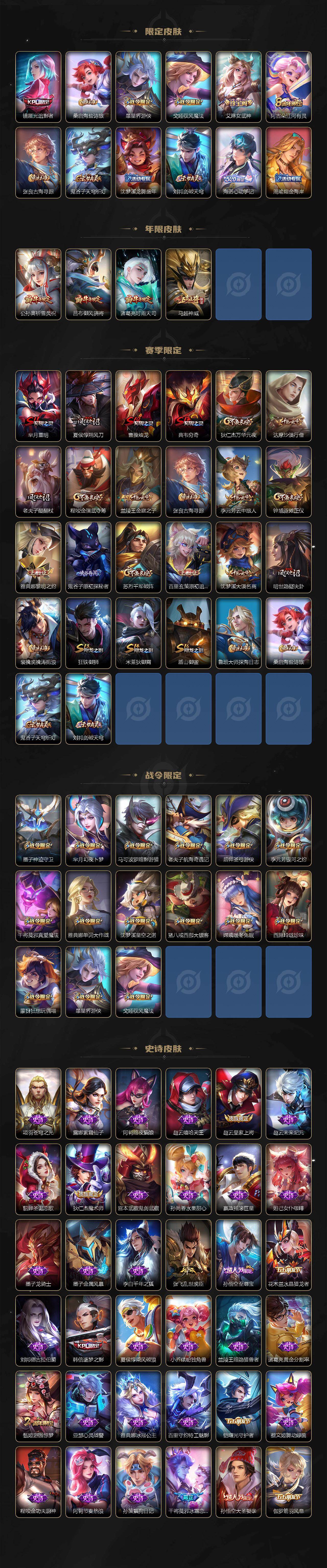 【限定皮肤】:李白谪仙醉月,狄仁杰阴阳师,赵云皇家上将,墨子神迹守卫,庄周高山流水,高渐离死亡摇滚,高渐离玩趣恶龙,芈月重明,芈月幻夜卜梦,吕布御风骁将,元歌无心,夏侯惇朔风刀,甄姬游园惊梦,曹操烛龙,典韦穷奇,马可波罗暗影游猎,狄仁杰魔术师,狄仁杰万华元夜,达摩沙漠行僧,项羽海滩派对,老夫子醍醐杖,老夫子航海奇遇记,程咬金演武夺筹,韩信逐梦之影,韩信傲雪梅枪,兰陵王金庭之子,孙悟空至尊宝,孙悟空大圣娶亲,后羿如梦令,后羿圣弓游侠,李元芳银河之约,李元芳云中旅人,虞姬启明星使,钟馗驱傩正仪,干将莫邪冰霜恋舞曲,干将莫邪胡桃夹子,干将莫邪真爱魔法,干将莫邪画中仙,雅典娜单词大作战,雅典娜黎明之约,蔡文姬繁星吟游,鬼谷子原初探秘者,鬼谷子五谷丰年,诸葛亮时雨天司,苏烈千军破阵,百里玄策原初追逐者,弈星混沌棋,公孙离祈雪灵祝,沈梦溪星空之诺,沈梦溪大漠名商,明世隐疑决卦,裴擒虎李小龙,裴擒虎擒涛扼浪,狂铁御狮,米莱狄御霄,云中君纤云弄巧,盾山御銮,猪八戒西部大镖客,上官婉儿梁祝,上官婉儿天狼绘梦者,上官婉儿神器万象笔,嫦娥拒霜思,嫦娥暖冬兔眠,西施玲珑珍味,蒙犽狂想玩偶喵,鲁班大师探海日志,镜匿光追影者,桑启海盐诗旅,暃星界游侠,戈娅驭风魔法,艾琳女武神,阿古朵江河有灵,张良古海寻踪,鬼谷子天穹祈灯,沈梦溪龙舞盛年,刘邦剑破天穹,海诺心动手记,周瑜熔金海岸