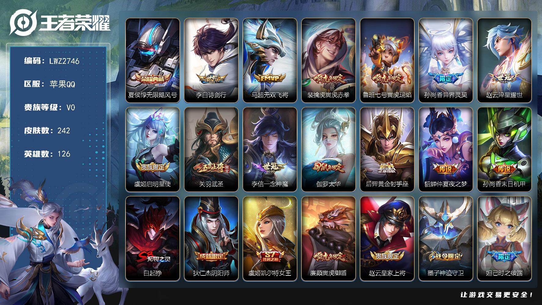 [14904315]苹果Q-V0-永恒钻石II段位-126英雄-242皮肤-1典藏皮肤-13传说-79史诗