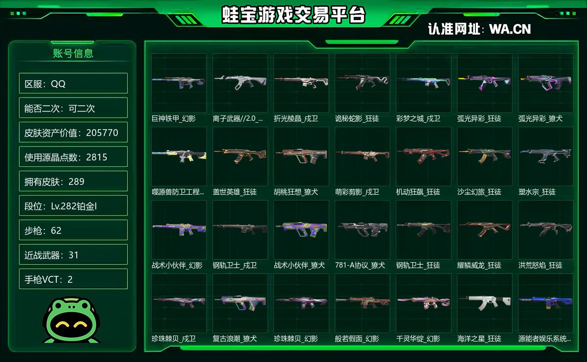 QQ 可二次 皮肤资产价值205770 使用源晶点数2815 拥有皮肤289 段位Lv.282铂金I 步枪62 近战武器31 手枪VCT2 手枪49 狙击枪27 套装17 霰弹枪12 机枪14 冲锋枪21 英雄27 热门卡面14 热门挂饰30