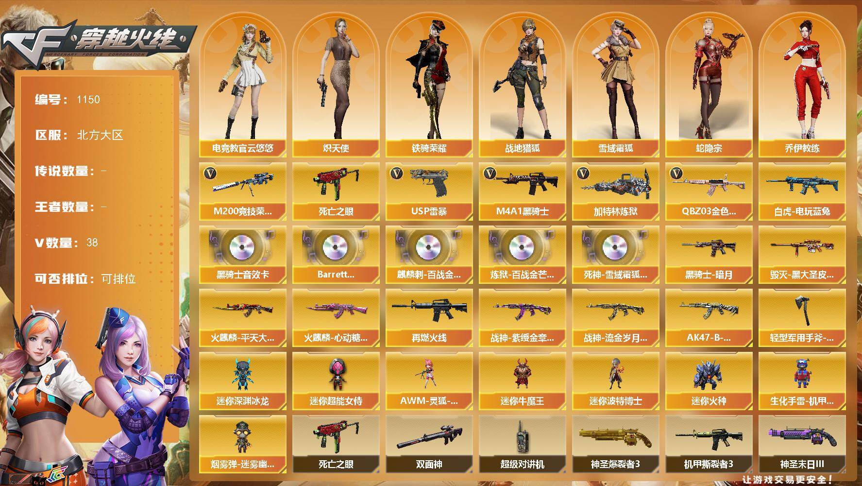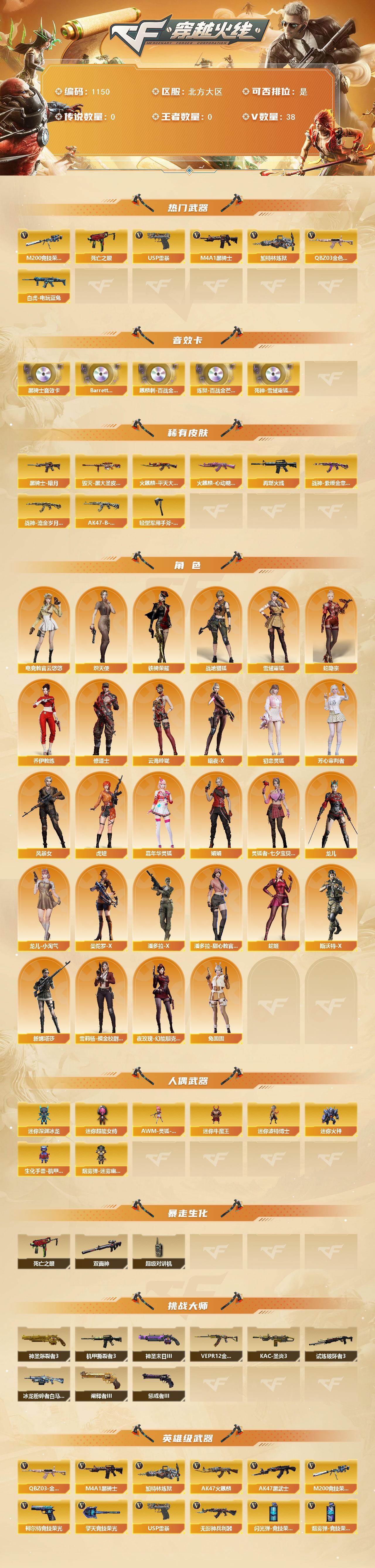 [14916024]北方大区-38V-0王者-0炫金 【热门武器】:QBZ03-金色蔷薇,M200-竞技荣光,死亡之眼,白虎-电玩蓝兔,M4A1-黑骑士,加特林-炼狱,USP-雷暴 【音效卡】:M4A1-黑骑士音效卡,Barrett-碧霄极光音效卡,麒麟刺-百战金芒-盛典舞曲音效卡,炼狱-百战金芒-庆典舞曲音效卡,死神-雪域霜狐-怀旧音效卡 【皮肤】:M4A1-再燃火线,火麒麟-平天大圣,火麒麟-心动糖果,毁灭-