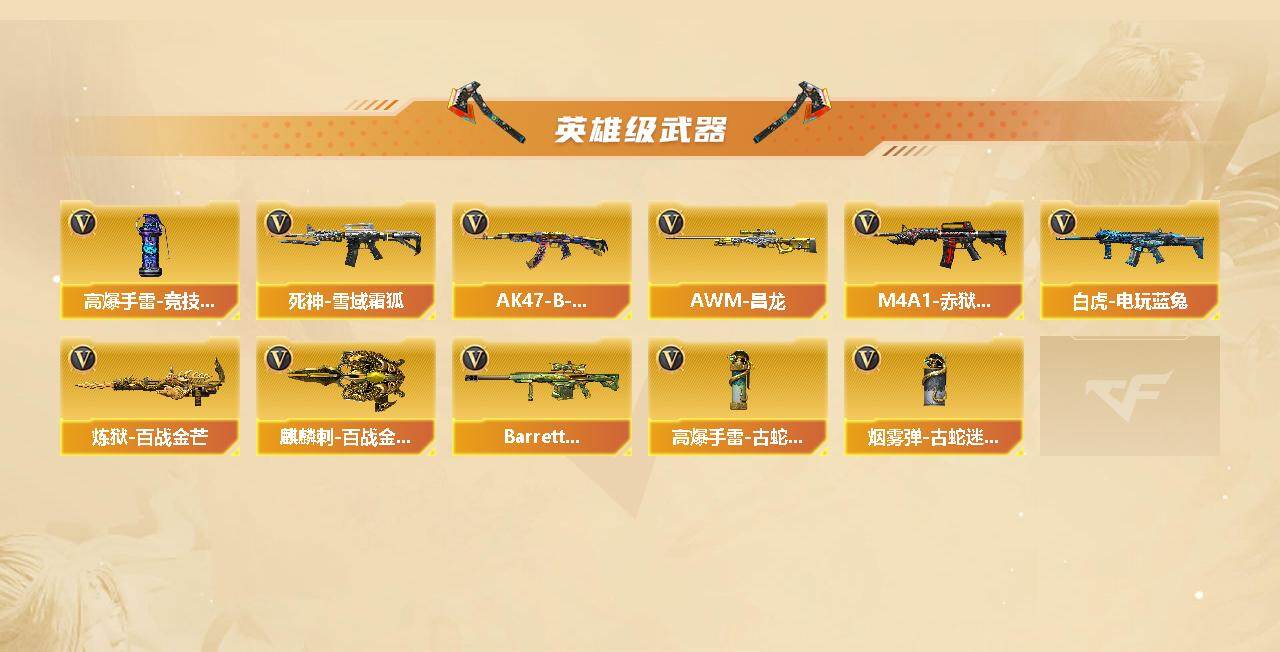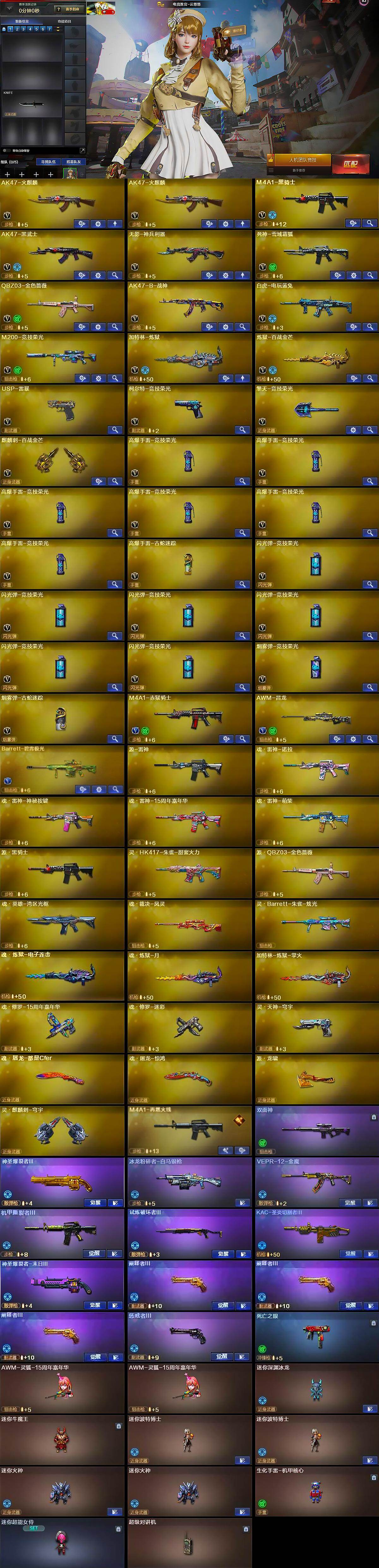 - [12904775]河南一区-37V-10王者-2炫金 【热门武器】:M200-竞技荣光,荣耀世冠-柯尔特,加特林-炼狱,裁决-雪莉杨,USP-雷暴,沙鹰-修罗*3 【王者炫金武器】:雷霆王者之锋*2,炫金骑士,炫金武士 【音效卡】:M4A1-雷神音效卡,Barrett-毁灭音效卡 【稀有皮肤】:雷神-星空,火麒麟-盘古,修罗-星空 【角色】:零,电竞教官-云悠悠,王者-零,零-水下丽影 【人偶武器】:裁决-雪莉杨,迷你波特博士,迷你火种,迷你生化手雷 【挑战大师】:阐释者III 【英雄级武器】:AK47-火麒麟,M4A1-黑龙,M4A1-雷神,AK47-黑武士*3,M4A1-武圣*2,AWM-天龙,Barrett-毁灭,Barrett-极光,AWM-裁决,Barrett-朱雀,M200-竞技荣光,加特林-炼狱,AA-12-雷霆,沙鹰-修罗*3,沙鹰-天神,USP-雷暴,柯尔特-竞技荣光,荣耀世冠-柯尔特,屠龙,擎天,麒麟刺*2,擎天-竞技荣光,高爆手雷-竞技荣光*2,闪光弹-竞技荣光*2,烟雾弹-竞技荣光*2 【特殊枪械】:1炼狱