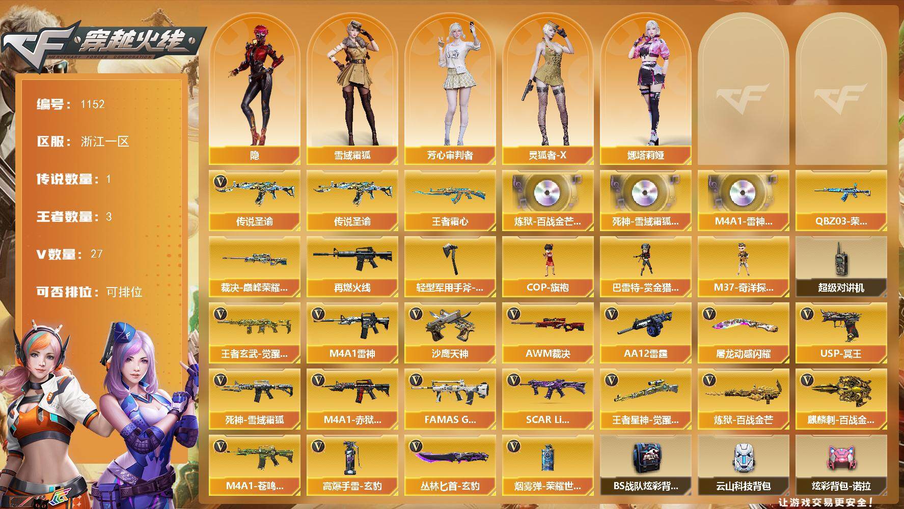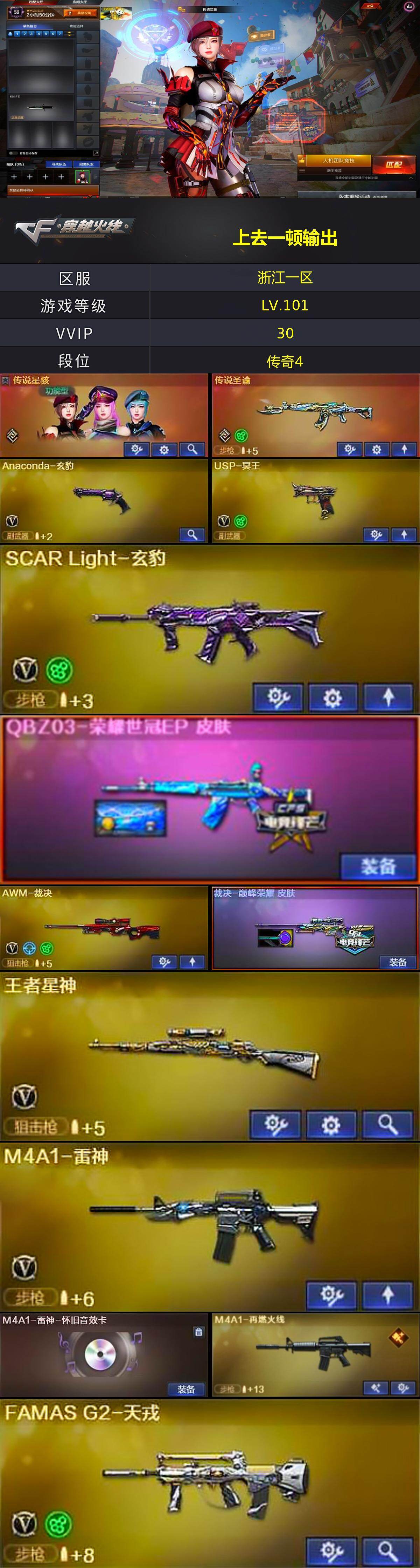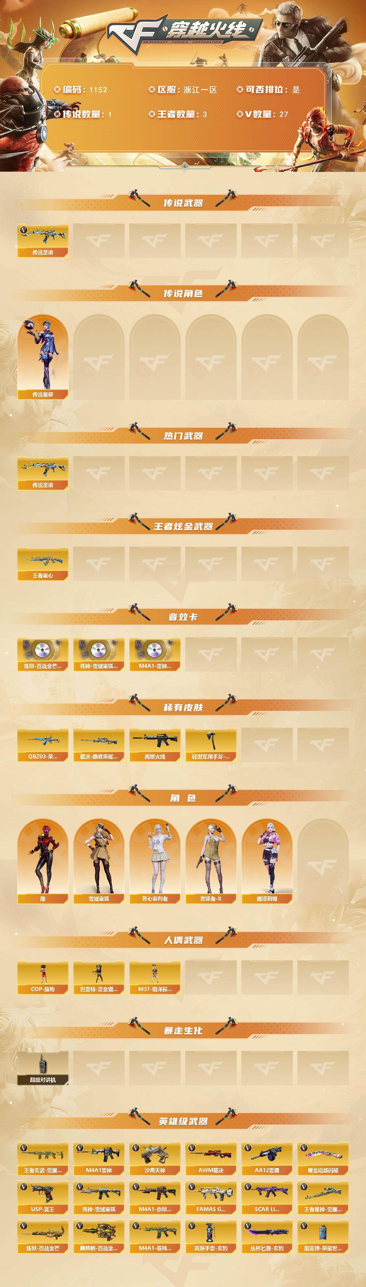 [14917358]浙江一区-27V-3王者-0炫金 【传说武器】:传说圣谕 【传说角色】:传说星骇 【热门武器】:传说圣谕 【王者炫金武器】:王者霜心 【音效卡】:炼狱-百战金芒-庆典舞曲音效卡,死神-雪域霜狐-怀旧音效卡,M4A1-雷神-怀旧音效卡 【皮肤】:QBZ03-荣耀世冠EP 皮肤,裁决-巅峰荣耀 皮肤,M4A1-再燃火线,轻型军用手斧-再燃火线 【角色】:隐,雪域霜狐,芳心审判者,灵狐者-X,娜塔莉