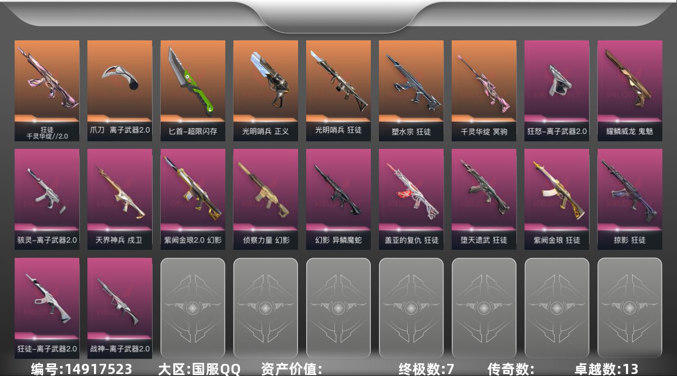 [14917523]【套装】:离子武器//2.0套装 【英雄】:幻棱,炼狱,维斯,暮蝶,钛狐,壹决,铁臂,捷风,雷兹,幽影,不死鸟,贤者,猎枭,蝰蛇,零,芮娜,奇乐,尚勃勒,霓虹,斯凯,夜露,星礈,K/O,海神,盖可,黑梦,钢锁 【近战武器】:近战武器-离子武器//2.0 爪刀,近战武器-超限闪存 匕首 【狂徒】:狂徒-光明哨兵,狂徒-塑水宗,狂徒-千灵华绽//2.0,狂徒-堕天遗武,狂徒-掠影,狂徒-盖亚的复仇,狂徒-紫阙金琅,狂徒-离子武器//2.0,狂徒-彩虹魔力小白马 【幻影】:幻影-侦察力量,幻影-紫阙金琅//2.0,幻影-异鳞魔蛇,幻影-超限闪存 【戍卫】:戍卫-天界神兵,戍卫-浮光跃金 【獠犬】:獠犬-模拟赫兹 【冥驹】:冥驹-千灵华绽,冥驹-模拟赫兹 【莽侠】:莽侠-超限闪存 【战神】:战神-离子武器//2.0,战神-浮光跃金 【雄鹿】:雄鹿-模拟赫兹 【骇灵】:骇灵-离子武器//2.0,骇灵-浮光跃金 【蜂刺】:蜂刺-超限闪存 【标配】:标配-超能偶像,标配-浮光跃金 【正义】:正义-光明哨兵,正义-超限闪存,正义-纳米打击 【鬼魅】:鬼魅-耀鳞威龙,鬼魅-模拟赫兹 【狂怒】:狂怒-离子武器//2.0 【卡面】:终章:激斗汉堡 卡面,进入射程 卡面,《双城之战》拥抱 卡面,精灵大战 卡面,欢迎来到底城 卡面,南瓜盛典 卡面,唱片的故事 卡面,钢弓与箭弦 卡面,排除故障 卡面,战术桌游 卡面,悠享食光 卡面,修车达人 卡面,模拟赫兹 卡面,浮光跃金 卡面,超限闪存 卡面,维斯工牌 卡面,正义的化身 卡面,铁之华 卡面,时间到 卡面,最高舞台 卡面,声感陷阱设计图 卡面,梦幻奶茶 卡面,《双城之战》金克丝 卡面,别冒尖 卡面,代号红色 卡面,新兵报到 卡面,V契约 卡面,无畏契约 卡面 【喷漆】:嗨宝南瓜灯 喷漆,嘭! 喷漆,都算到了 喷漆,控场勿近 喷漆,皮蛋呼呼 喷漆,像素星礈 喷漆,图谋不轨的零 喷漆,小丑猫 喷漆,模拟赫兹 喷漆,高丽风情小熊 喷漆,蹲到一个 喷漆,全力集中 喷漆,超限闪存 喷漆,RUA一下 喷漆,熊抱 喷漆,高丽风情小虎 喷漆,记在小本本 喷漆,防弹企鹅 喷漆,高丽风情小蛙 喷漆,超级粉丝 喷漆,捷风差距 喷漆,惊声尖叫 喷漆,拼一枪 喷漆,暴走萝莉 喷漆,胜利属于无畏契约 喷漆,GLHF 喷漆,无畏契约 喷漆 【挂饰】:终章:猫猫木乃伊 挂饰