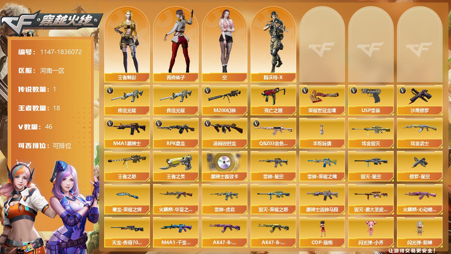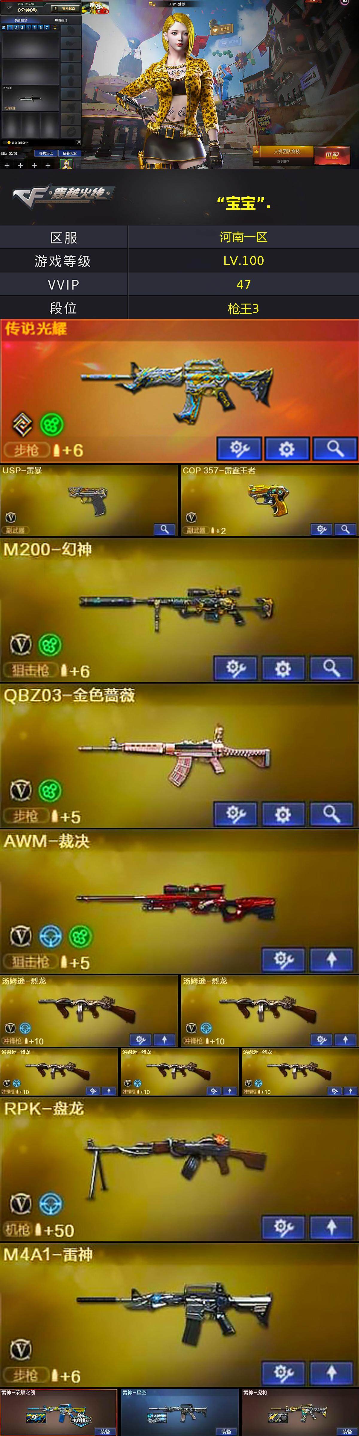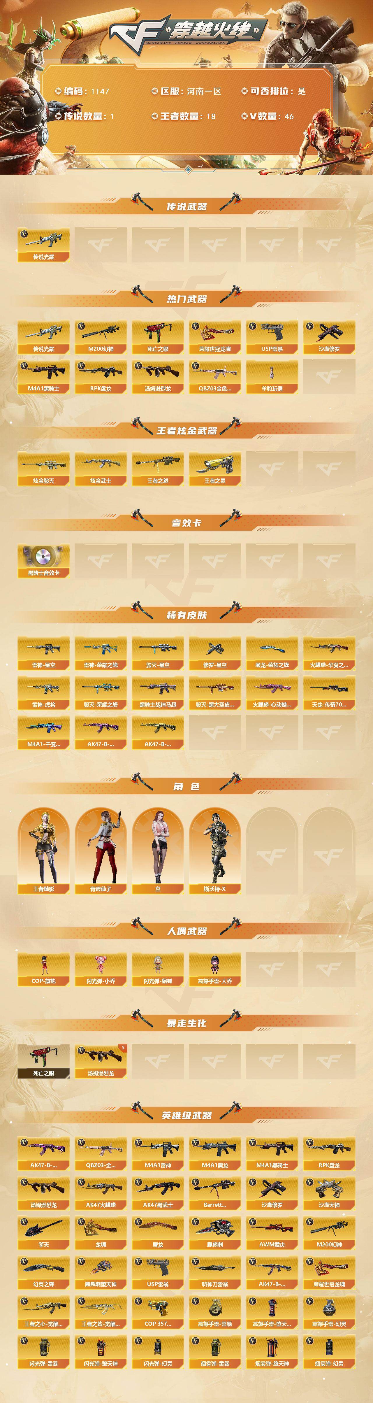 [14918059]河南一区-46V-18王者-2炫金 【传说武器】:传说光耀 【热门武器】:传说光耀,QBZ03-金色蔷薇,M200-幻神,死亡之眼,M4A1-黑骑士,汤姆逊-烈龙*5,RPK-盘龙,羊驼玩偶,USP-雷暴,沙鹰-修罗*2,荣耀世冠-龙啸 【王者炫金武器】:王者之怒,王者之灵,炫金武士,炫金毁灭 【音效卡】:M4A1-黑骑士音效卡 【皮肤】:雷神-荣耀之魄,雷神-星空,雷神-虎将,火麒麟-华夏之