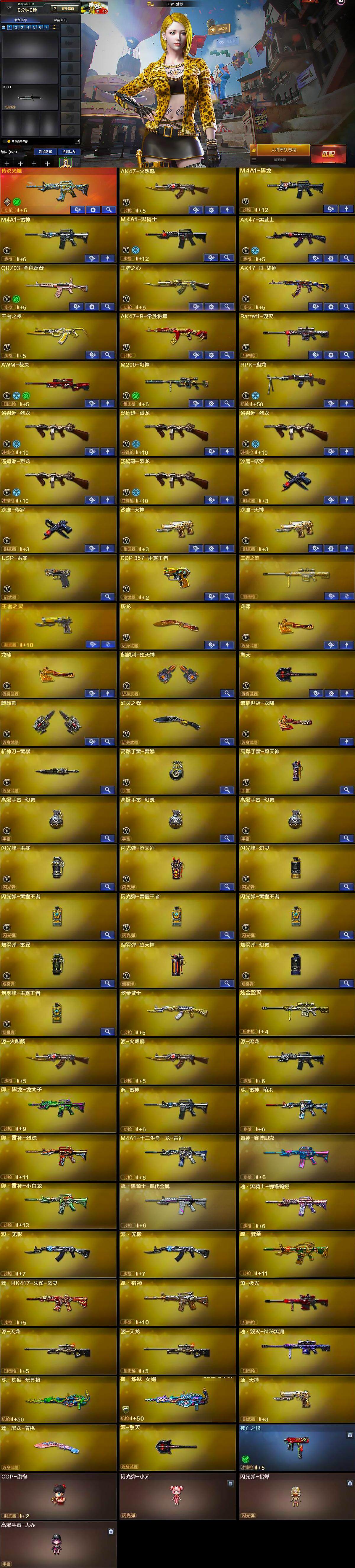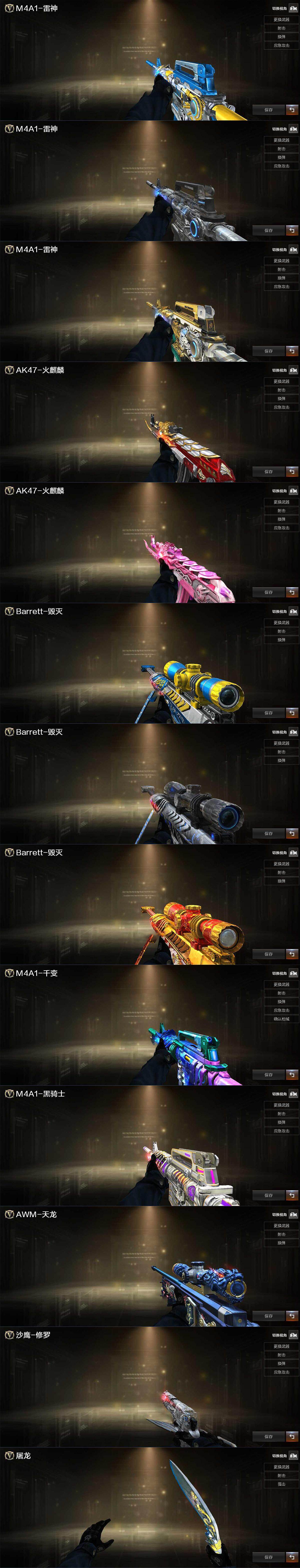 【热门武器】:传说光耀,QBZ03-金色蔷薇,M200-幻神,死亡之眼,M4A1-黑骑士,汤姆逊-烈龙*5,RPK-盘龙,羊驼玩偶,USP-雷暴,沙鹰-修罗*2,荣耀世冠-龙啸