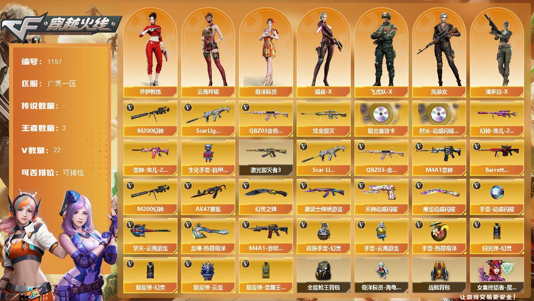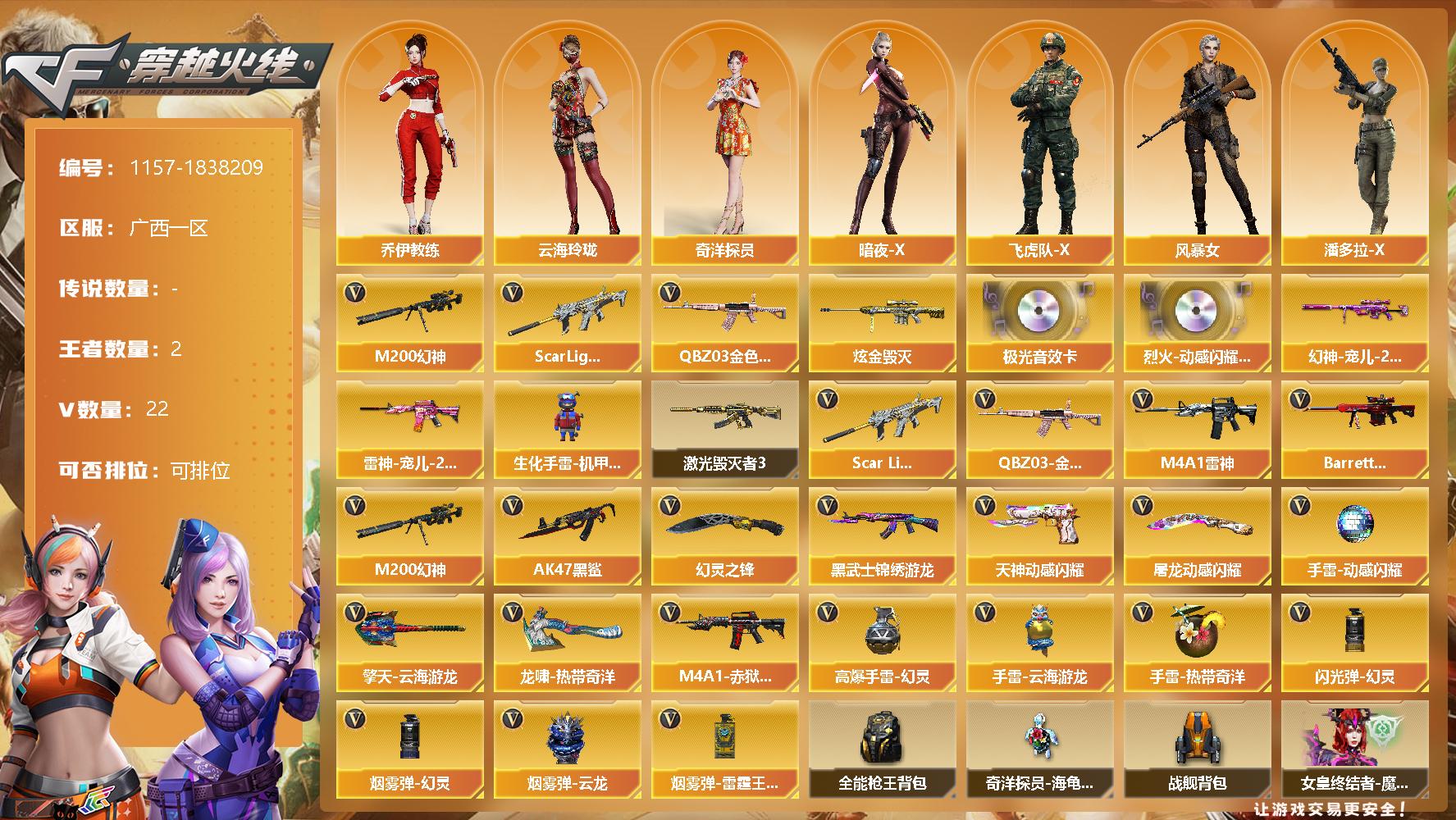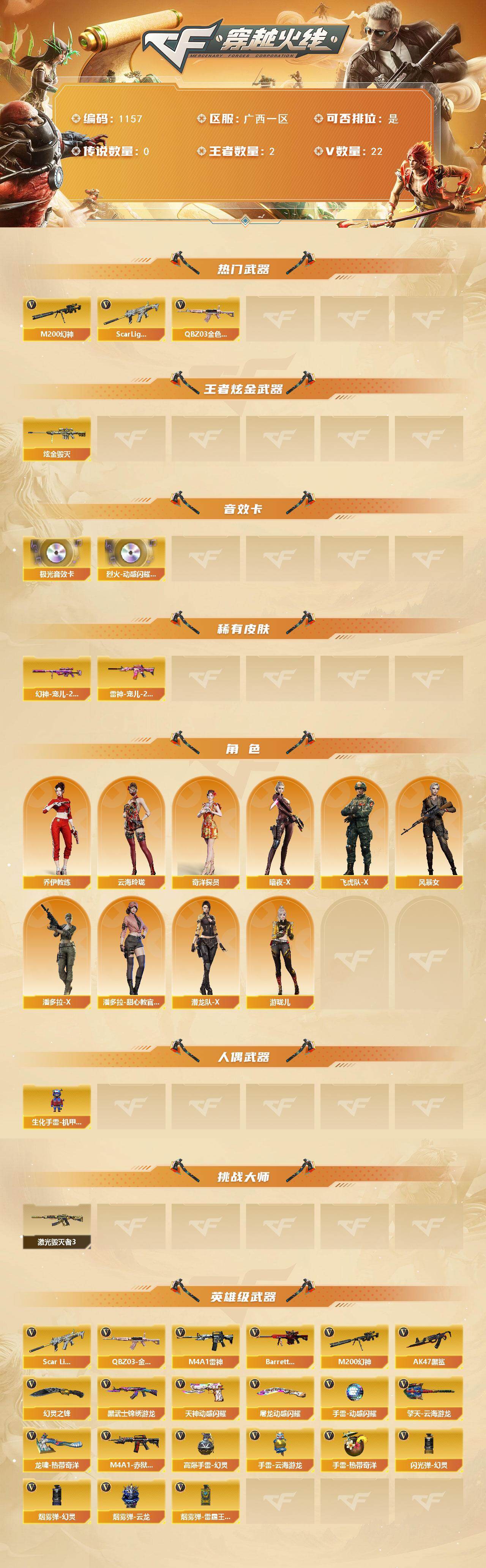 [14918186]广西一区-22V-2王者-1炫金 【热门武器】:QBZ03-金色蔷薇,Scar Light-白虎,M200-幻神*2 【王者炫金武器】:炫金毁灭 【音效卡】:烈火-动感闪耀 音效卡,Barrett-极光音效卡 【皮肤】:幻神-宠儿-2021MVP,雷神-宠儿-2019MVP 【角色】:奇洋探员,乔伊教练,云海玲珑,暗夜-X,飞虎队-X,风暴女,潘多拉-X,潘多拉-甜心教官,潜龙队-X,游珑儿