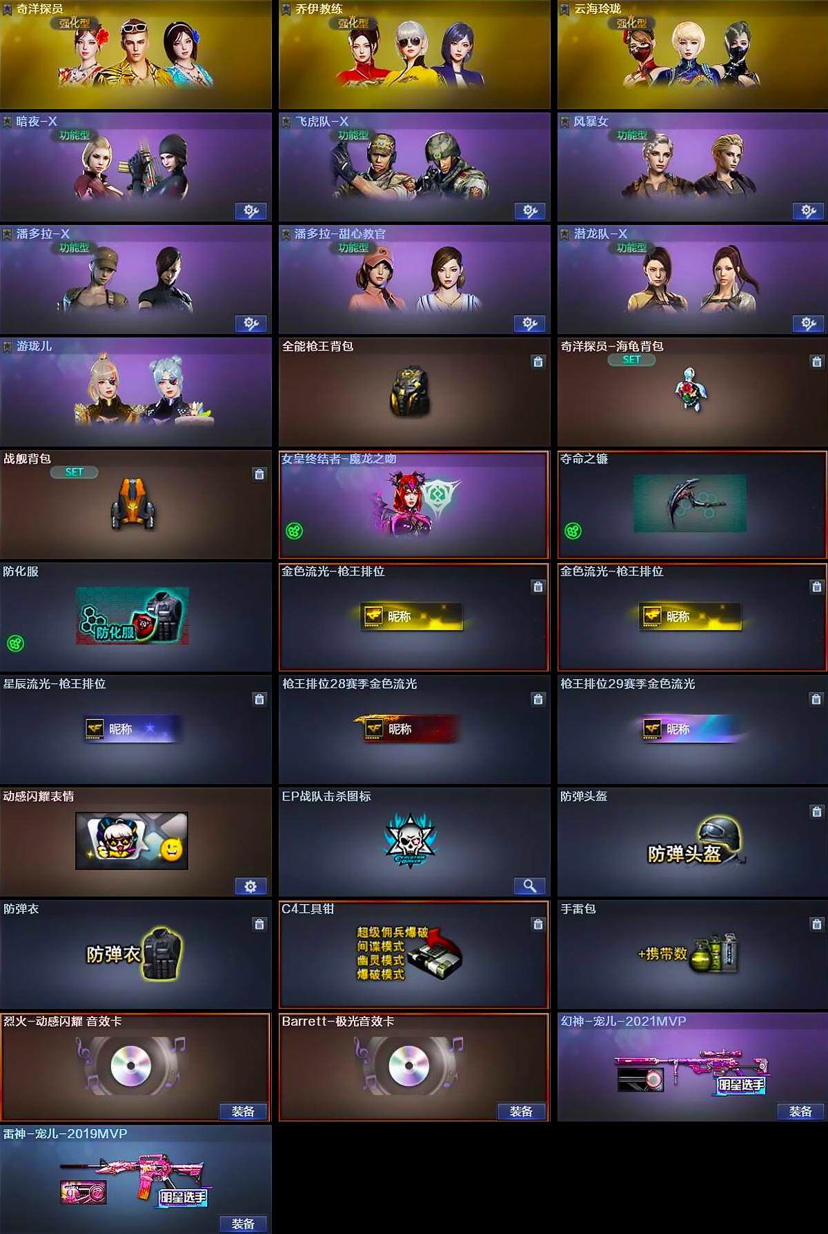- [15247375]山东一区-57V-3王者-1炫金 【热门武器】:QBZ03-金色蔷薇,死亡之眼,M4A1-黑骑士,汤姆逊-烈龙*6,RPK-盘龙,加特林-炼狱*2,沙鹰-修罗*3 【王者炫金武器】:王者芳薇,王者之啸,炫金修罗 【音效卡】:AK47-火麒麟音效卡,M4A1-黑骑士音效卡,Barrett-毁灭音效卡 【皮肤】:雷神-源计划2.0专属 皮肤,M4A1-千变-孔明皮肤,黑龙-能量核心,天龙-能量核心,修罗-能量核心*2 【角色】:葵,魅影,云海玲珑,空,风暴女,娟娟,兰-海滩派对,灵狐者-X,龙儿,麻雀,曼陀罗-X,潘多拉-X,潘多拉-甜心教官,青霞仙子,斯沃特-X,铁骑荣耀,影武者-X,游珑儿 【人偶武器】:Barrett-云海玲珑,AWM-灵狐-15周年嘉年华,迷你裂空之翼*2,迷你波特博士,迷你火种,生化手雷-机甲核心*2,M200-夜玫瑰 【暴走生化】:死亡之眼,超级对讲机 【挑战大师】:神圣爆裂者III,冰龙粉碎者-白马银枪,激光毁灭者III-白马银枪,激光毁灭者III,试炼破坏者III 【英雄级武器】:M4A1-千变,AK47-火麒麟,M4A1-黑龙,M4A1-雷神,M4A1-黑骑士,M4A1-死神,AK47-黑武士,AK12-天启*3,无影-神兵利器,黑武士-锦绣游龙,M4A1-玫瑰精灵*2,QBZ03-金色蔷薇,AWM-天龙*2,Barrett-毁灭*2,王者之力-觉醒版,RPK-盘龙,加特林-炼狱*2,汤姆逊-烈龙*6,AA-12-雷霆*2,沙鹰-修罗*3,沙鹰-天神*3,屠龙*3,擎天,擎天-云海游龙,高爆手雷-雷霆*2,高爆手雷-幻灵,手雷-云海游龙,闪光弹-雷霆*2,闪光弹-幻灵,烟雾弹-雷霆*2,烟雾弹-幻灵*2 【道具】:CFS限定背包,次元之矛-背包,炫彩背包,超级背包*2,黄金超能特工背包,黄金生化钩,绿色巨人,灵魂忍者,迷雾幽灵,生化弹匣,夺命之镰,防化服*2,金色流光-枪王排位,星辰流光-枪王排位,巅峰赛先锋-金色流光,枪王排位28赛季金色流光,云海游龙表情,EP战队名片,EP战队喷图,防弹头盔*3,防弹衣*2,C4工具钳*3,手雷包*2 【特殊枪械】:1黑骑士,6烈龙,1盘龙,2炼狱
