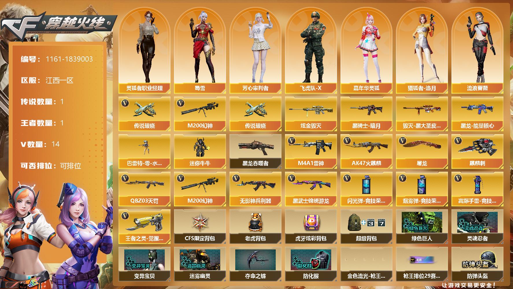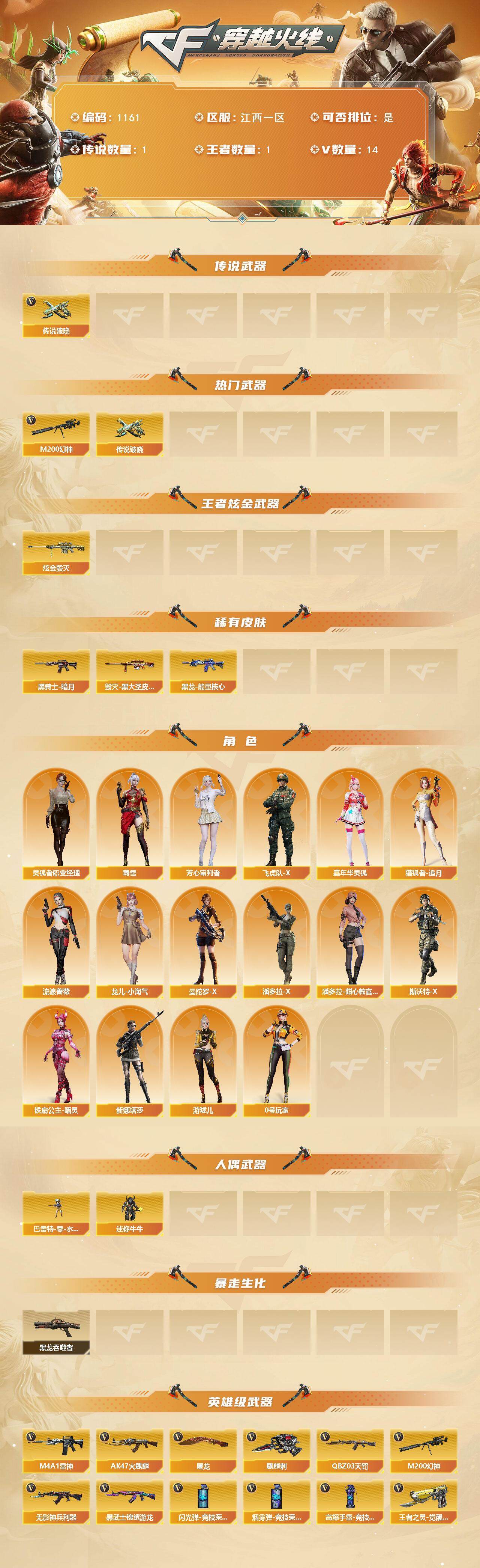 [14918915]江西一区-14V-1王者-1炫金 【传说武器】:传说破晓 【热门武器】:传说破晓,M200-幻神 【王者炫金武器】:炫金毁灭 【皮肤】:毁灭-黑大圣皮肤,黑龙-能量核心,黑骑士-暗月 【角色】:芳心审判者,飞虎队-X,嘉年华灵狐,猎狐者-追月,0号玩家,灵狐者-职业经理,流浪蔷薇,龙儿-小淘气,曼陀罗-X,潘多拉-X,潘多拉-甜心教官,斯沃特-X,蜀雪,铁扇公主-暗灵,新娜塔莎,游珑儿 【人偶