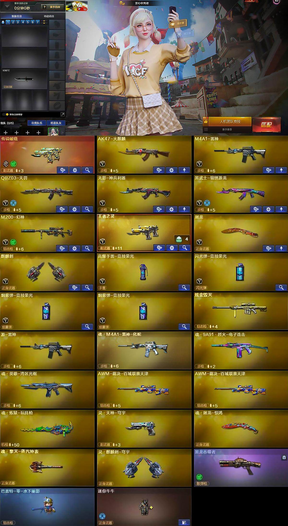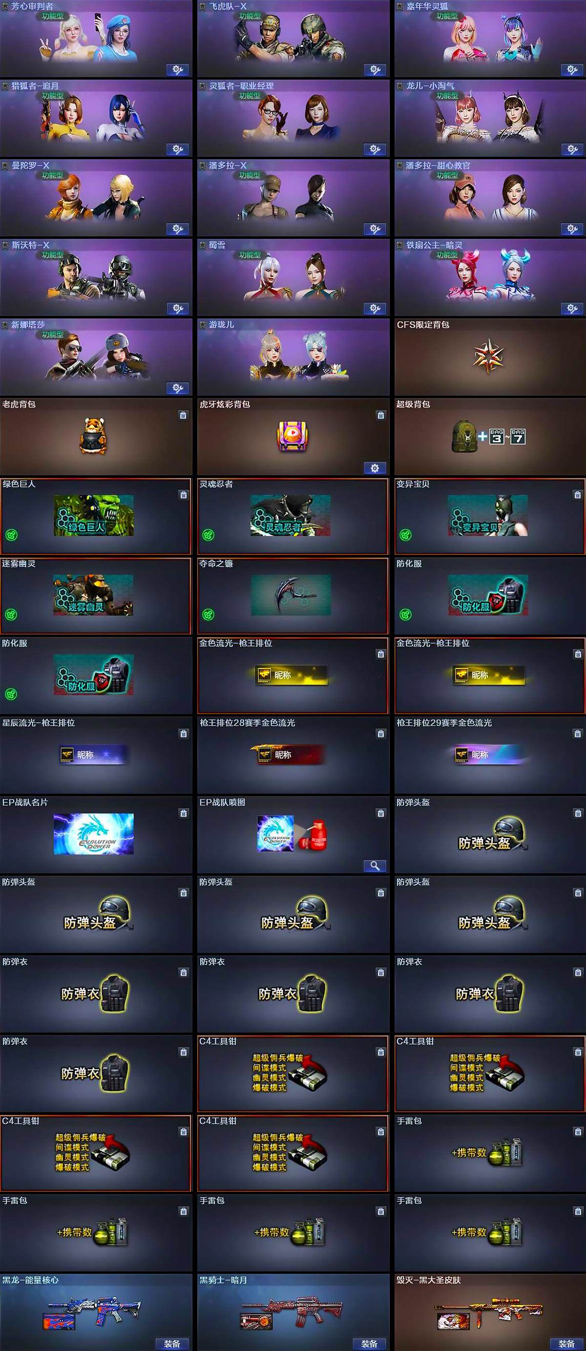 - [15249791]北京一区-44V-6王者-0炫金 【传说武器】:传说破晓 【热门武器】:传说破晓,QBZ03-金色蔷薇,M14EBR-玄武,M200-幻神,金色蔷薇-古蛇迷踪,修罗-古蛇迷踪,COP 357-幻灵,炽芒蝶刃*2 【王者炫金武器】:Barrett-雷霆王者,王者星霆 【音效卡】:M200-幻神音效卡,M4A1-黑骑士音效卡 【皮肤】:幻神-宠儿-2021MVP,幻神-荣耀世冠EP 皮肤,幻神-电竞之星 皮肤,QBZ03-荣耀世冠EP 皮肤,雷神-荣耀之魄,毁灭-星空,毁灭-百城浙江 皮肤,毁灭-虹光风暴 皮肤,毁灭-英雄计划 皮肤,炼狱-玩具枪皮肤 【角色】:影豹,妮妮,王者潘多拉,蛇隐宗,暗夜-X,飞虎队-X,风暴女,娟娟,潘多拉-甜心教官,蛇姬,游珑儿 【人偶武器】:M4A1-雷神-精英刀锋,迷你生化手雷 【暴走生化】:超级对讲机 【挑战大师】:神圣爆裂者-末日III 【英雄级武器】:M4A1-雷神*2,M14EBR-玄武,黑武士-锦绣游龙,金色蔷薇-古蛇迷踪,QBZ03-金色蔷薇,王者之势-觉醒版,王者白虎-觉醒版,QBZ-03-王者蔷薇-觉醒版,Barrett-毁灭,M200-幻神,Barrett-金色蔷薇,COP 357-幻灵,修罗-古蛇迷踪,龙啸,麒麟刺-堕天神,马来剑-夜魔,炽芒蝶刃*2,王者之啸-觉醒版,高爆手雷-堕天神,高爆手雷-夜魔*2,高爆手雷-幻灵*4,高爆手雷-古蛇迷踪,闪光弹-堕天神*2,闪光弹-夜魔,闪光弹-幻灵*4,烟雾弹-堕天神,烟雾弹-夜魔,烟雾弹-幻灵*4,烟雾弹-古蛇迷踪,烟雾弹-荣耀世冠EP*4 【道具】:CFS限定背包,EP战队炫彩背包,古蛇迷踪炫彩背包,超级背包,女皇终结者-魔龙之吻,救世主-黑桃战神,绿色巨人,灵魂忍者,迷雾幽灵*2,生化弹匣,夺命之镰,防化服*2,金色流光-枪王排位,星辰流光-枪王排位,巅峰赛先锋-金色流光,枪王排位28赛季金色流光,枪王排位29赛季金色流光,古蛇迷踪打击特效,蛇隐宗表情,EP战队收纳包,EP战队击杀图标,防弹头盔*2,防弹衣*2,C4工具钳,手雷包 【特殊枪械】: