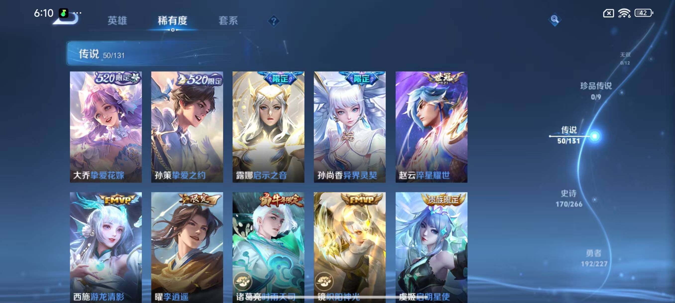 【传说皮肤】:后羿神树通天,元歌诡秘之主,司空震愿照山河定,女娲愿照千秋盛,妲己愿照众生和,澜愿照九州拓,虞姬愿照岁时盈,云缨幻光神枪,桑启鸣野蒿,铠冥王哈迪斯,朵莉亚心动手记,云中君群星魔术团,墨子黄金天蝎座,澜逐花归海,艾琳觅芳踪,孙悟空齐天大圣,小乔山海琳琅生,曜山海苍雷引,李信山海炽霜斩,狄仁杰神器狴犴令,大乔挚爱花嫁,孙策挚爱之约,露娜启示之音,孙尚香异界灵契,赵云淬星耀世,西施游龙清影,曜李逍遥 ,诸葛亮时雨天司,镜炽阳神光,虞姬启明星使,孙悟空零号赤焰,关羽武圣,曜云鹰飞将,李信一念神魔,刘备时之恋人,伽罗太华,虞姬云霓雀翎,达摩黄金狮子座,百里玄策白虎志,后羿黄金射手座,杨戬永曜之星,诸葛亮武陵仙君,貂蝉仲夏夜之梦,李白凤求凰,孙尚香末日机甲,宫本武藏地狱之眼,孙悟空地狱火,吕布天魔缭乱,武则天海洋之心,狄仁杰超时空战士