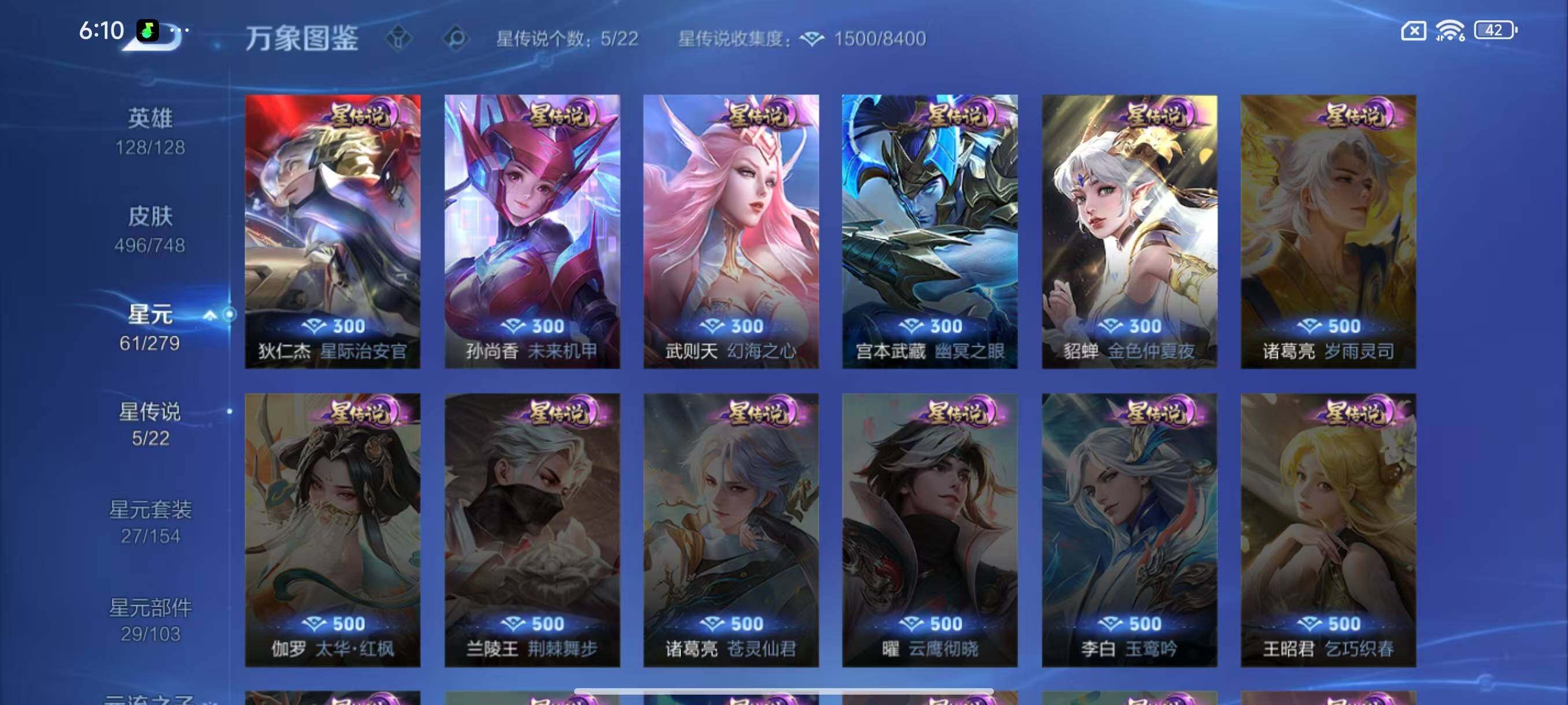 亚瑟狮心王,庄周蜃楼王,孙膑妖精王,扁鹊炼金王,虞姬凯尔特女王,白起狰,太乙真人饕餮,曹操烛龙,芈月重明,典韦穷奇,狂铁御狮,米莱狄御霄,牛魔御旌,盾山御銮,夏侯惇朔风刀,明世隐疑决卦,老夫子醍醐杖,鬼谷子原初探秘者,狄仁杰万华元夜,程咬金演武夺筹,钟馗驱傩正仪,苏烈千军破阵,吕布猎兽之王,嬴政白昼王子,女娲朔望之晖,典韦蓝屏警告,钟馗神迹守卫,鲁班七号狮舞东方,沈梦溪星空之诺,李元芳银河之约,刘邦夺宝奇兵,马可波罗暗影游猎,蒙犽狂想玩偶喵,元歌云间偶戏,弈星混沌棋,达摩沙漠行僧,兰陵王金庭之子,沈梦溪大漠名商,李元芳云中旅人,桑启海盐诗旅,裴擒虎擒涛扼浪,鲁班大师探海日志,张良古海寻踪,项羽苍威无极,镜青焰无极