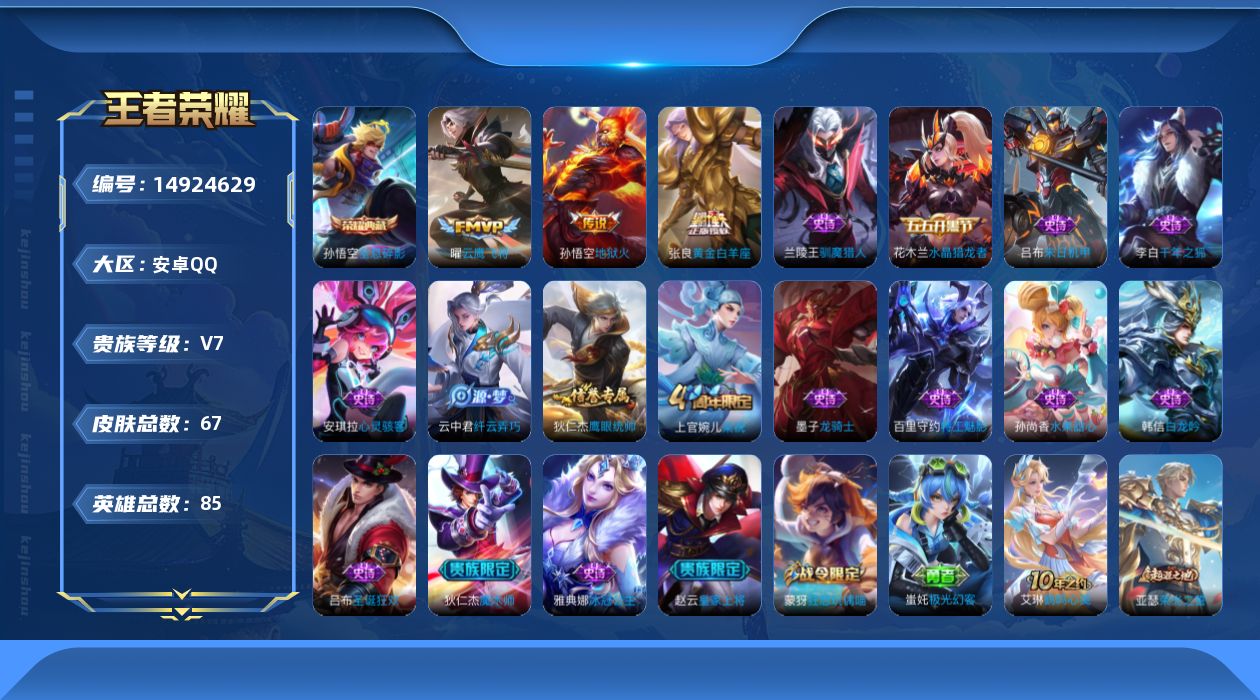 [14924629]安卓Q-V7-至尊星耀IV段位-85英雄-67皮肤-1典藏皮肤-4传说-17史诗