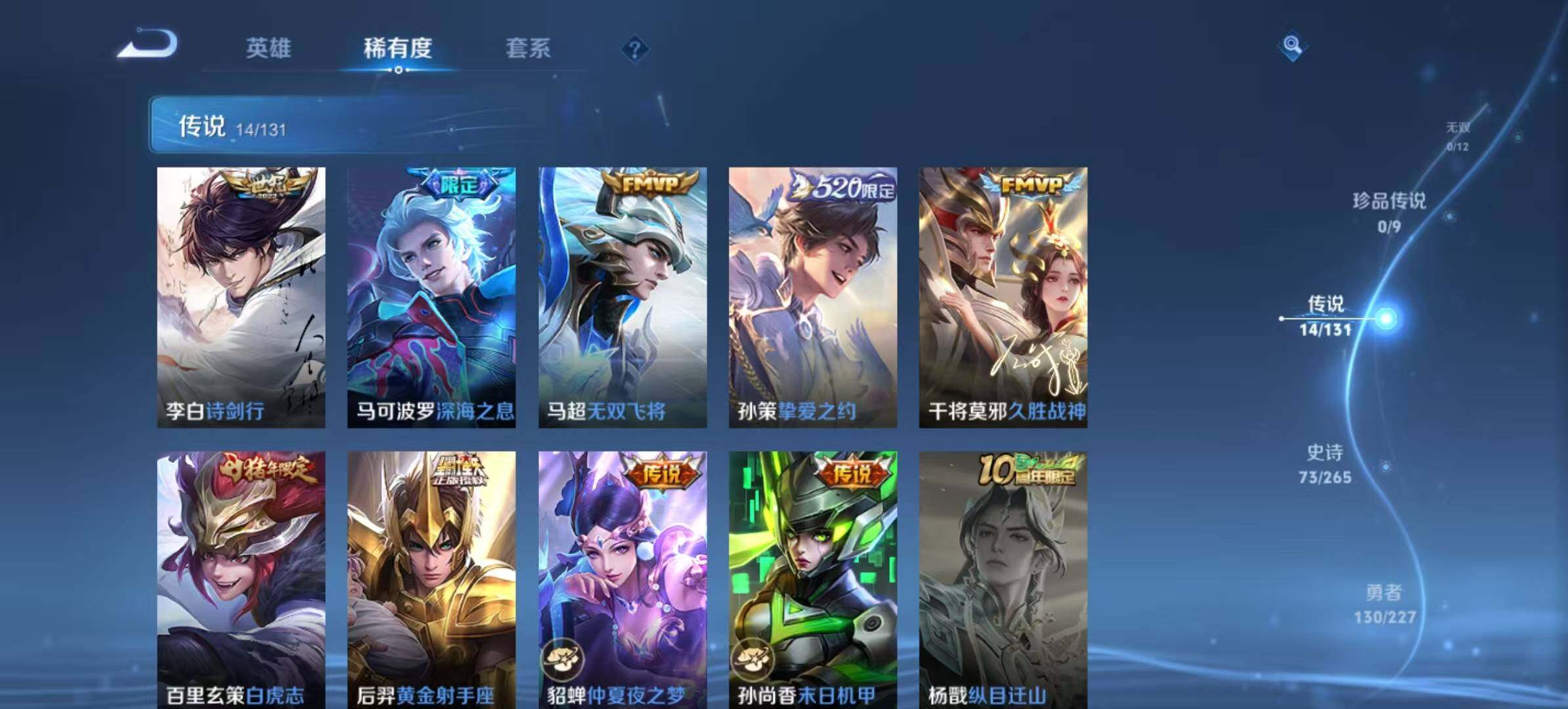 【传说皮肤】:后羿神树通天,桑启鸣野蒿,典韦战鼓燎原,孙悟空齐天大圣,李信山海炽霜斩,李白诗剑行,马可波罗深海之息,马超无双飞将,孙策挚爱之约,干将莫邪久胜战神,百里玄策白虎志,后羿黄金射手座,貂蝉仲夏夜之梦,孙尚香末日机甲